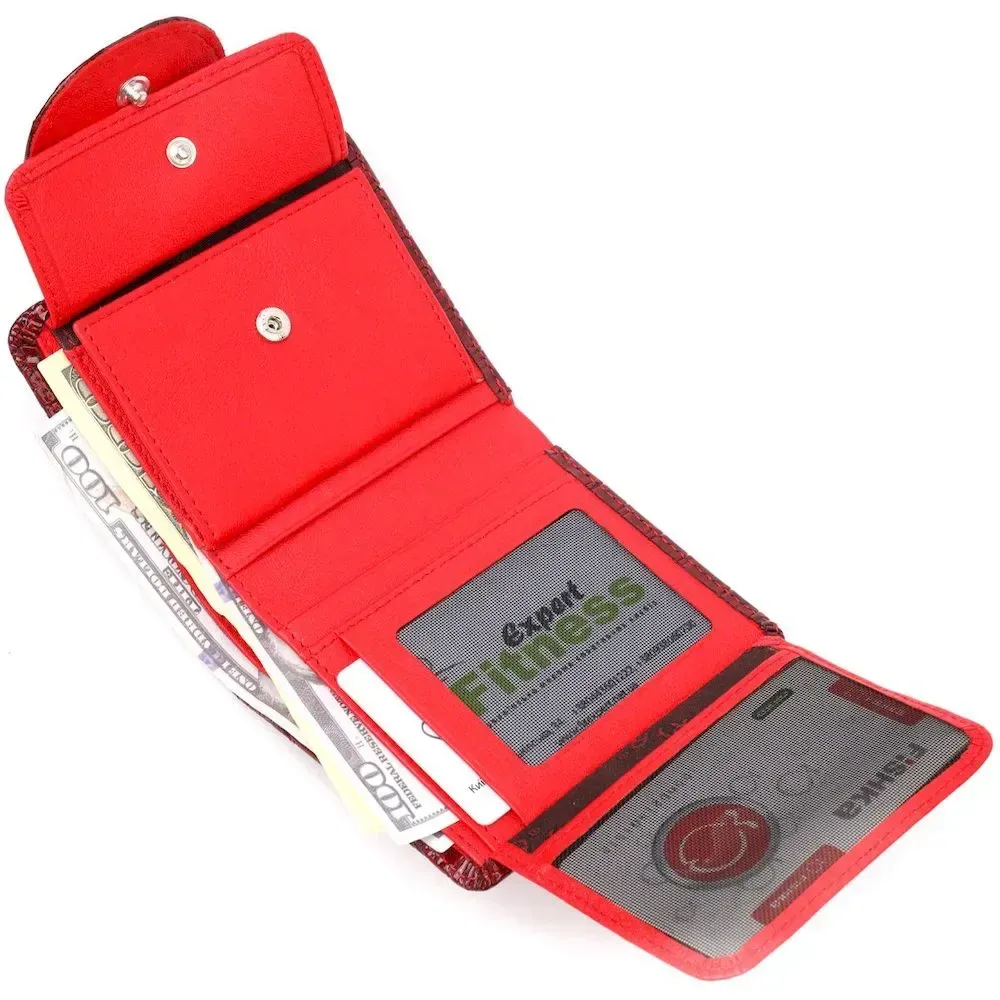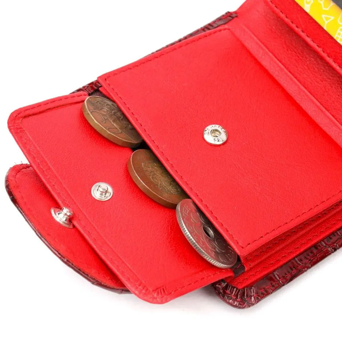 Яскравий жіночий гаманець з натуральної шкіри з тисненням під крокодила зовні та в гладкій натуральній шкірі всередині. Складається аксесуар навпіл, закривається клапаном на кнопку. Якісна фурнітура доповнює та прикрашає виріб. Такий гаманець з натуральної шкіри - це ідеальний варіант на кожен день для тих, хто цінує якість, зручність та комфорт, а також чудово доповнюватиме Ваш повсякденний образ. Запакований аксесуар у фірмову коробку та пакет бренду. Вироби з натуральної шкіри завжди будуть чудовим подарунком для близької людини.
