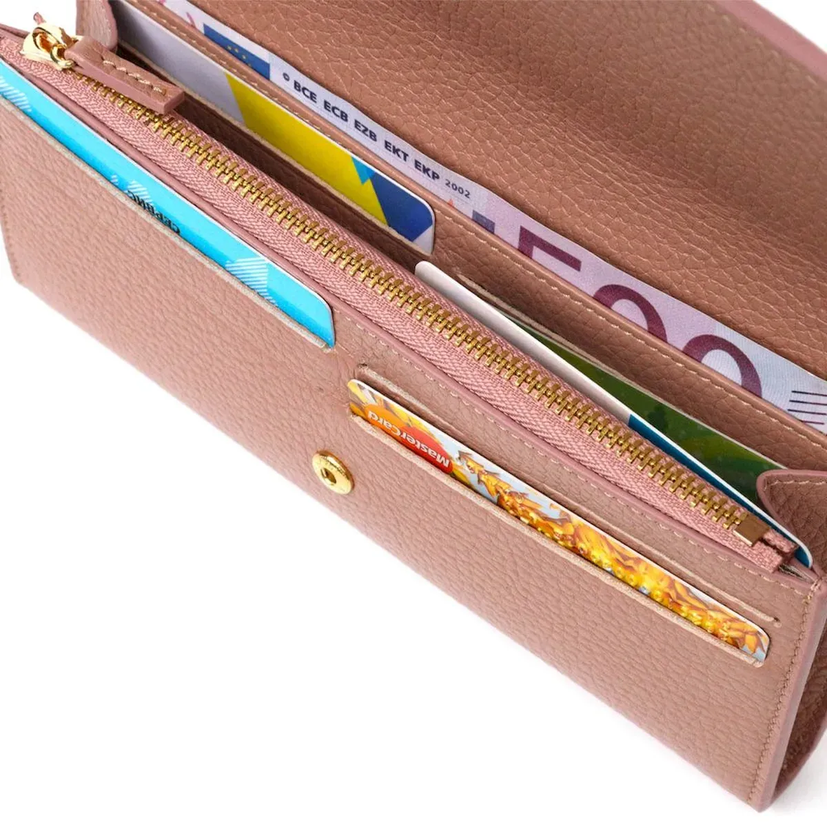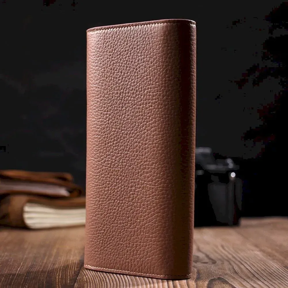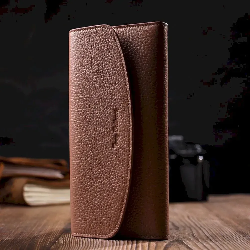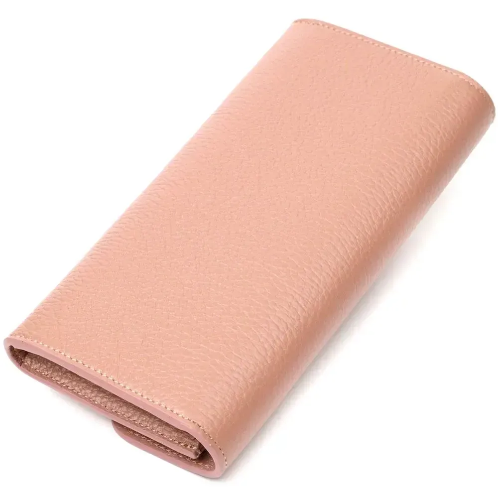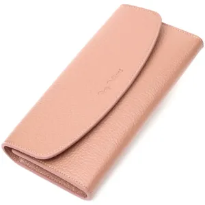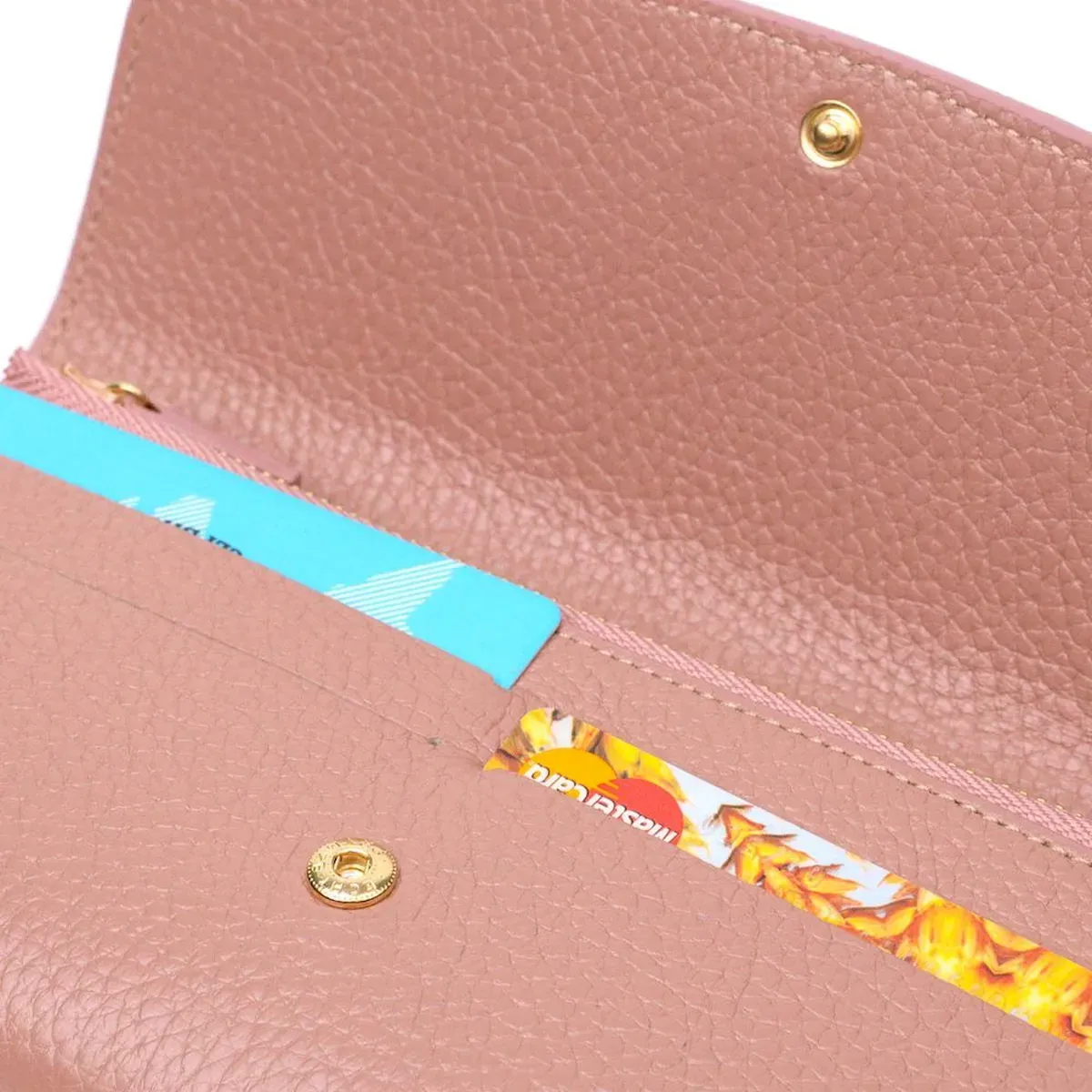 Стильний жіночий гаманець з натуральної шкіри флотар, для якої характерна міцність, зносостійкість та зерниста фактура. Аксесуар складається з одного широкого відділення для купюр, дванадцяти осередків для пластикових карток, однієї прилеглої кишені та монетниці на блискавці. У виробі використано якісну фурнітуру золотистого кольору. Закривається гаманець клапаном на кнопку. Купуючи цей шкіряний гаманець, Ви не тільки набуваєте стильної речі, але й отримуєте якісний аксесуар, який прослужить не один рік.