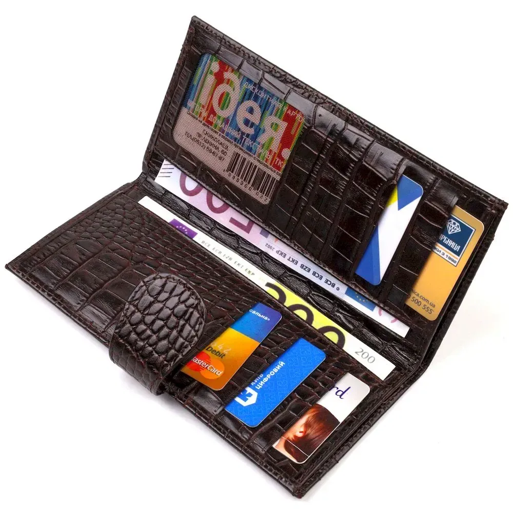 Практичний чоловічий гаманець з натуральної фактурної шкіри з тисненням під крокодила. Аксесуар має одне основне вертикальне відділення для купюр усіх номіналів, одинадцять осередків для карток, кишеню під сіточкою для пропуску, п'ять прилеглих кишень та монетницю. Закривається аксесуар навпіл хлястиком на кнопку. Купуючи шкіряний аксесуар цієї фірми, собі або на подарунок, будьте певні, що він прослужить Вам не один рік.