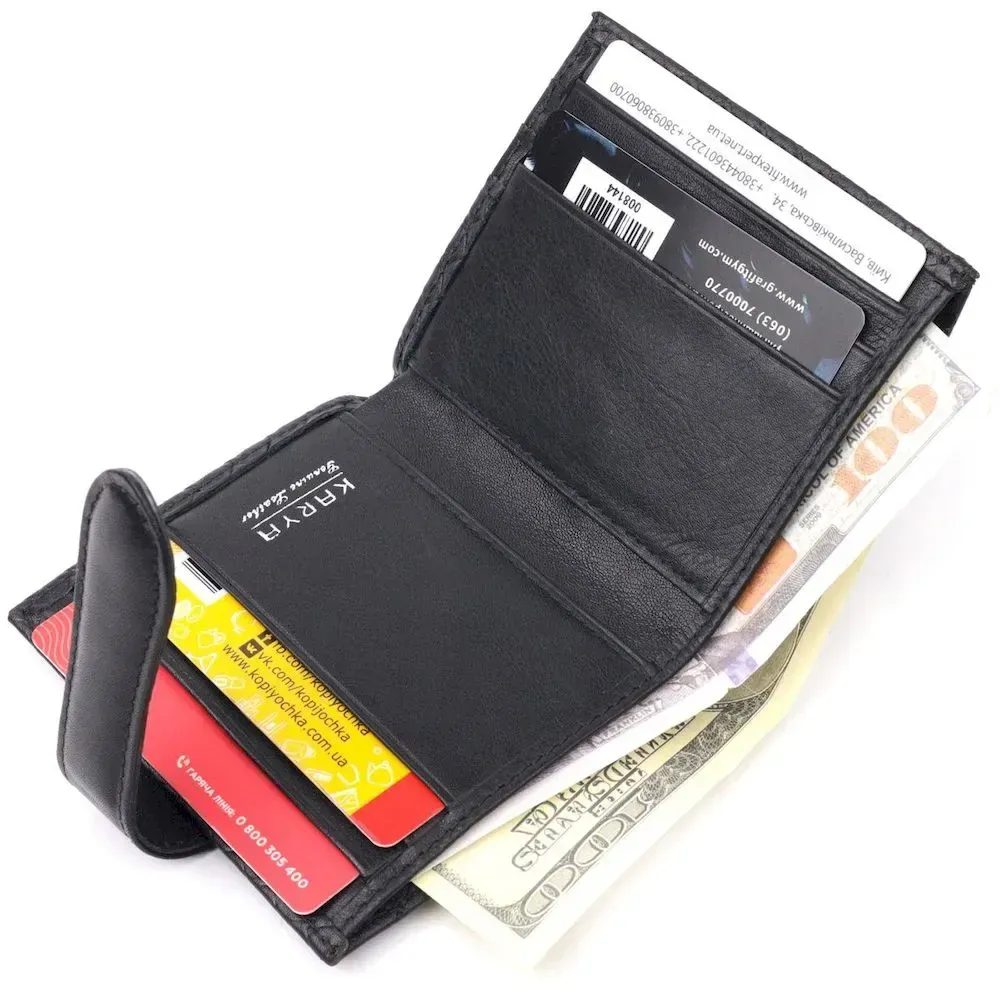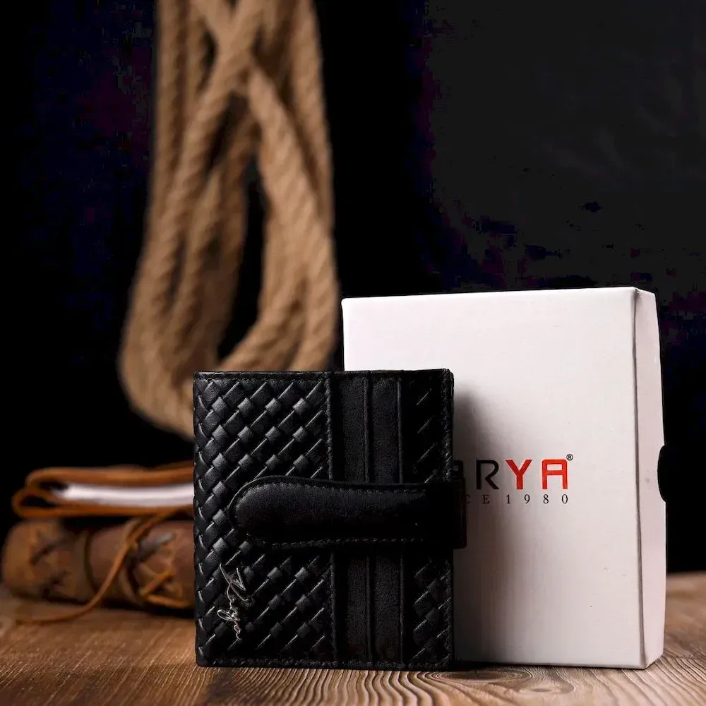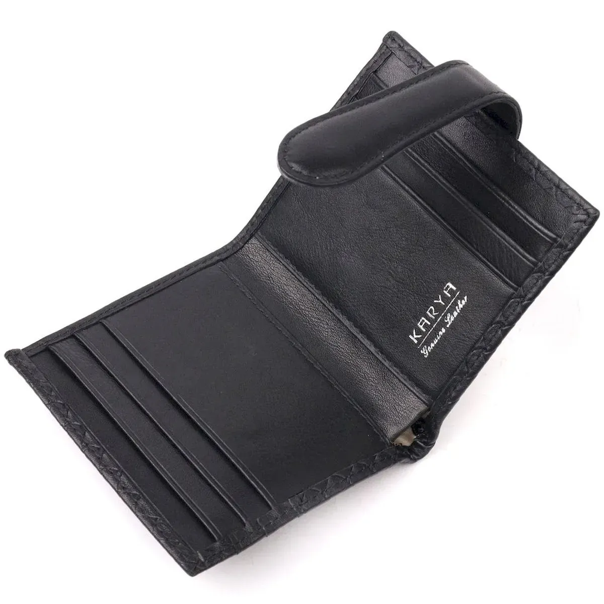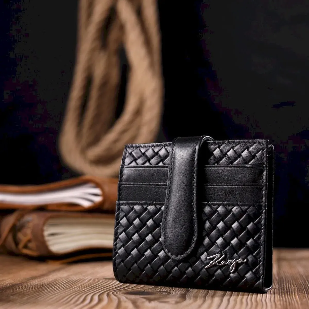 Практичний жіночий гаманець з натуральної шкіри - класичної гладкої та шкіри з палітурками, виріб виконано в класичному чорному кольорі. Усередині є відділення для купюр та осередки для кредитних карток. У виробі використано якісну фурнітуру, а також міцну фірмову підкладку. Невеликий шкіряний гаманець поміститься навіть у найменшу сумочку. Модель закривається на шкіряний хлястик з кнопкою. Такий гаманець, однозначно, порадує будь-яку жінку.