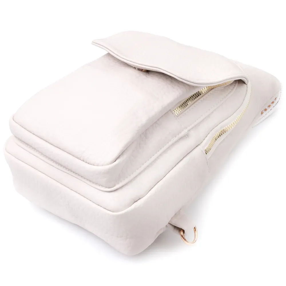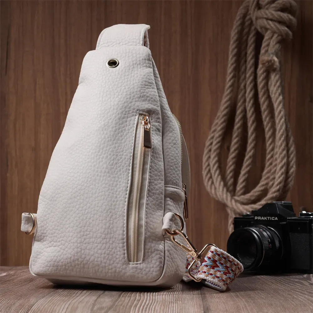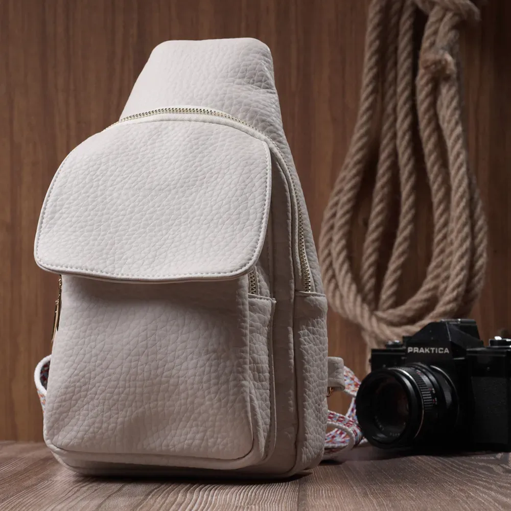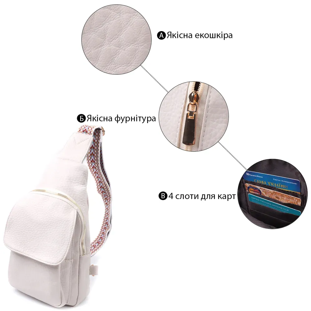 Топова слінг сумка для жінок із зернистої екошкіри в стильному молочному кольорі. Ця модель складається з одного основного відділення, яке закривається на блискавку і в якому знаходиться кишеня на блискавці і чотири кишені для кредитних карток усередині, а також двох кишень зовні та одного отвору для кабелю або навушників, що дуже зручно в сучасному світі. Акцентом даної моделі є зручний регульований плечовий ремінець у етнічному стилі, що дуже модно вже кілька сезонів. Екошкіра - високоякісна альтернатива натуральному матеріалу, яка дуже стійка до тертя, до низьких температур, відмінно носиться на відміну від інших штучних матеріалів, а також має гіпоалергенний склад на відміну від натуральної шкіри.