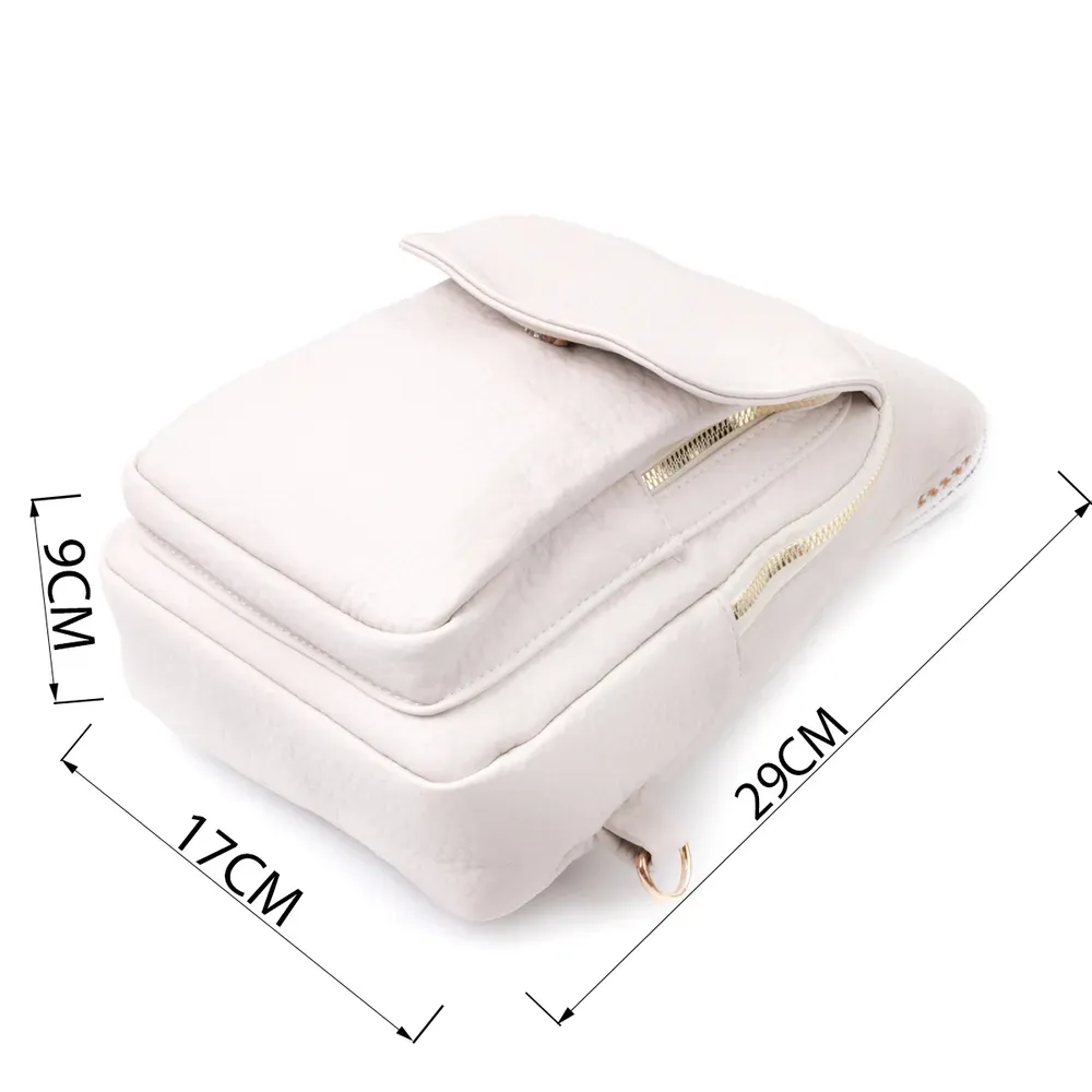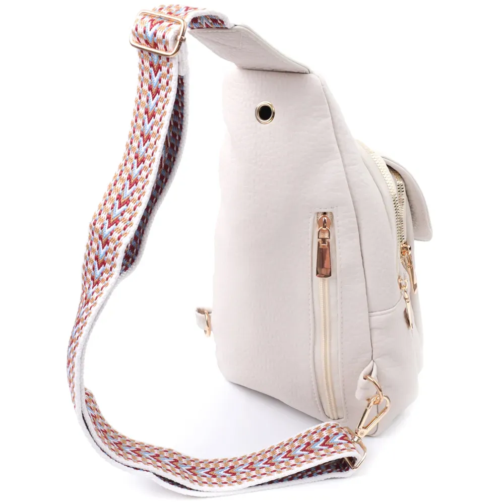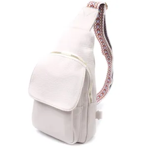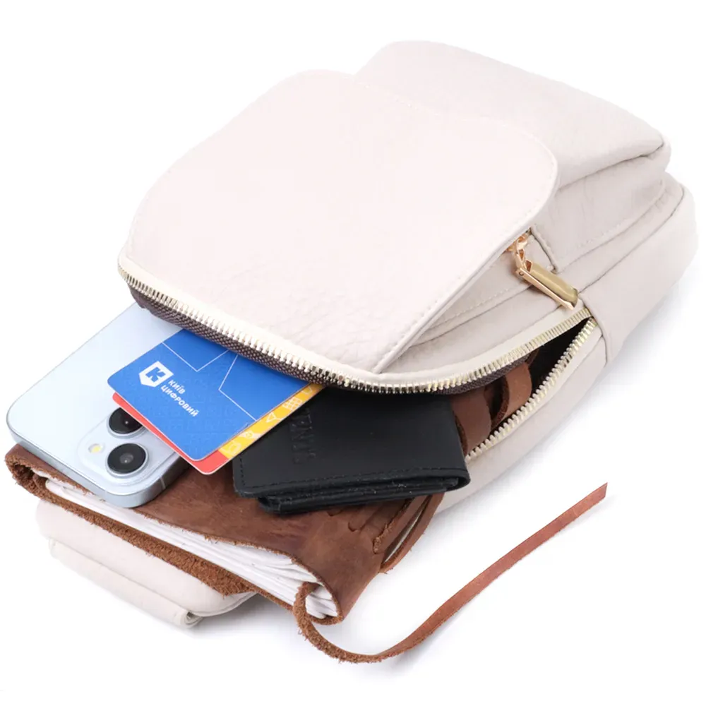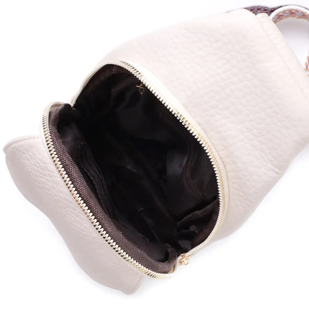 Топова слінг сумка для жінок із зернистої екошкіри в стильному молочному кольорі. Ця модель складається з одного основного відділення, яке закривається на блискавку і в якому знаходиться кишеня на блискавці і чотири кишені для кредитних карток усередині, а також двох кишень зовні та одного отвору для кабелю або навушників, що дуже зручно в сучасному світі. Акцентом даної моделі є зручний регульований плечовий ремінець у етнічному стилі, що дуже модно вже кілька сезонів. Екошкіра - високоякісна альтернатива натуральному матеріалу, яка дуже стійка до тертя, до низьких температур, відмінно носиться на відміну від інших штучних матеріалів, а також має гіпоалергенний склад на відміну від натуральної шкіри.