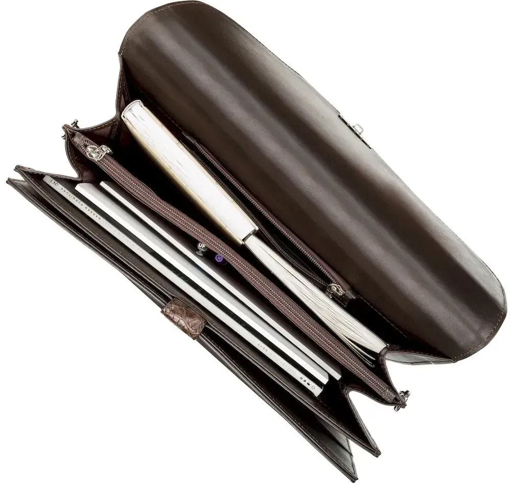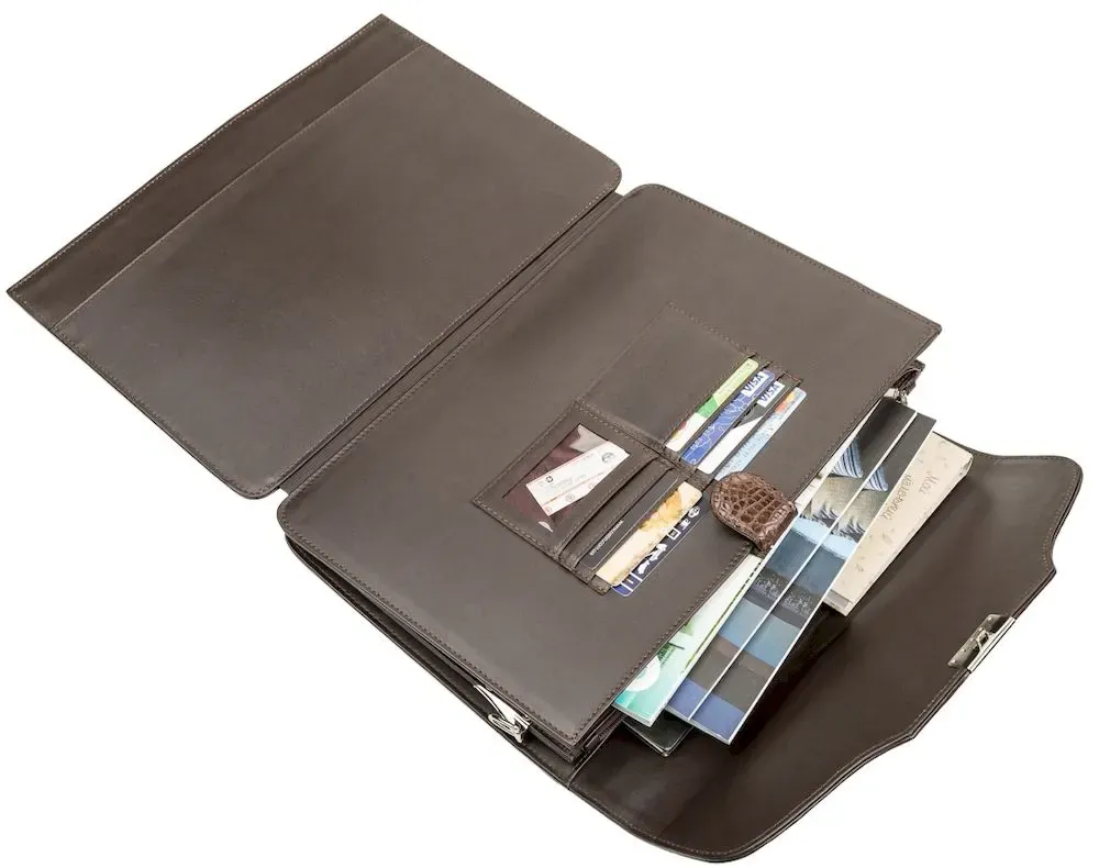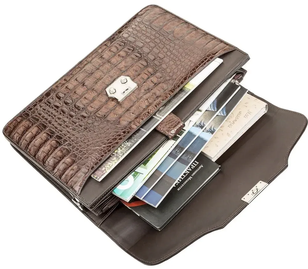 /> - закривається клапаном на надійний кодовий замок. Багатофункціональний коричневий портфель з натуральної шкіри крокодила, на клапані якої розташована фактурна потилична частина шкіри крокодила, а на зворотному боці частина фактурна. . Кожен виріб з цього матеріалу має свою незвичайну структуру і неповторний візерунок. В аксесуарі використана виключно якісна фурнітура, срібний колір. Вироби зі шкіри крокодила завжди вважалися великою розкішшю, оскільки у світі не так багато компаній, які займаються виробленням такої шкіри, оскільки цей процес дійсно надзвичайно трудомісткий.