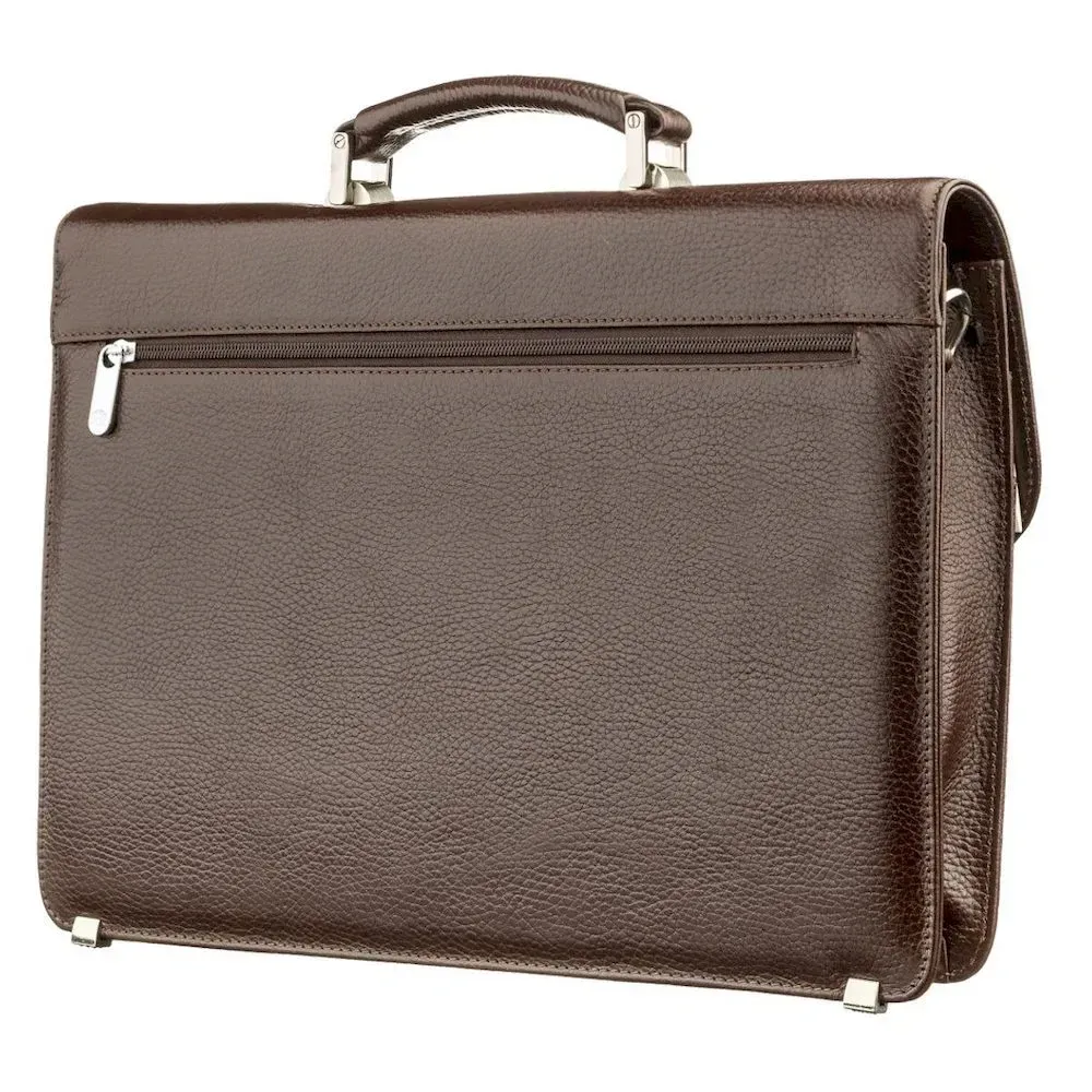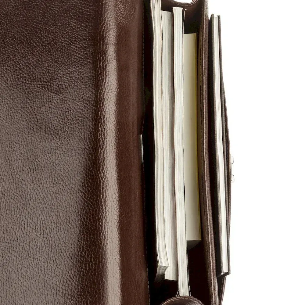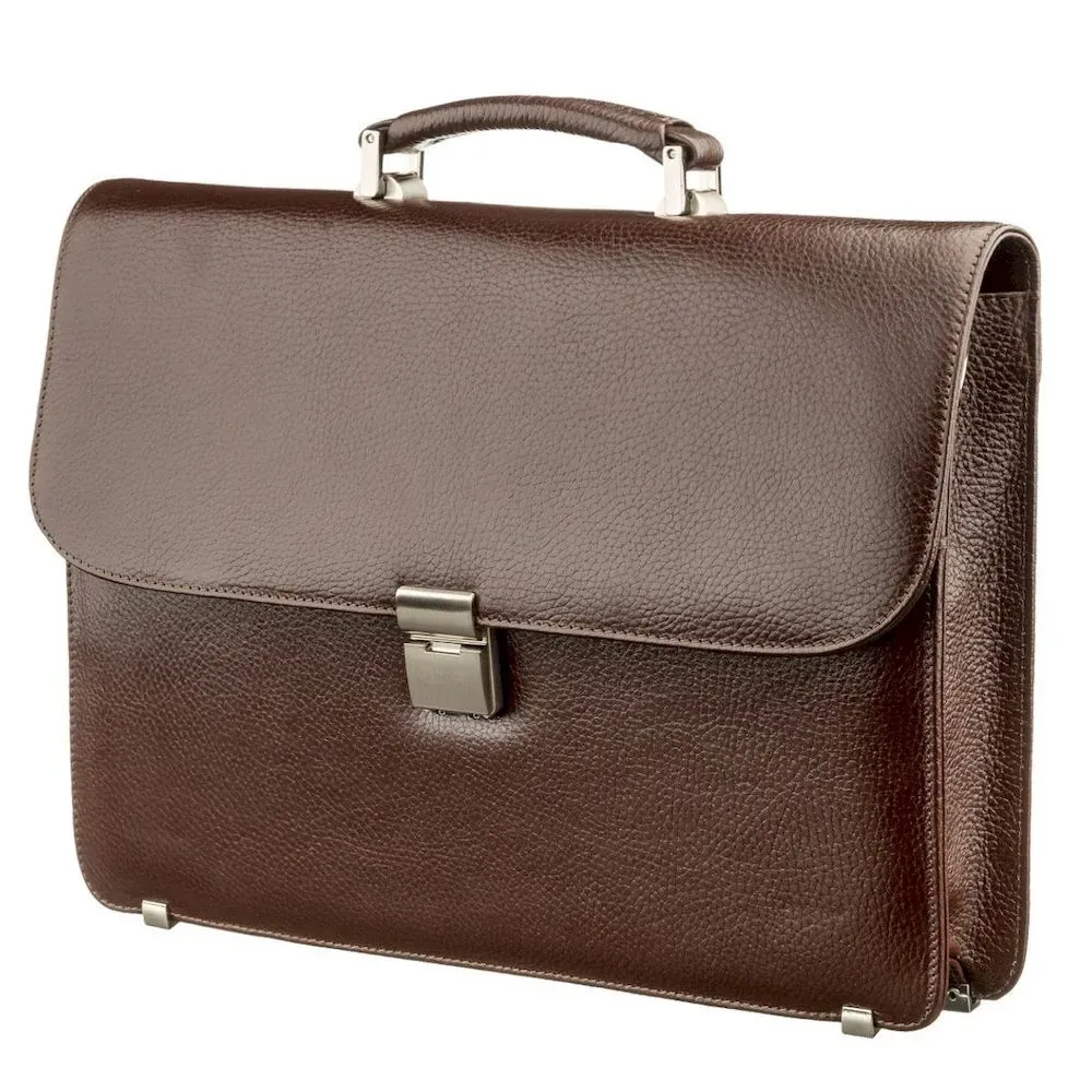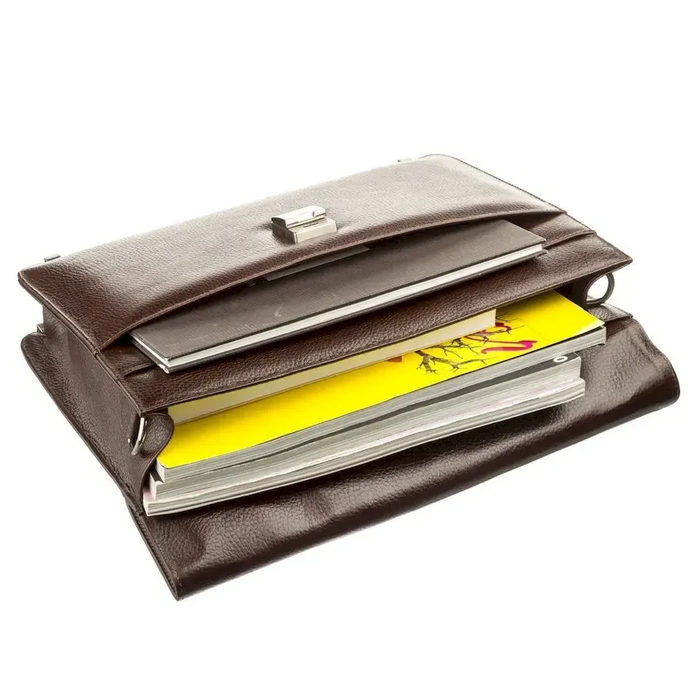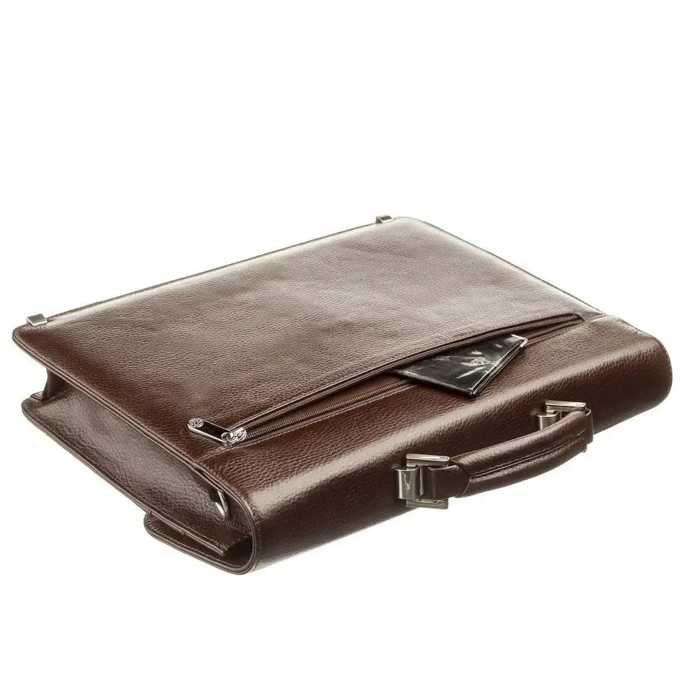 Суворий чоловічий портфель виготовлений з товстої та якісної шкіри флотар. Буде знахідкою для ділових чоловіків, які мають багато важливих паперів, документів і ноутбук. Аксесуар зручно сидить у руці, має ручку, що знімається, і може носитися на плечі. Застебнувши портфель на кодовий замок, ви можете бути впевнені, що всі ваші речі у безпеці. Зручно брати із собою в дорогу чи на роботу. Фурнітура в аксесуарі виготовлена з якісного металу і довго носиться. Внизу виробу є металеві ручки проти зношування виробу. Коричневий колір аксесуара підкреслить вашу індивідуальність та почуття стилю. Може бути ідеальним подарунком для будь-якого чоловіка, який любить дорогі та розкішні речі. У комплекті йде фірмовий мішок для зберігання виробу.