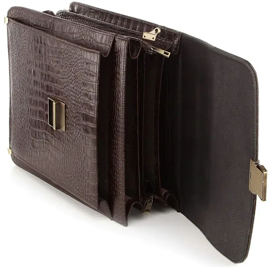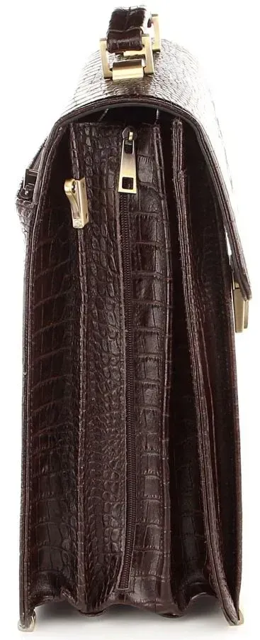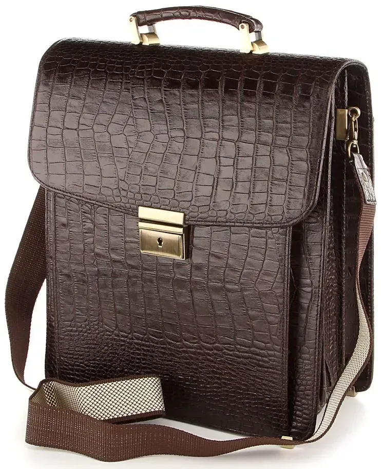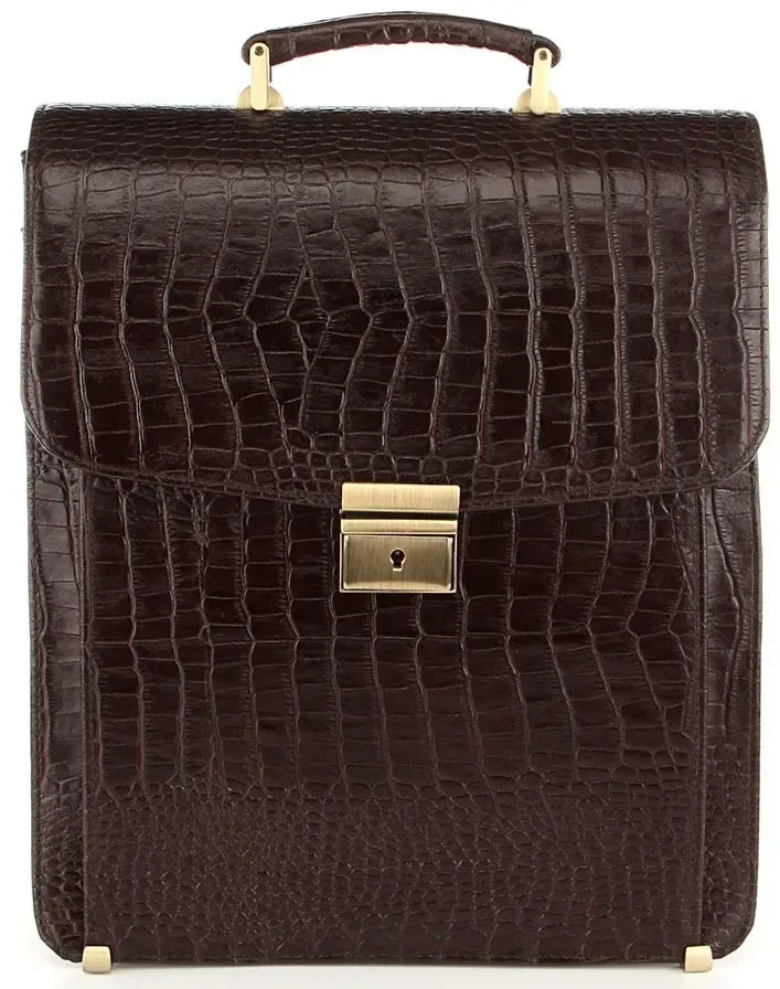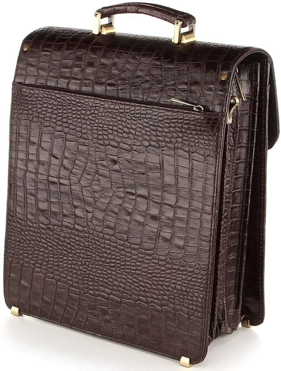 Большой элитный кожаный портфель вертикального формата. Изделие изготовлено из натуральной кожи, которая имеет тиснение под крокодила. Фурнитура на изделии имеет желтый цвет.