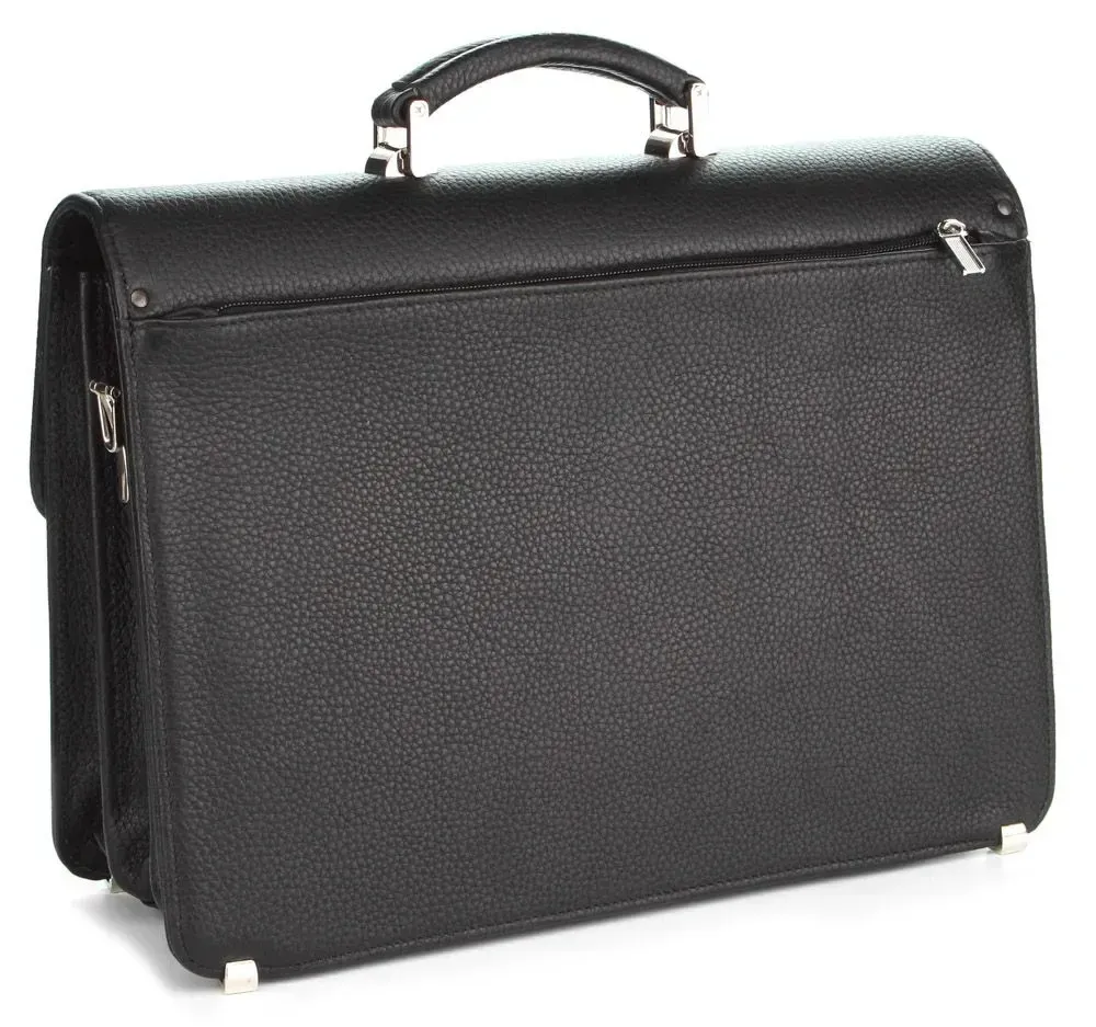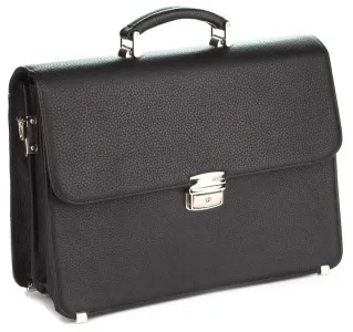 Эксклюзивный, сверхпрочный мужской портфель. Аксессуар выполнен из натуральной «зернистой» кожи черного цвета. Цвет фурнитуры: серебро. Носить портфель можно в руке, а также через плечо при помощи отстегиваемого плечевого ремня. Металлические ножки на дне изделия защищают его от повреждения. Портфель упакован в текстильный пылезащитный чехол черного цвета.