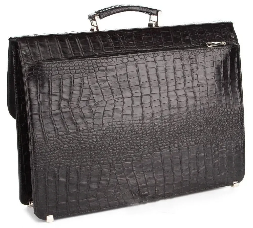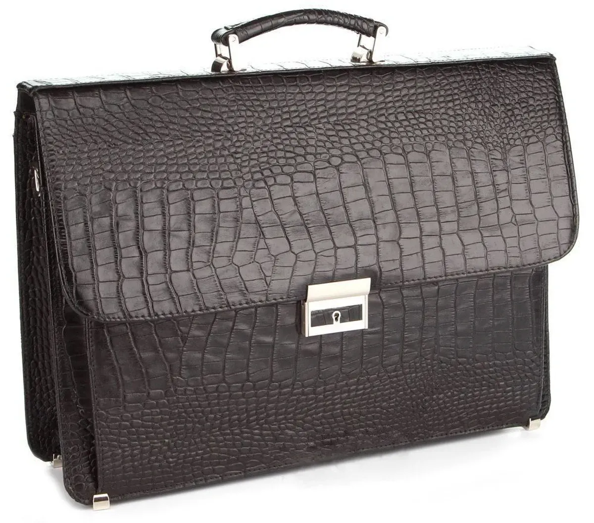 Большой, вместительный мужской портфель высокого качества. Аксессуар выполнен из натуральной кожи с фактурой под крокодила, изделия из которой чрезвычайно популярны. Цвет фурнитуры: серебро. Портфель можно носить в руке при помощи удобной кожаной ручки, а также через плечо (в комплекте съемный плечевой ремень). Аксессуар упакован в текстильный пылезащитный мешочек черного цвета.