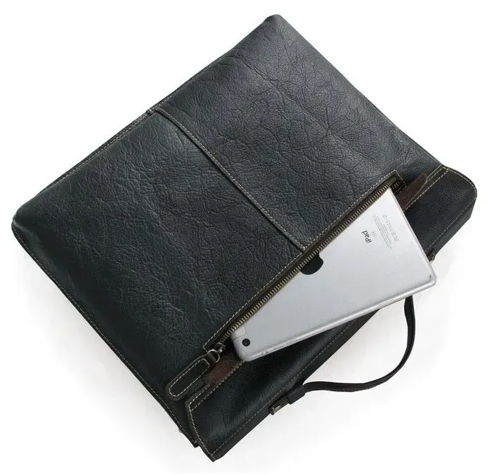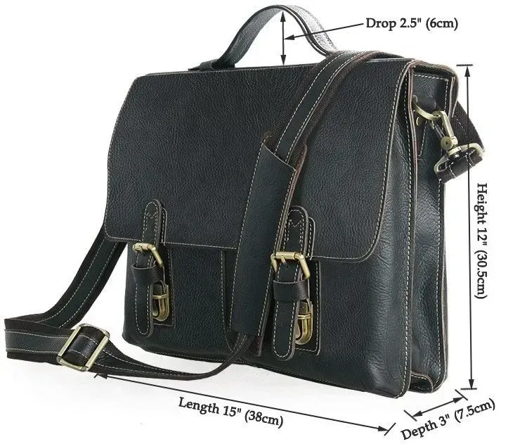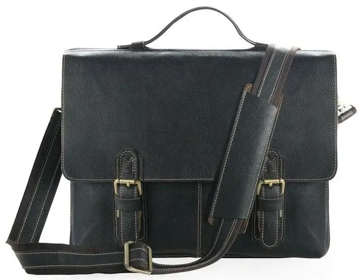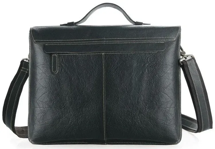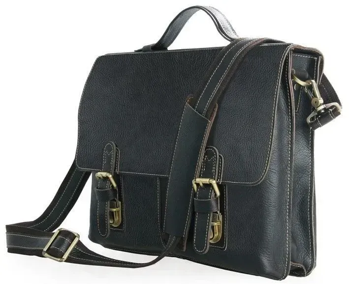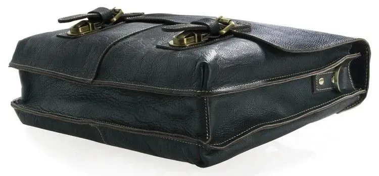 Розміри: 38 на 30.5 на 7.5 см.</ Чудовий чоловічий портфель з натуральної високоякісної вінтажної шкіри. Аксесуар надійно прошитий міцною ниткою білого кольору, яка надає родзинці даному виробу. Колір фурнітури: латунь. На задній зовнішній стороні розташоване відділення на блискавці. Портфель закривається клапаном на двох клямках. Підкладка виконана з міцного текстильного матеріалу чорного кольору.