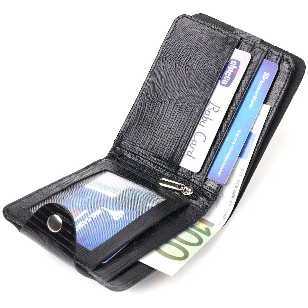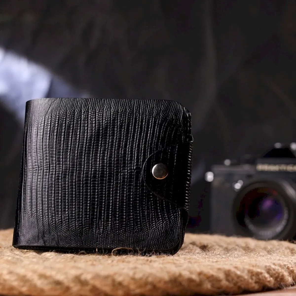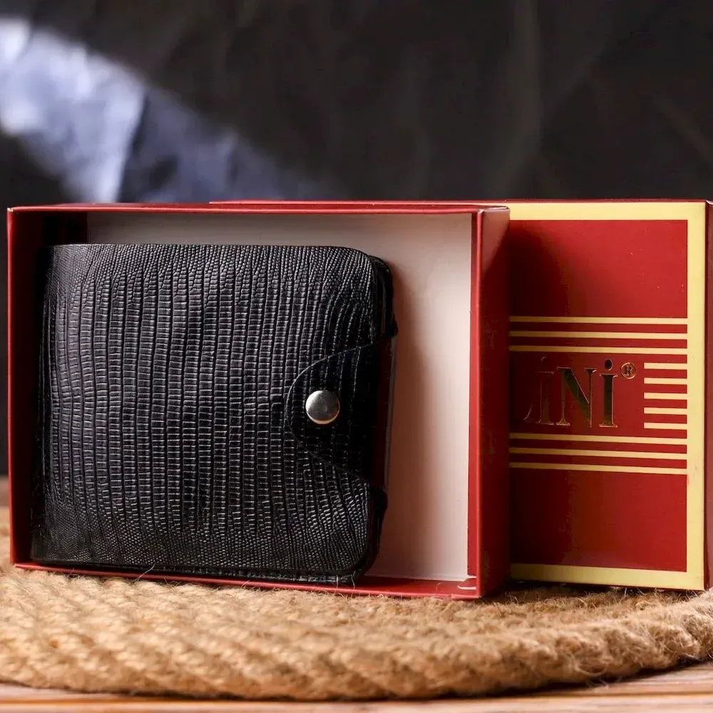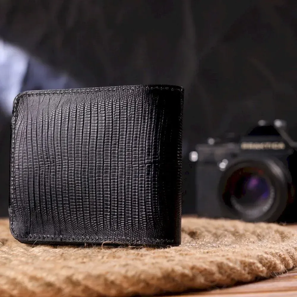 Чудовий чоловічий гаманець з натуральної фактурної шкіри з тисненням під рептилію. Аксесуар має одне відділення для купюр, в яке розміщуються купюри всіх номіналів, чотири прилеглі кишені, кишеня на блискавці, на всю довжину гаманця, а також вісім відсіків для карток, один з них під сіточкою. Модель закривається хлястиком на кнопку. У сучасному світі шкіряне портмоне є просто необхідною річчю, а якісне шкіряне портмоне є ще й непоганим вкладенням грошей, оскільки прослужить не один рік.