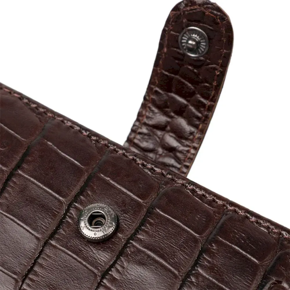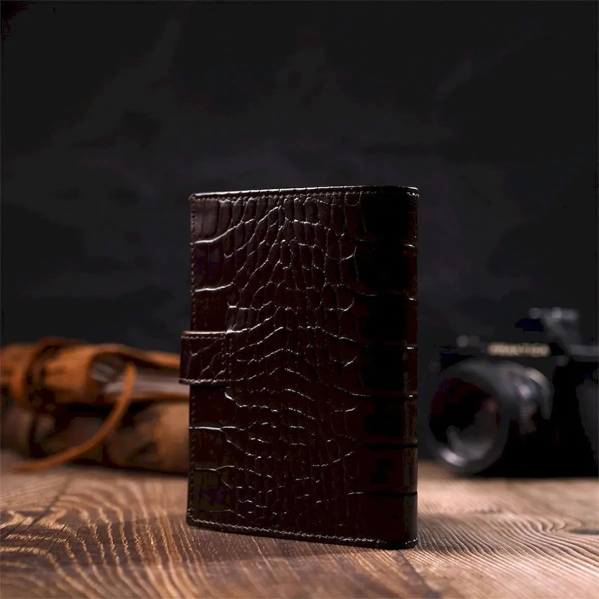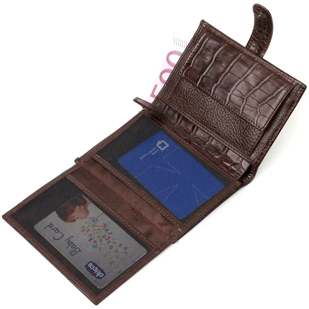 Модний гаманець для купюр виконаний з добротної натуральної шкіри, з тиснення під крокодила. У цей аксесуар чудово поміщаються купюри всіх номіналів. Виріб складається з двох відділень для купюр, шести осередків для кредиток, трьох прихованих кишень, монетниці та чотирьох відділень під сіткою під документи. Закривається гаманець шкіряним хлястиком на кнопку. Вироби з натуральної шкіри завжди будуть чудовим подарунком для близької людини.