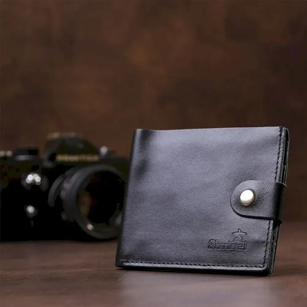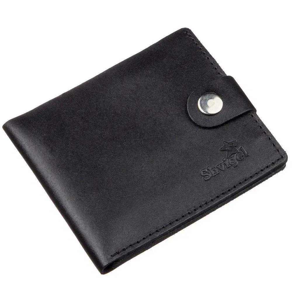 Шикарний чоловічий гаманець чорного кольору. Аксесуар виконаний із товстої, високоякісної шкіри. На лицьовій стороні виробу розташований тісний логотип компанії виробника SHVIGEL. Гаманець акуратно прошитий міцною ниткою. Усередині гаманця містке відкрите відділення для купюр та кілька слотів для карток. Закривається на шкіряний хлястик з кнопкою. Ця модель доступна в різному кольорі. Виробництво – Україна.