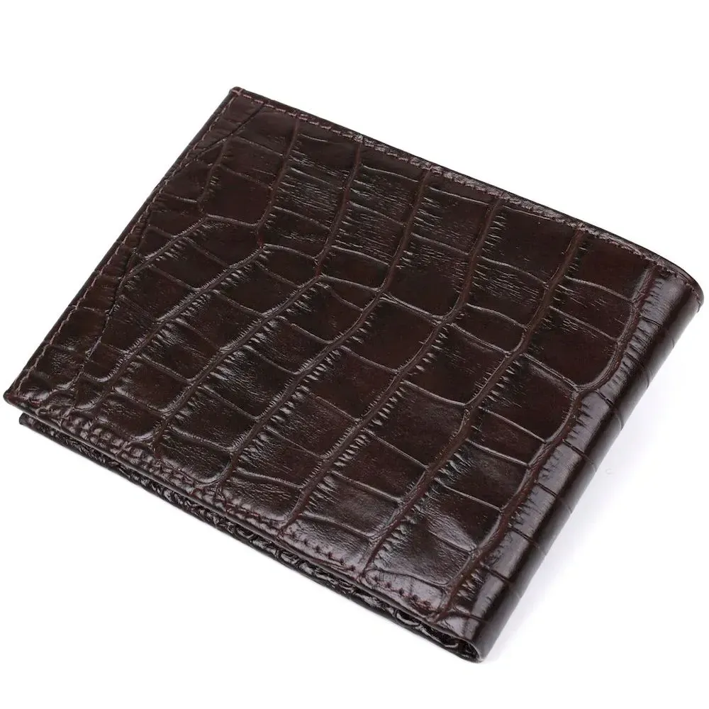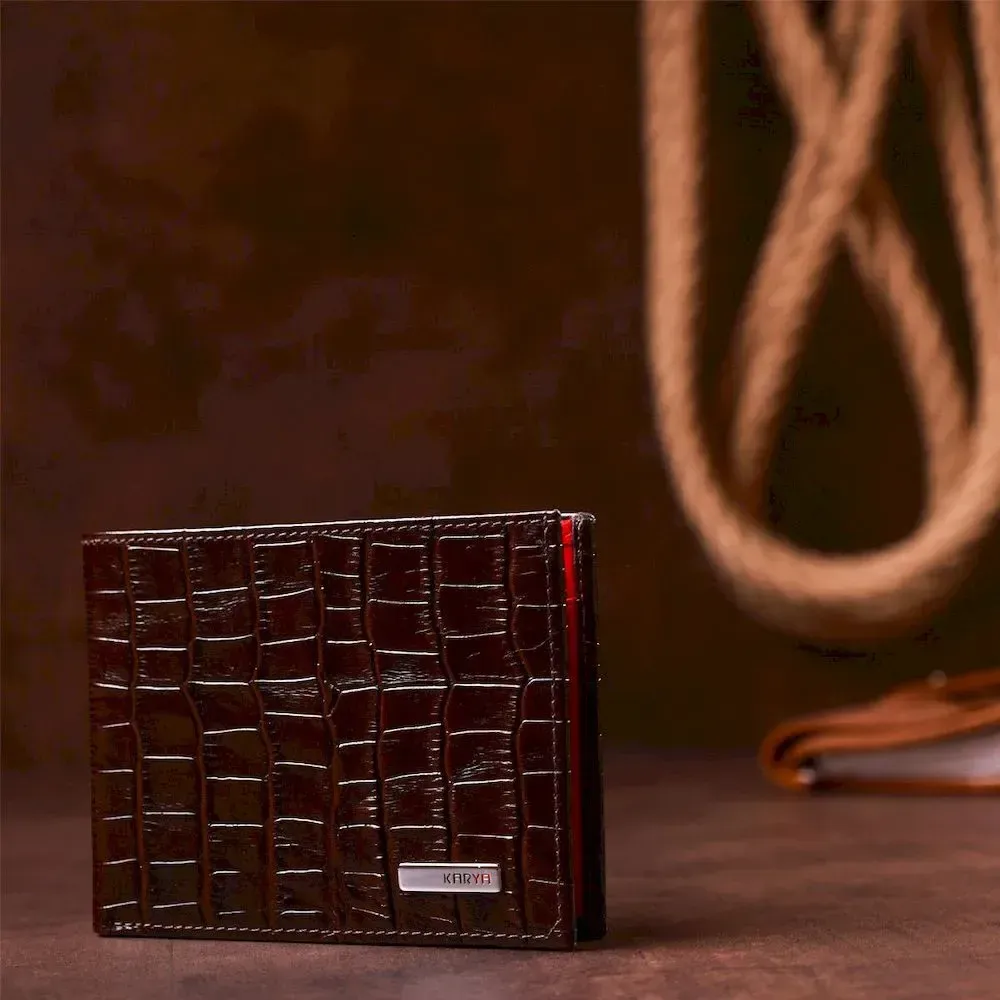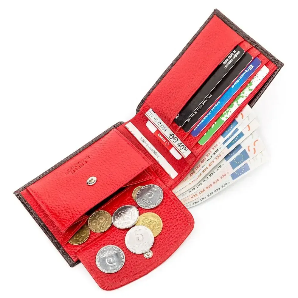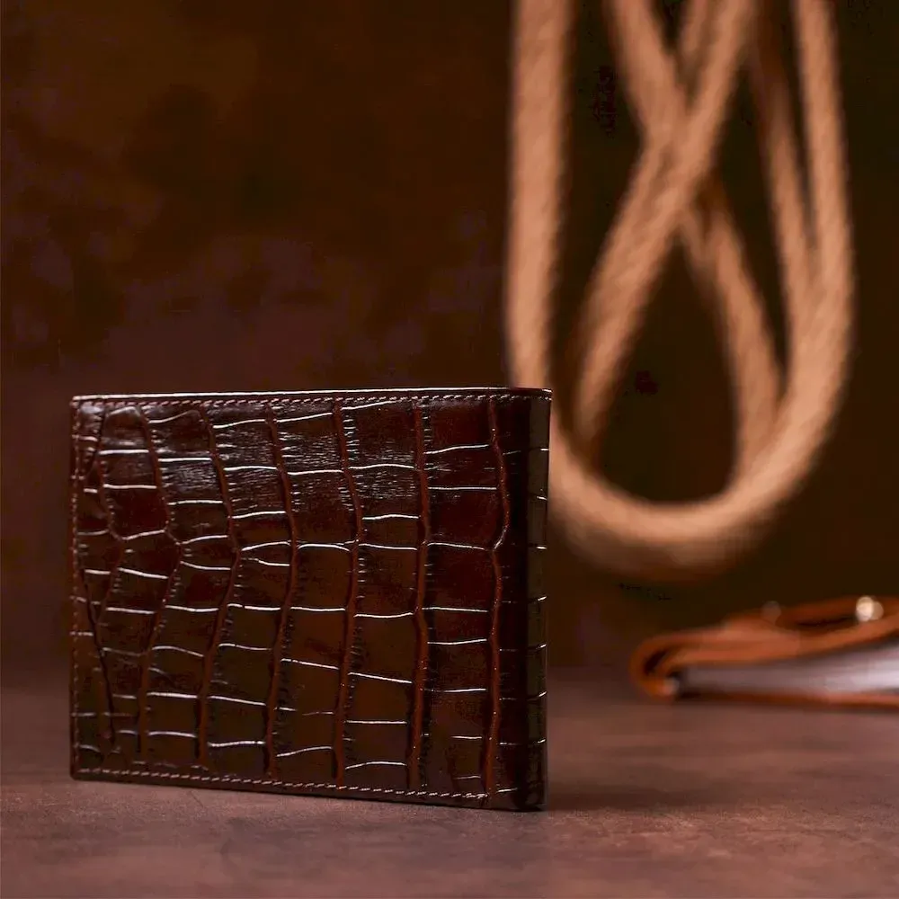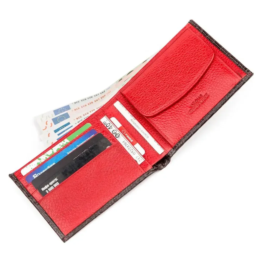 Коричневе чоловіче портмоне, з натуральної фактурної шкіри під рептилію. Дуже красивий та стильний аксесуар, який складається з поєднання двох кольорів шкіри: коричневої зовні та червоної всередині. Відмінно підійде як подарунок і не залишить байдужим жодного чоловіка.