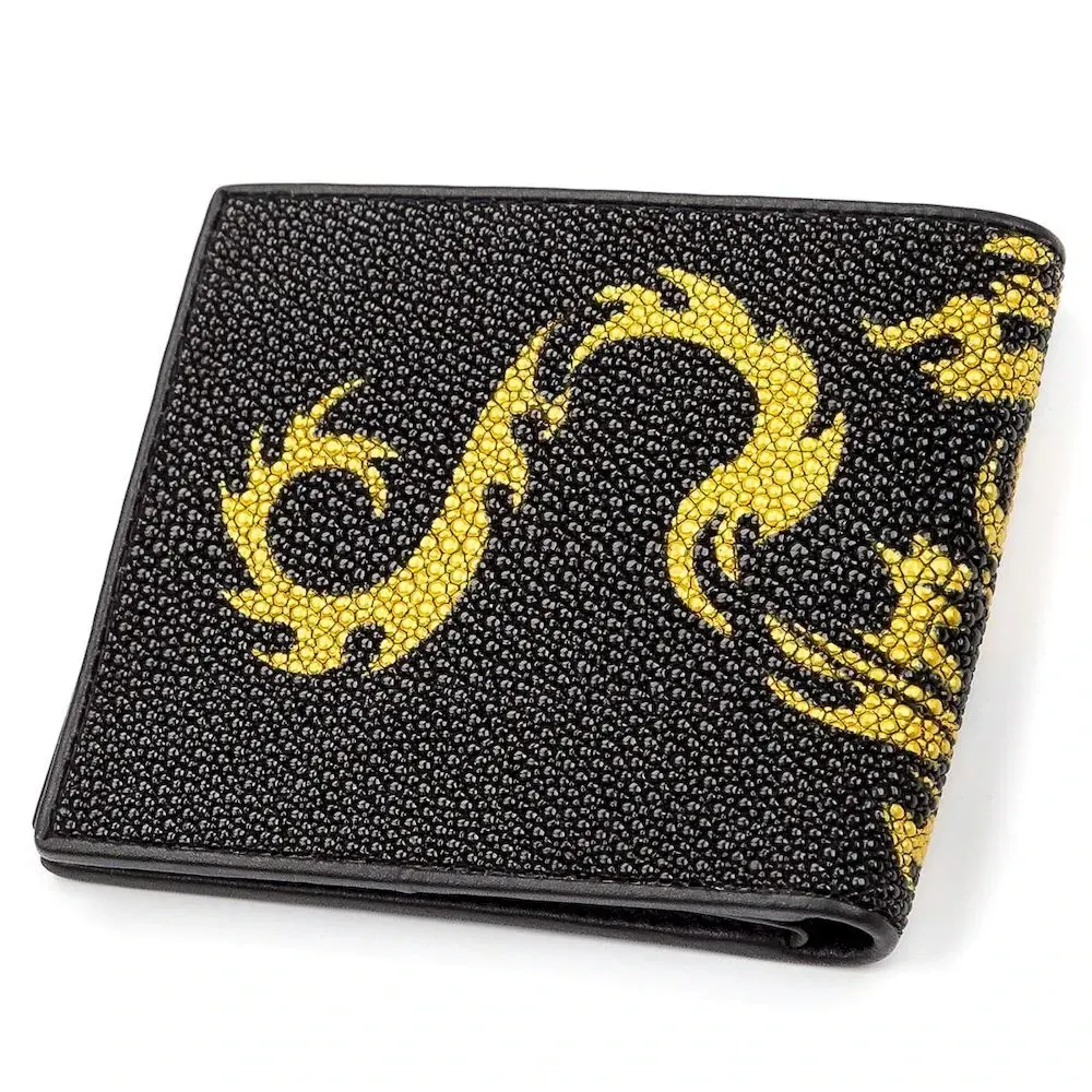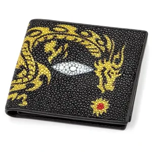 Неповторний гаманець з натуральної шкіри морського схилу, дуже стійкий до зношування, проколів, порізів, до розривів і навіть до вогню. Аксесуар обшитий гладкою натуральною шкірою під колір виробу. На лицьовій поверхні гаманця, через все полотно, у вигляді прикраси виробу розташований малюнок, жовтий дракон над жовто-червоним сонцем і біле вічко з більшими намистинами посередині. Гаманець відмінно лягає в руку, неймовірно функціональний і практичний у використанні, відмінно підкреслить стиль та статус свого власника.