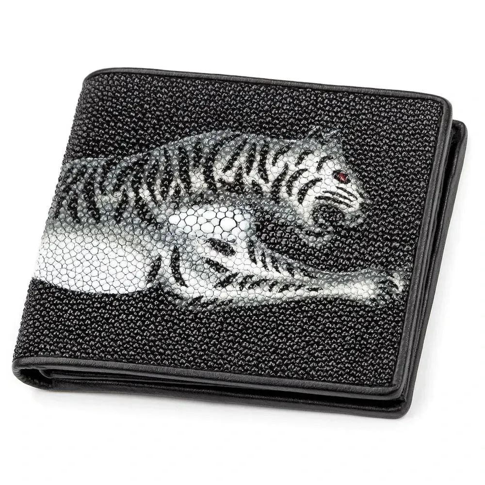 Шикарний гаманець з натуральної шкіри морського схилу, дуже стійкий до зношування, проколів, порізів, до розривів і навіть до вогню. Аксесуар обшитий гладкою натуральною шкірою під колір виробу. На лицьовій поверхні гаманця, через все полотно, у вигляді прикраси виробу розташований малюнок: “тигр у стрибку” з більшими намистинами посередині. Гаманець відмінно лягає в руку, неймовірно функціональний і практичний у використанні, відмінно підкреслить стиль та статус свого власника.