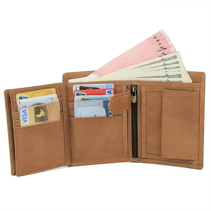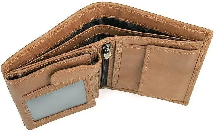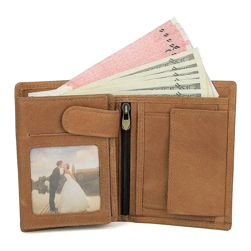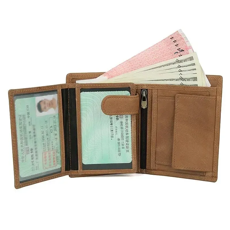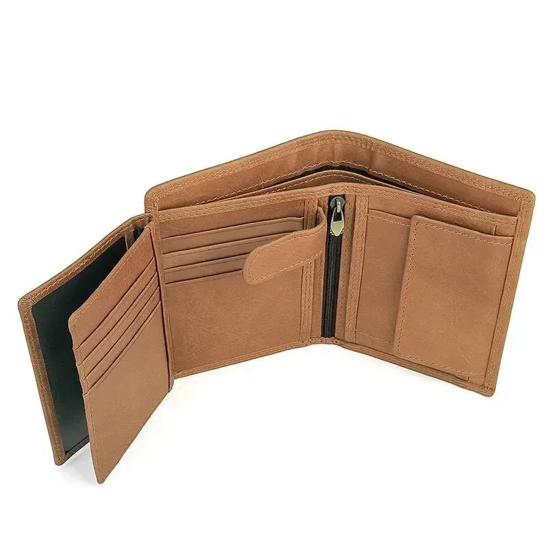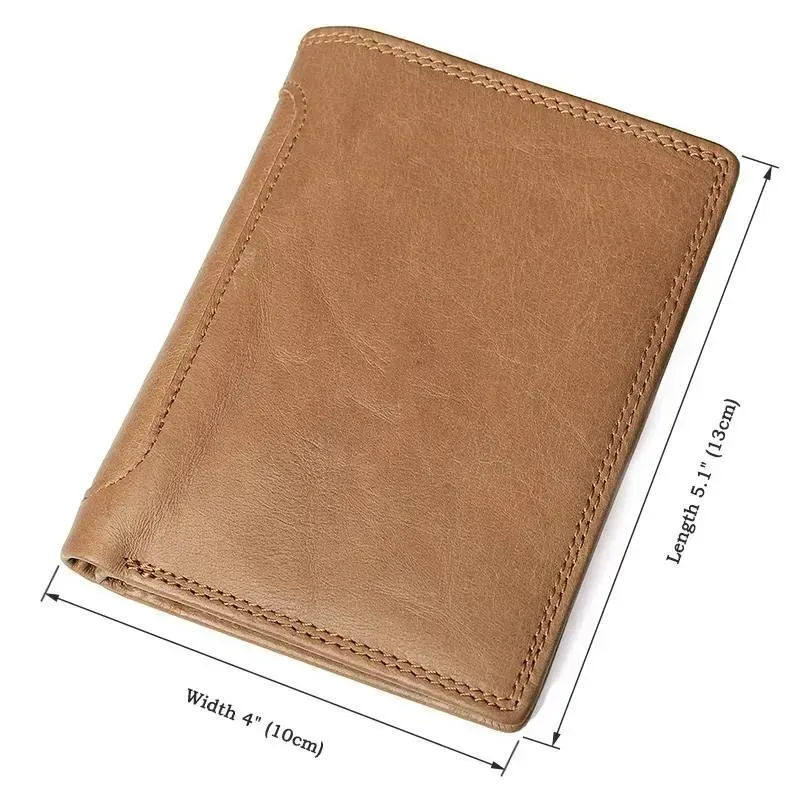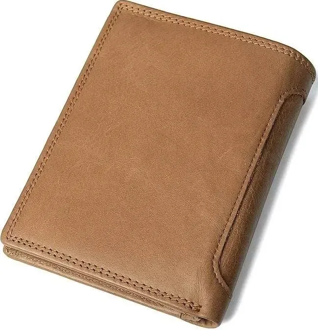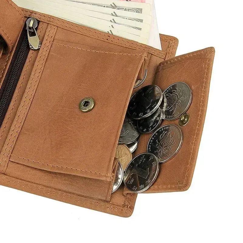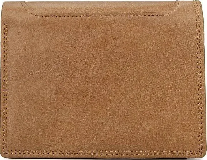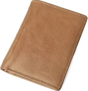Практичний гаманець із високоякісної вінтажної шкіри. Аксесуар акуратно прошитий надміцною ниткою світло-коричневого кольору. Гаманець упакований у текстильний чохол пилу.