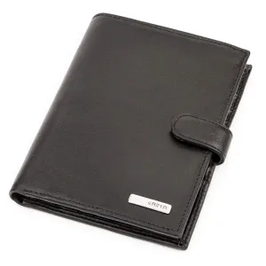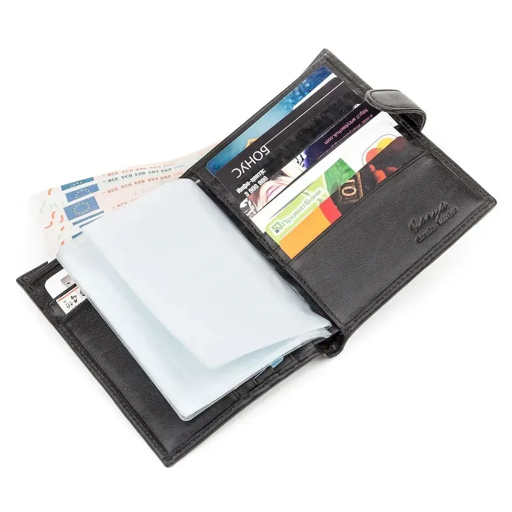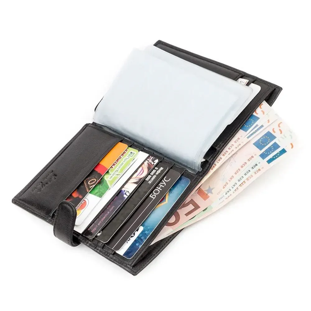 Місткий чоловічий гаманець чорний кольори. Аксесуар виконаний з натуральної високоякісної зернистої шкіри, преміум класу, приємної на дотик. Виріб упакований у фірмову коробочку. Якість аксесуара на високому рівні, так що прослужить своєму власнику тривалий час.