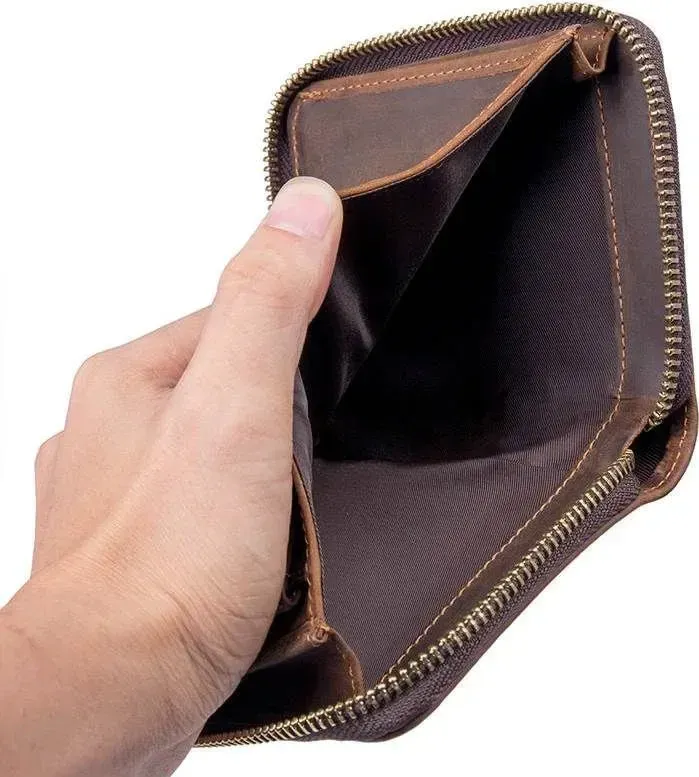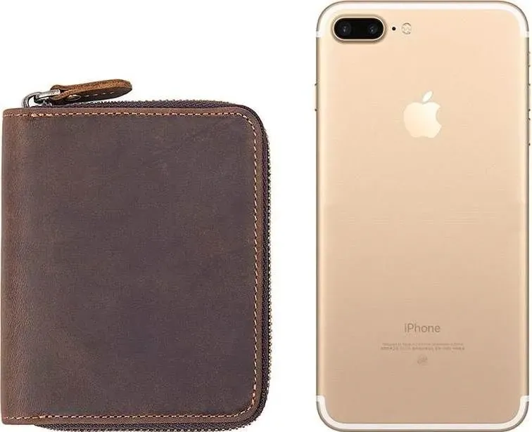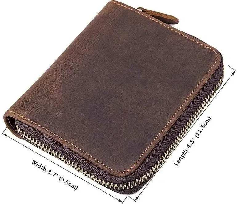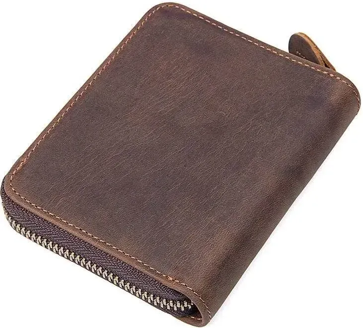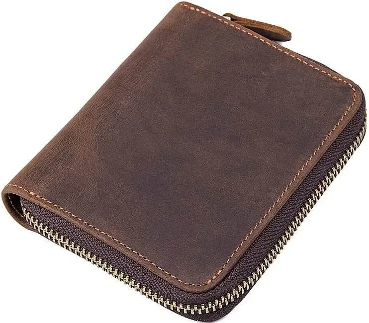 Дуже гарний гаманець із високоякісної вінтажної шкіри. Гаманець має досить компактні розміри, але не дивлячись на це, він досить місткий і функціональний. Аксесуар закривається на блискавку. Колір фурнітури: латунь. Виріб може використовуватися як чоловіками, так і жінками. Гаманець упакований у текстильний пилозахисний чохол.