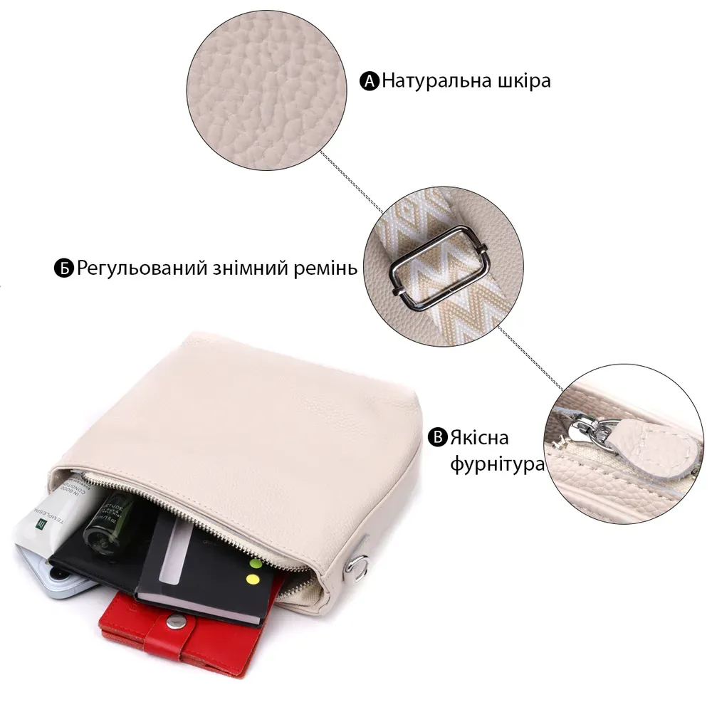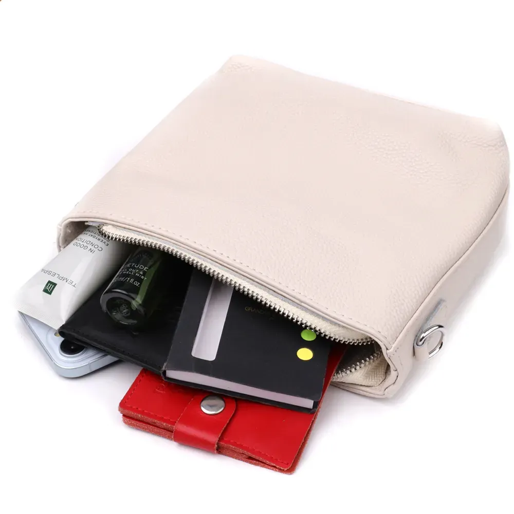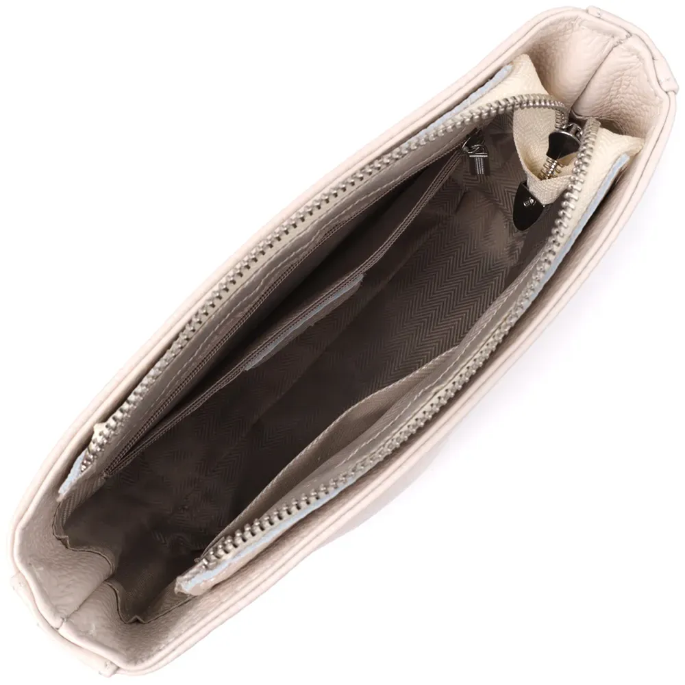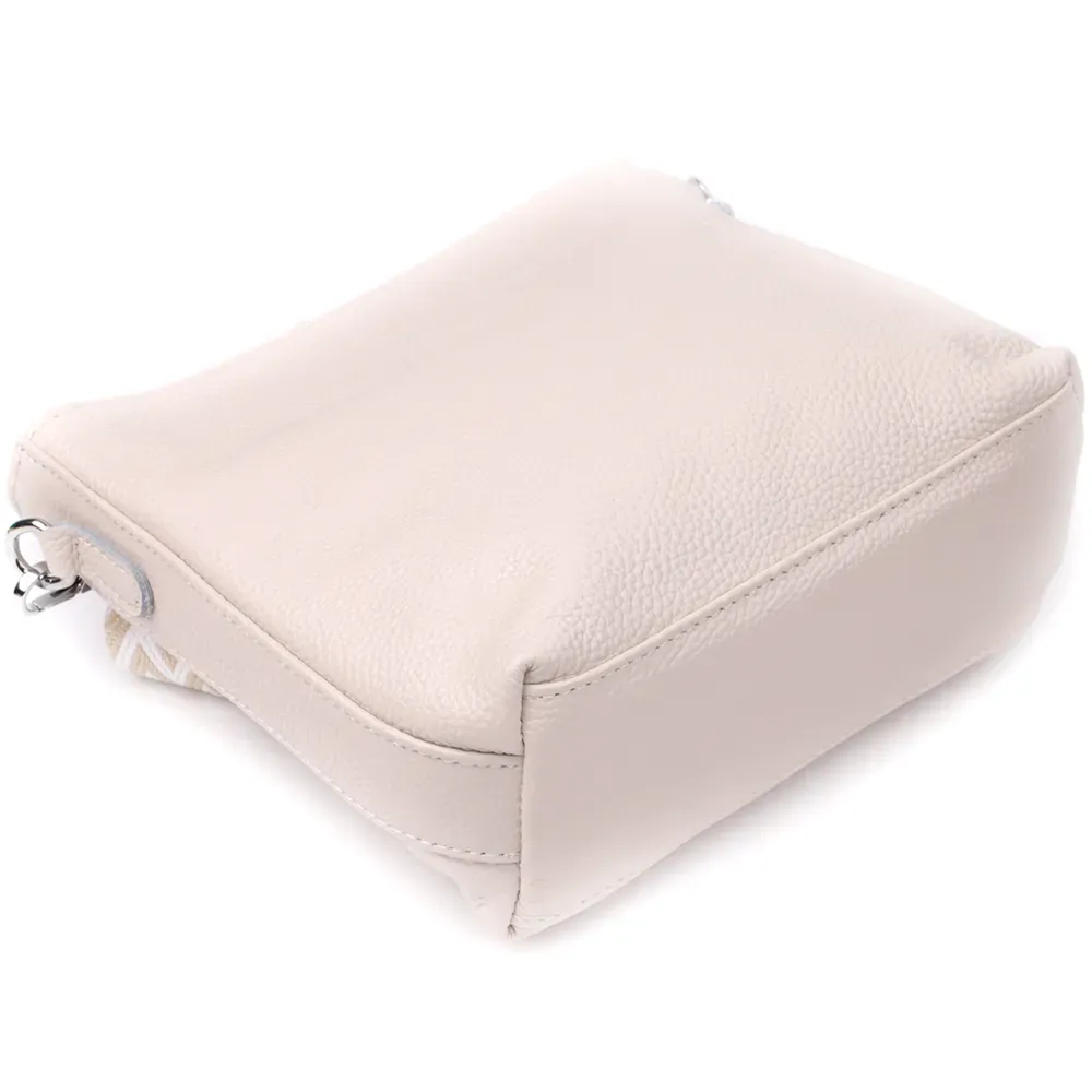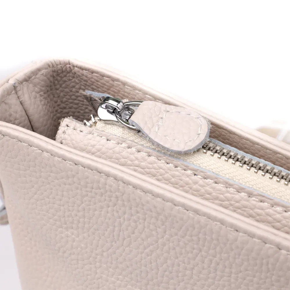 Елегантна сумка з натуральної шкіри у класичному білому кольорі – втілення стриманого стилю та універсальності. Модель оснащена одним основним відділенням, яке закривається на блискавку, забезпечуючи надійний захист речей. Усередині передбачені дві зручні кишені: потайна кишеня на блискавці - для зберігання цінних дрібниць, і відкрита - для предметів, до яких необхідний швидкий доступ.