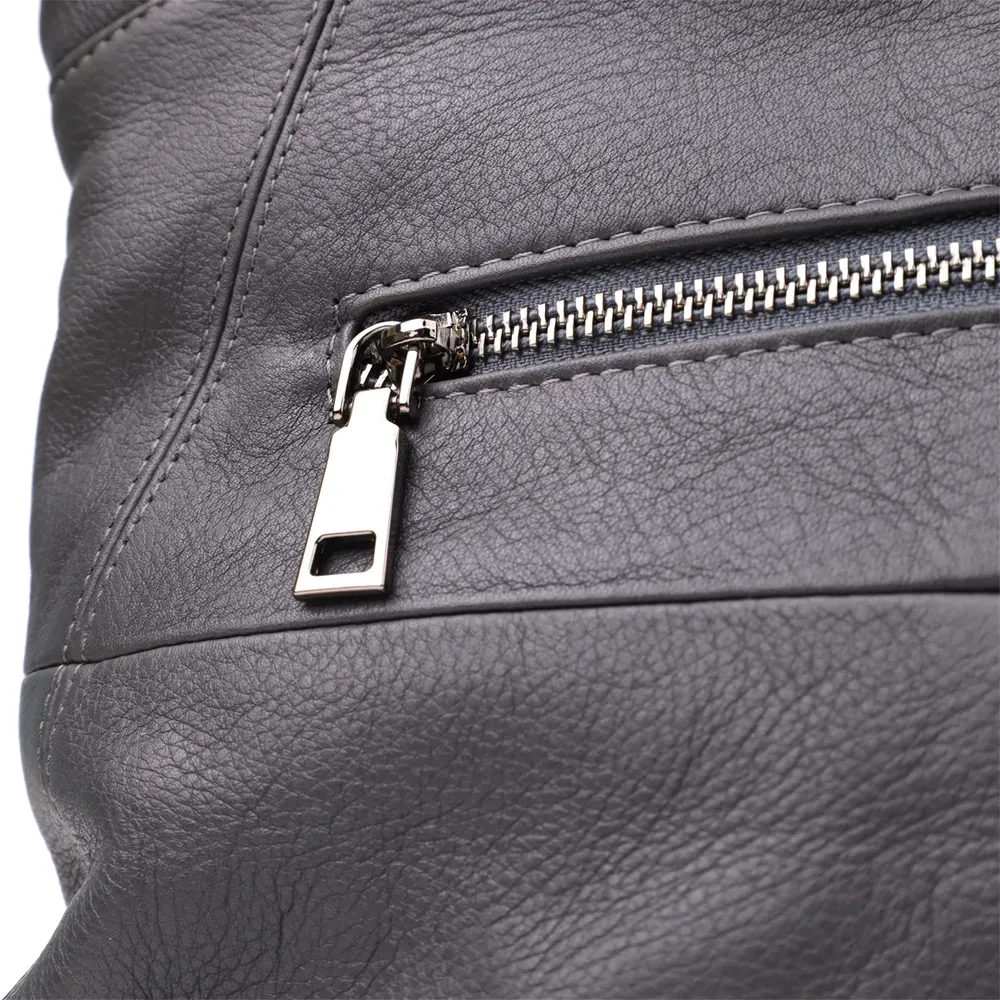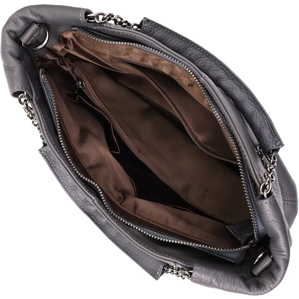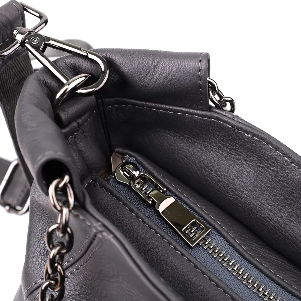 Для комфорту в носінні передбачений знімний шкіряний ремінець довжиною 118 см, який можна регулювати по довжині, вибираючи оптимальний варіант носіння - на плечі або через плече. Фурнітура виконана в кольорі срібла, що гармонійно доповнює стриманий сірий тон шкіри та надає сумці сучасного та стильного вигляду.