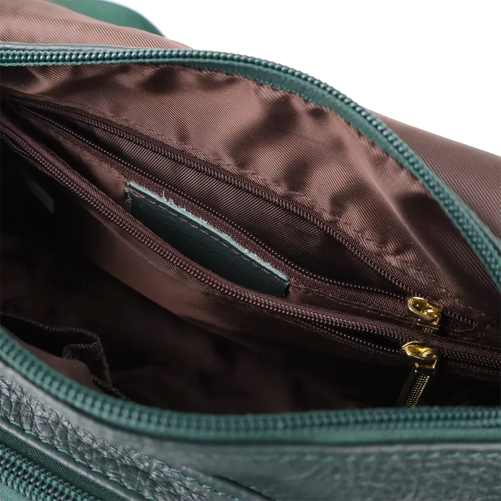 Головне основне відділення закривається на блискавку та додатково фіксується клапаном на магніт, що забезпечує надійний захист вмісту. Внутрішній простір організований максимально зручно: всередині розташовані потайна кишеня на блискавці, кишеня-перегородка на блискавці і дві відкриті кишені для гаджетів та дрібниць.