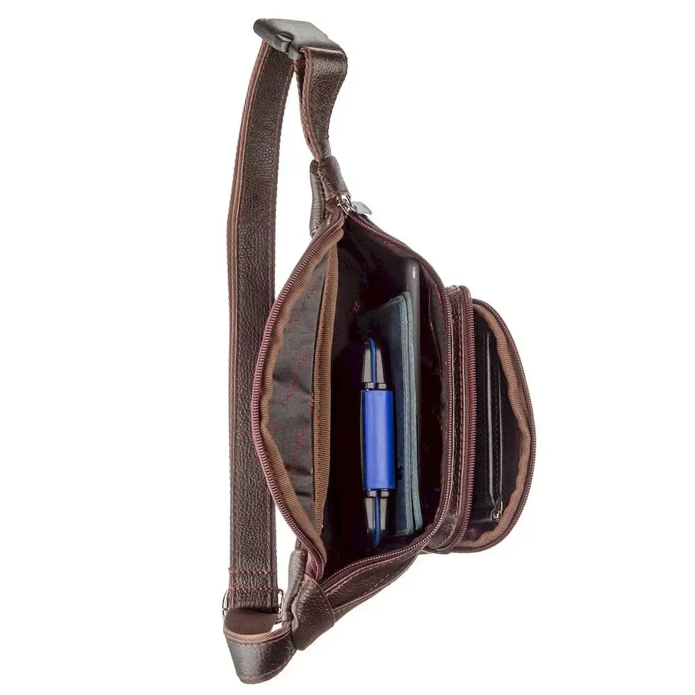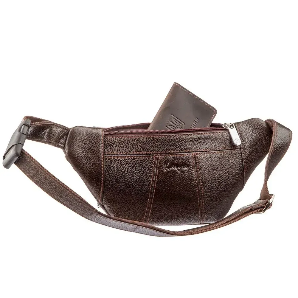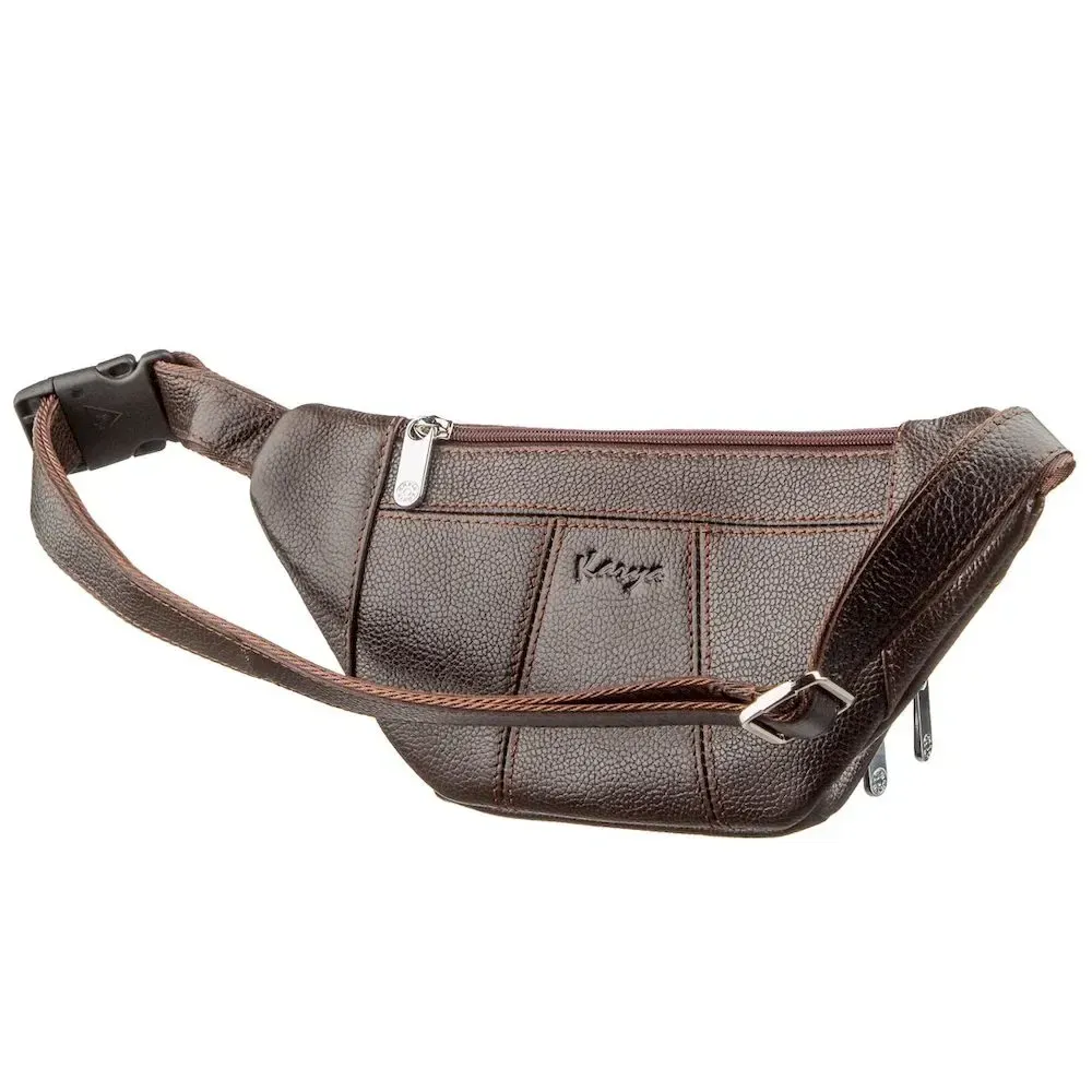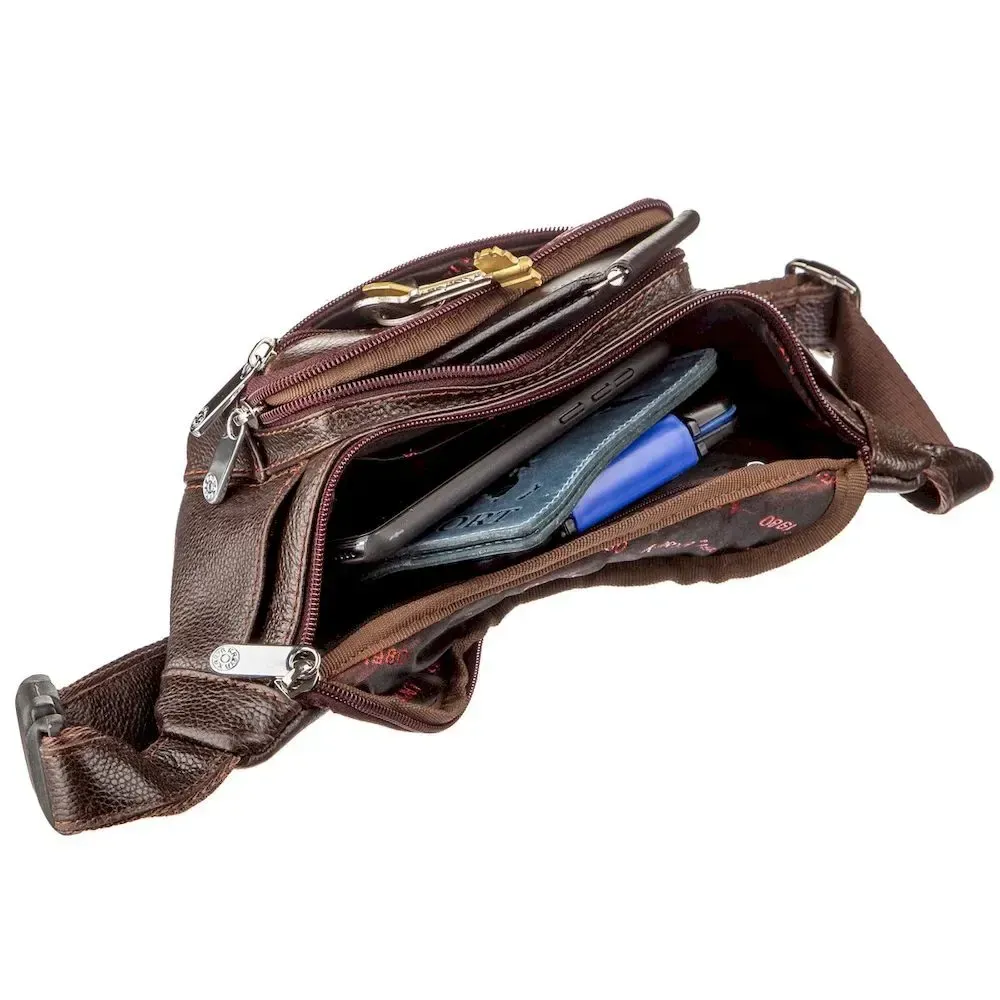 Чудова чоловіча бананка із натуральної шкіри коричневого кольору зі сливовими блискавками стане ідеальним завершенням образу сучасного чоловіка. Бананка буде незамінним атрибутом у дорогу або водіям. З такою сумкою всі ваші цінні речі завжди будуть під рукою і в безпеці. Ідеальний подарунок для близької людини. Сумка упакована в тканинний фірмовий чохол.