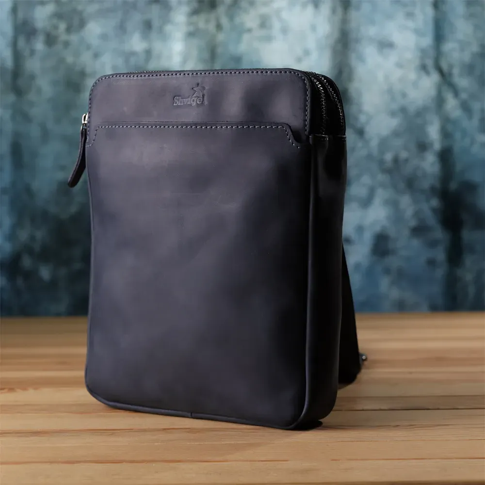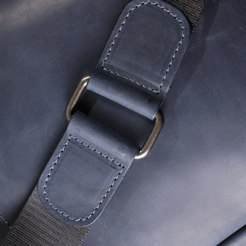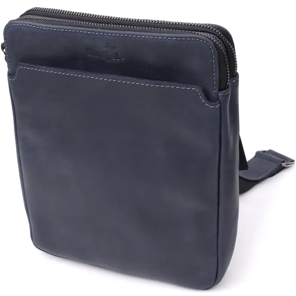 Чоловіча вертикальна сумка від українського бренду SHVIGEL виготовлена з натуральної вінтажної шкіри насиченого синього кольору. Згодом шкіра набуває благородного нальоту, що підкреслює характер виробу та його унікальність.