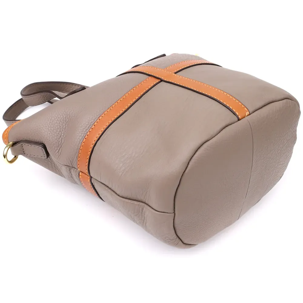 Тверде дно допомагає сумці зберігати форму та надає їй стійкості. Фурнітура кольору жовтого золота ефектно контрастує зі шляхетним сірим відтінком шкіри, додаючи аксесуару витонченості.