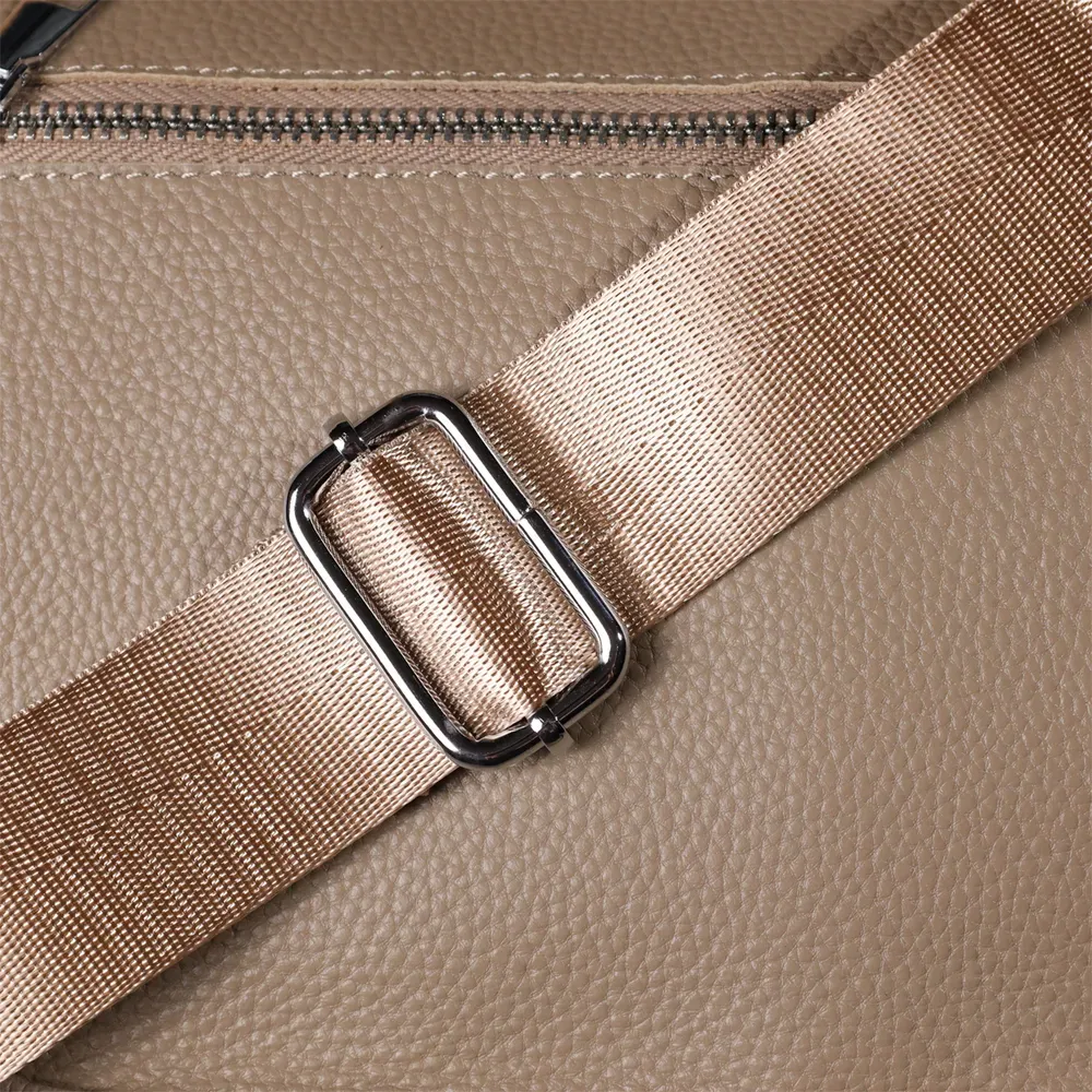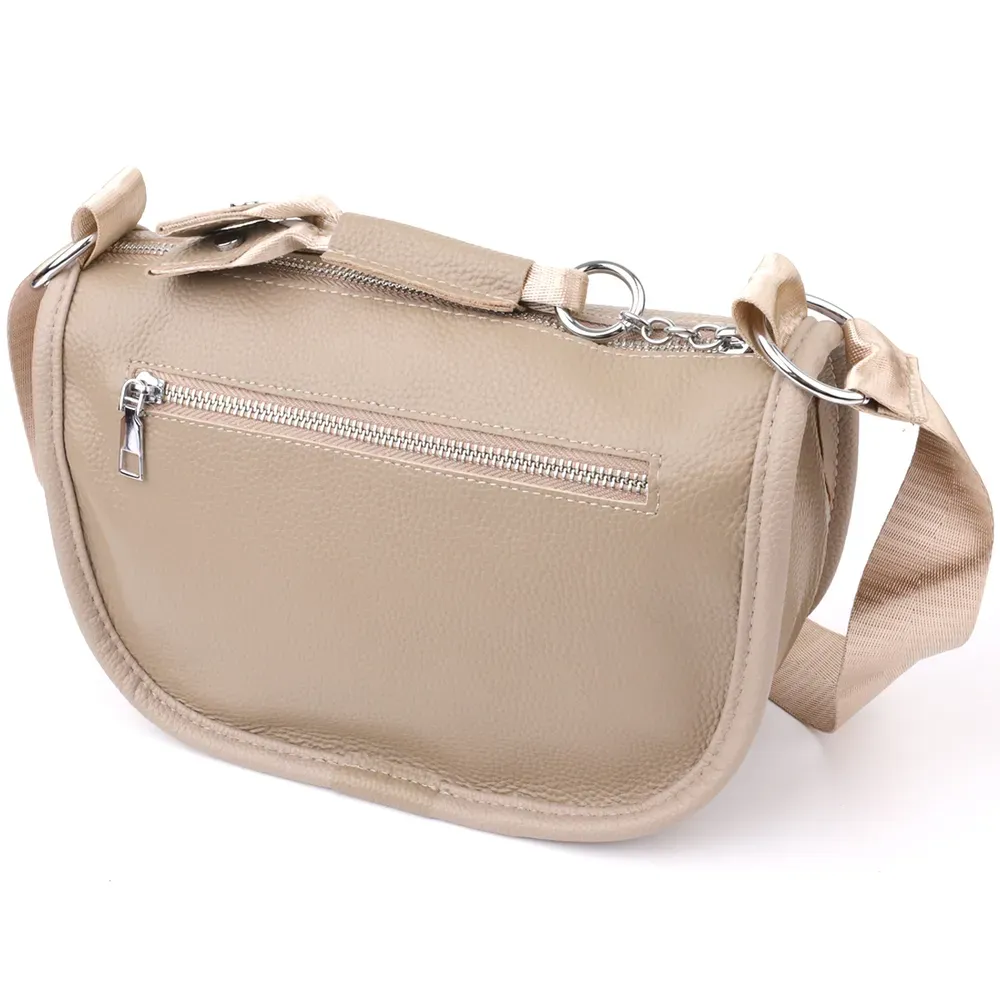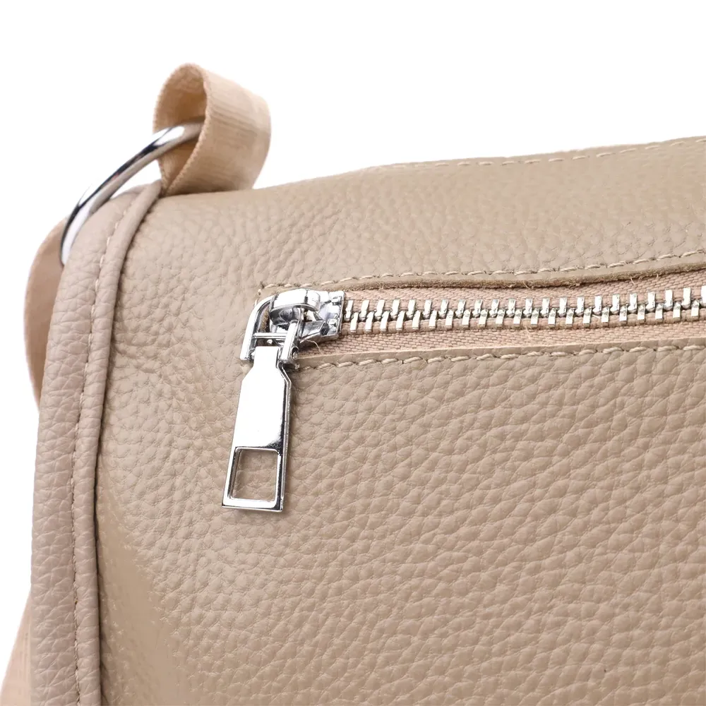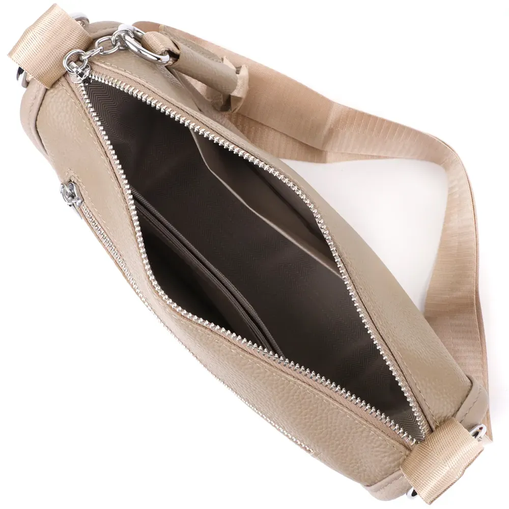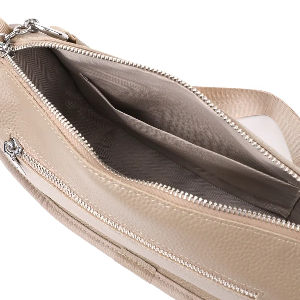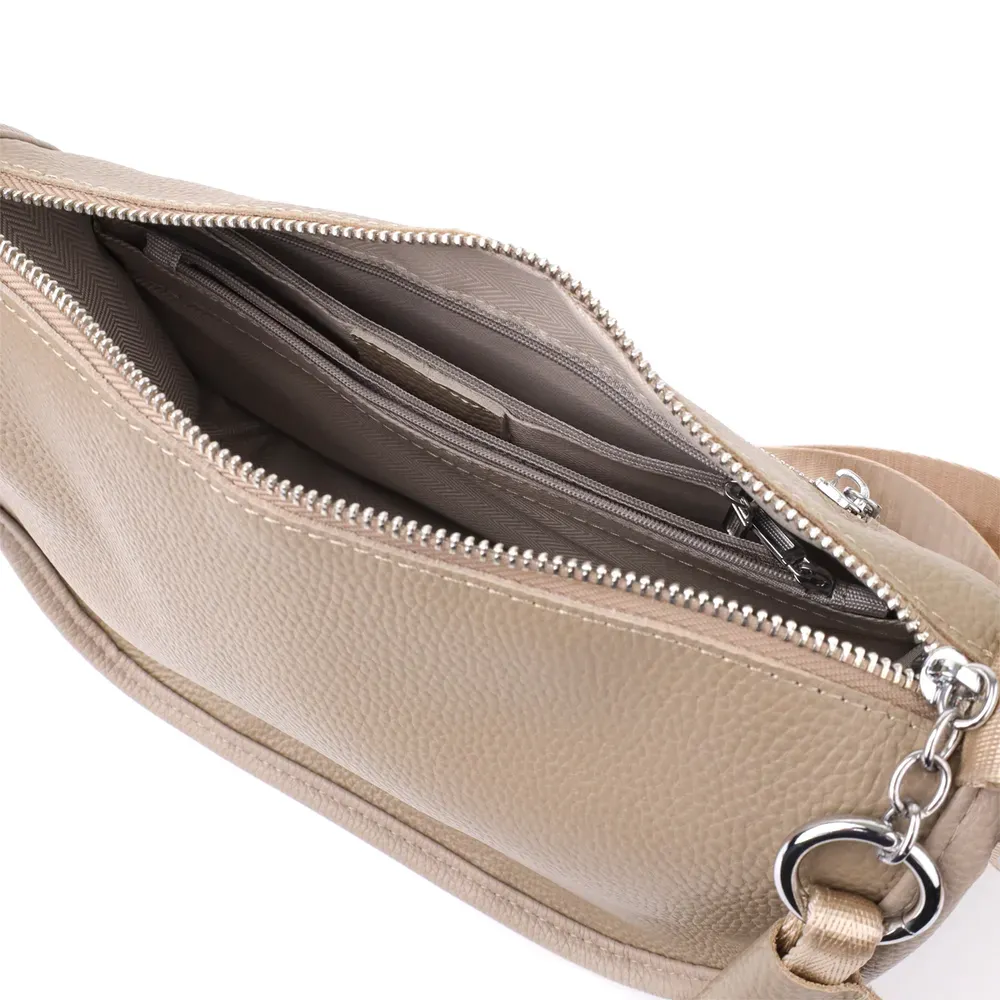 Жіноча шкіряна сумка у бежевому кольорі виконана з якісної зернистої шкіри та має напівкруглу акуратну форму, яка підкреслює витонченість та сучасний стиль. Особливу увагу привертає декоративний бігунок у вигляді елегантного брелка, що надає моделі індивідуальності та шарму. Сумка закривається на блискавку, всередині розташоване основне відділення із двома кишенями на блискавці та двома відкритими кишенями для дрібних предметів, а на тильній стороні є зовнішня кишеня на блискавці. Незнімний текстильний ремінь забезпечує зручність при носінні, а фурнітура під срібло гармонійно відтінює теплий бежевий колір шкіри. Ця сумка стане стильним та практичним аксесуаром як для повсякденних образів, так і для особливих випадків.