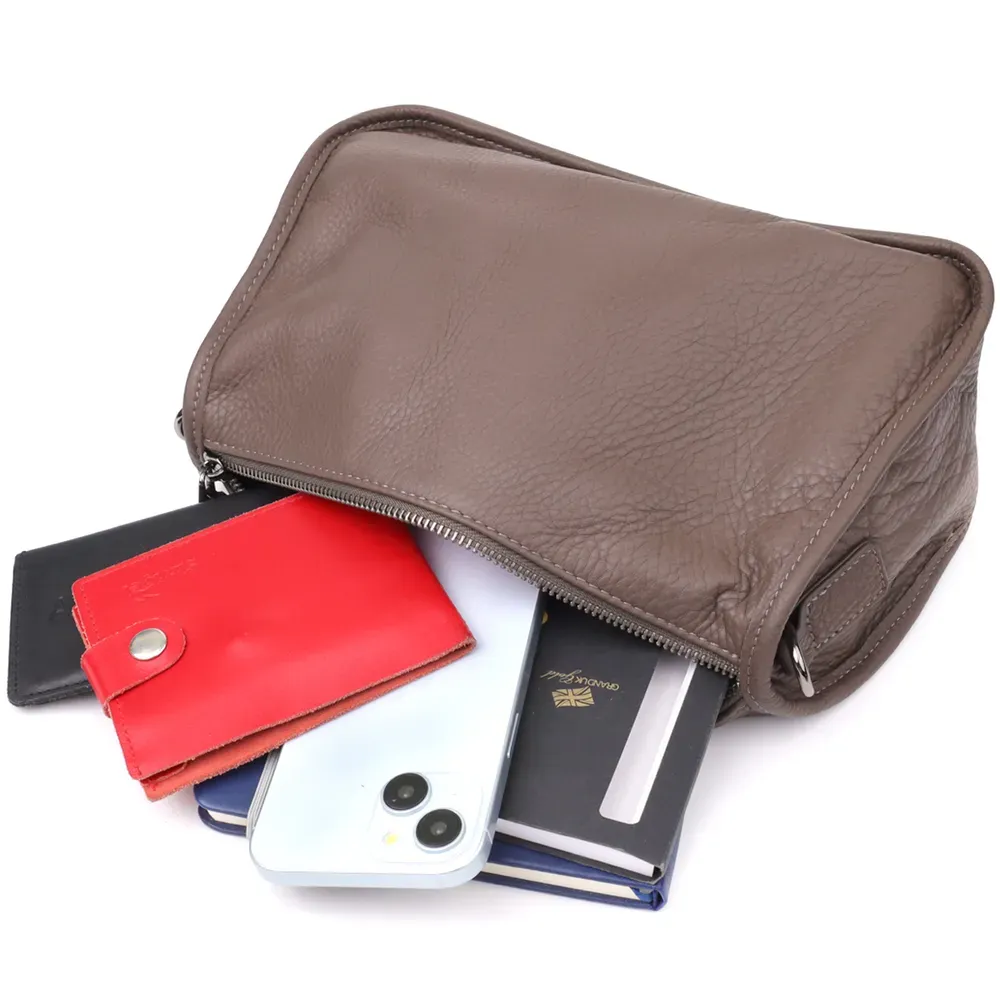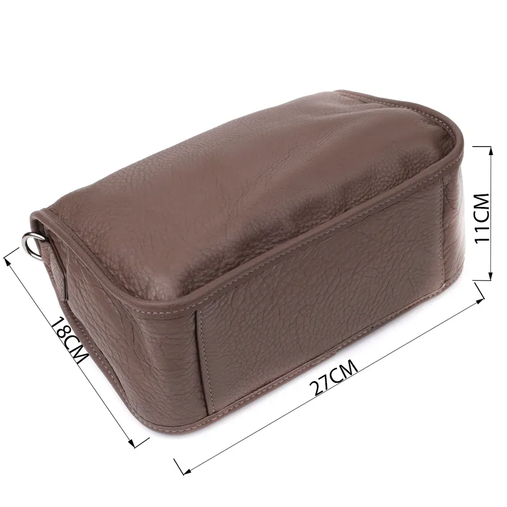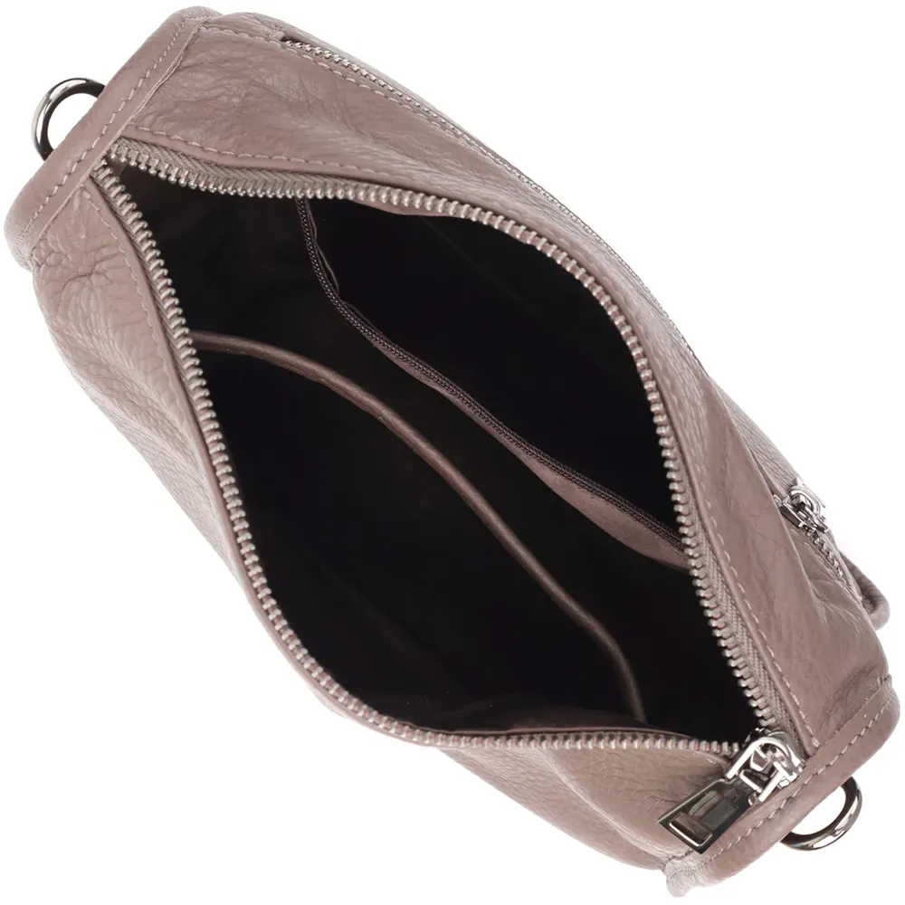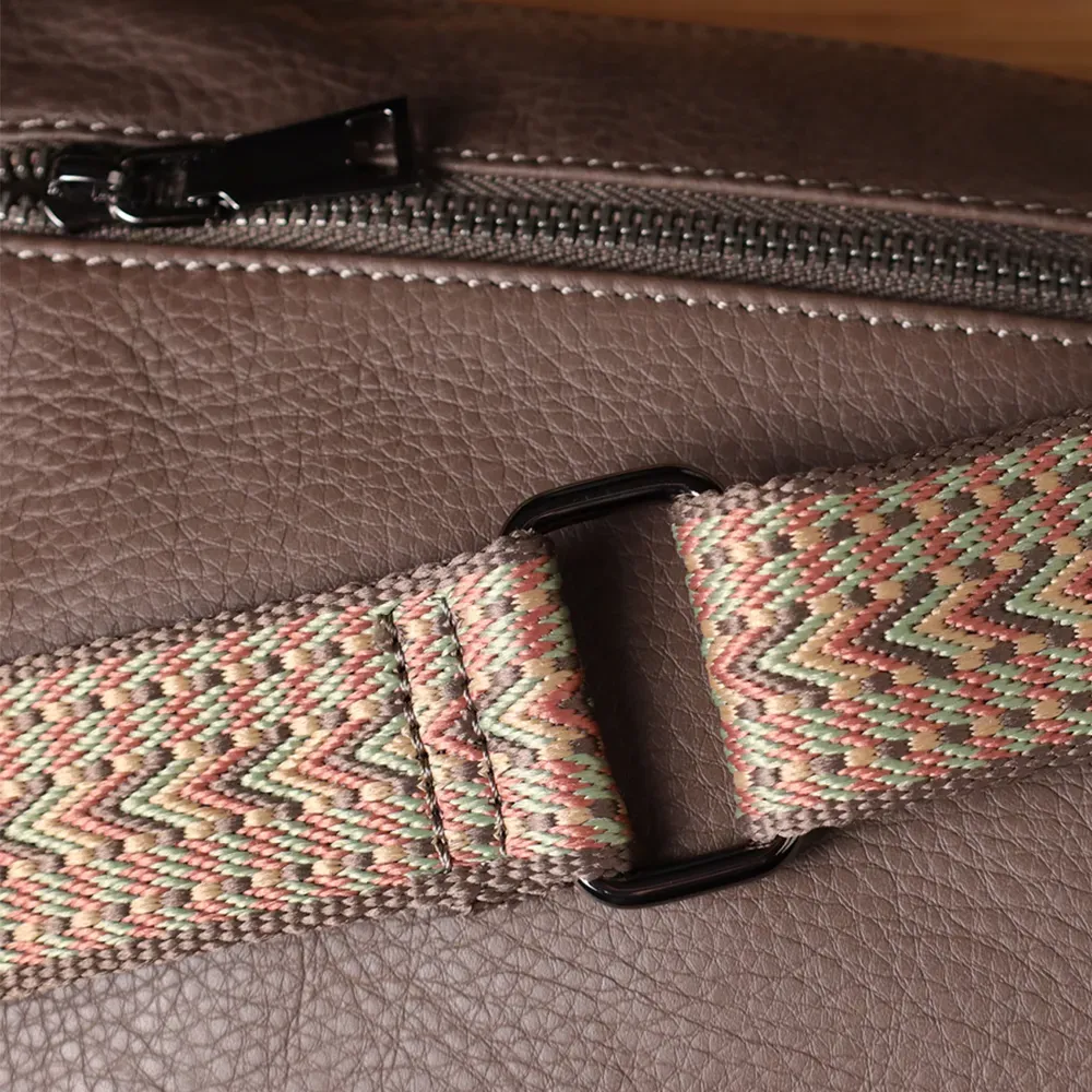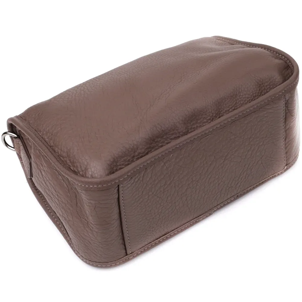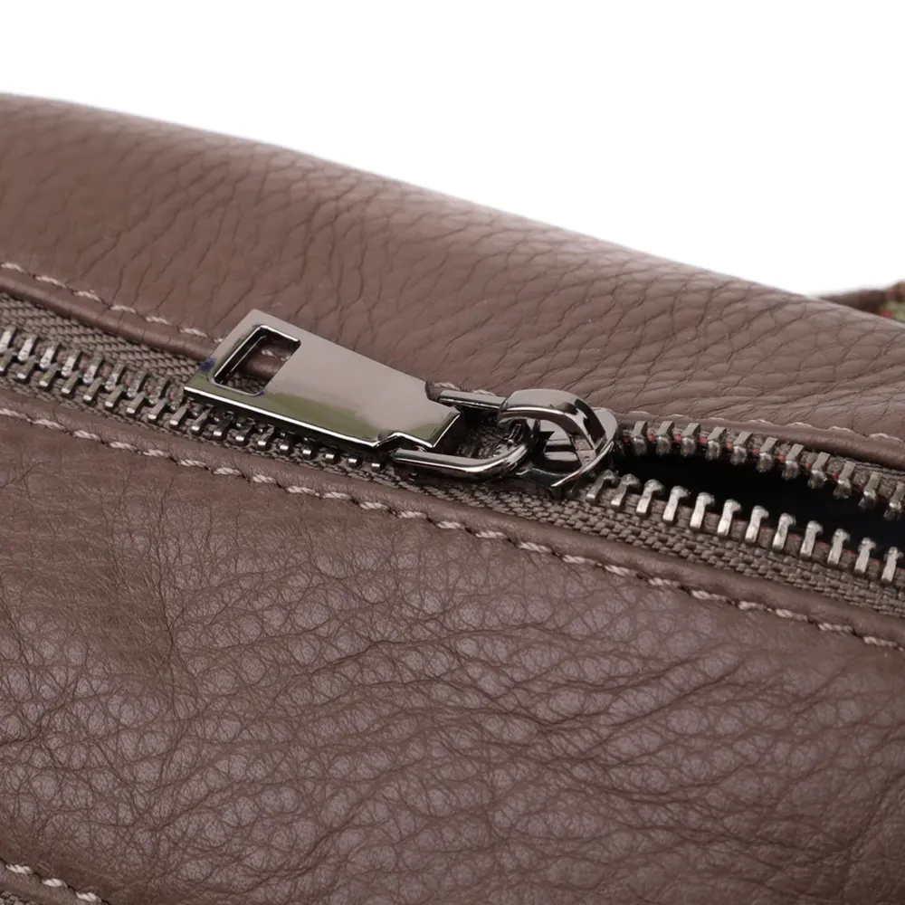Фурнітура кольору срібла красиво контрастує із теплим тоном коричневої шкіри, додаючи аксесуару стриманого блиску. У комплект входять два знімні ремінці - шкіряний і текстильний, що дозволяє змінювати стиль і спосіб носіння сумки в залежності від настрою та випадку.