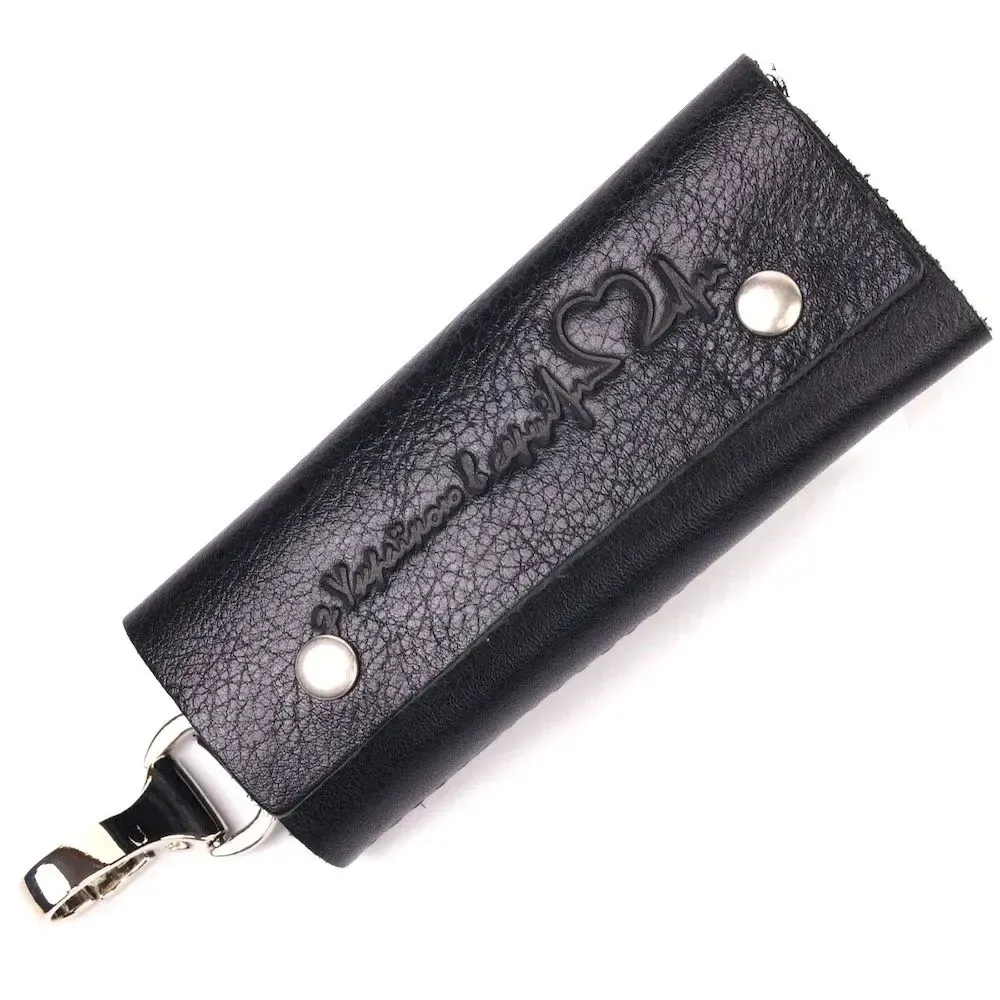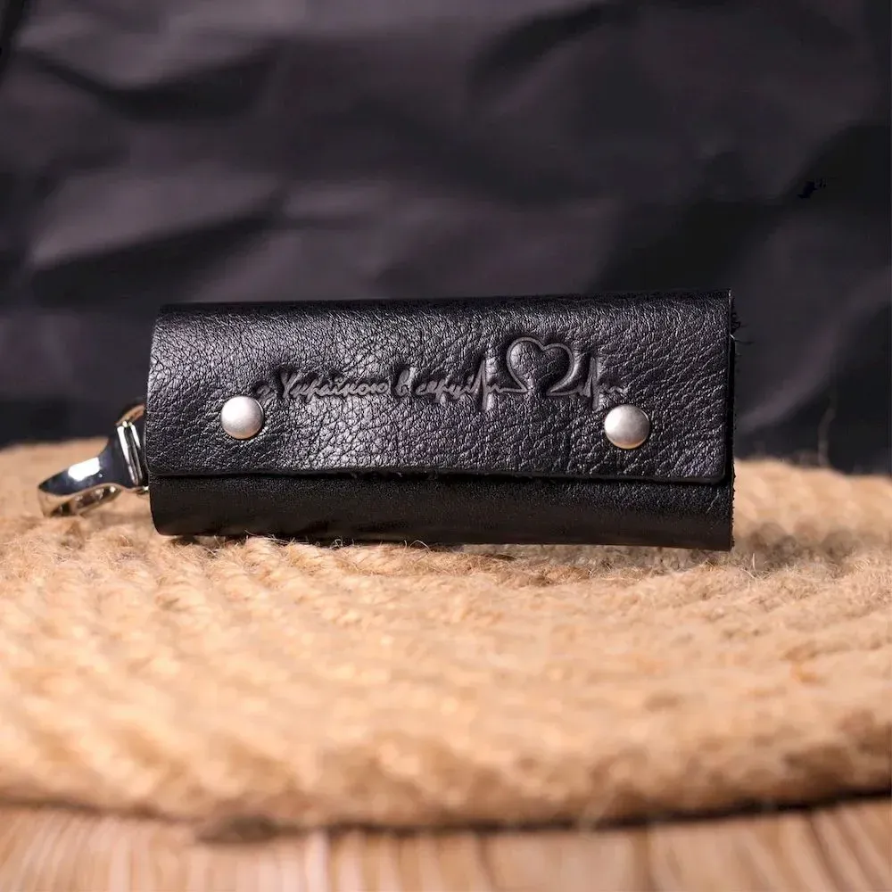 Практична шкіряна ключниця на кнопках, з патріотичним тисненням на лицьовій стороні “З Україною в серці”. Виріб пошитий з гладкої шкіри, з високими показниками зносостійкості. В аксесуарі використано надійну фурнітуру, кольори срібла. Вироби зі шкіри завжди вважалися відмінним подарунком, незалежно від статі та віку.