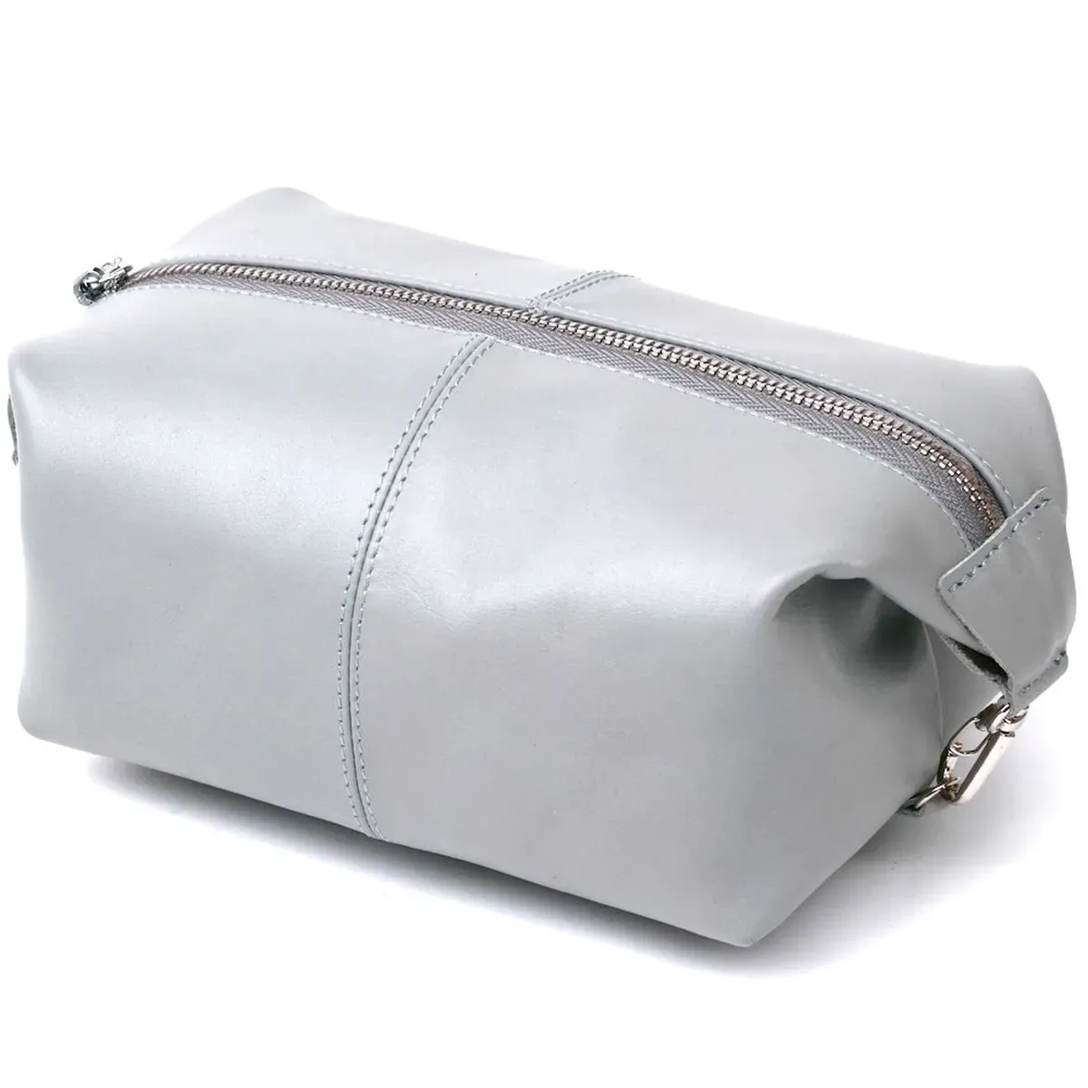 Добротна косметичка в практичному та строгому дизайні від українського виробника. Виконана дана модель з натуральної шкіри високої якості та покращеної міцності. Аксесуар має модний та сучасний сірий колір та гладку фактуру. Об'єм може бути збільшений за допомогою карабінів, які розташовані з обох боків виробу.
