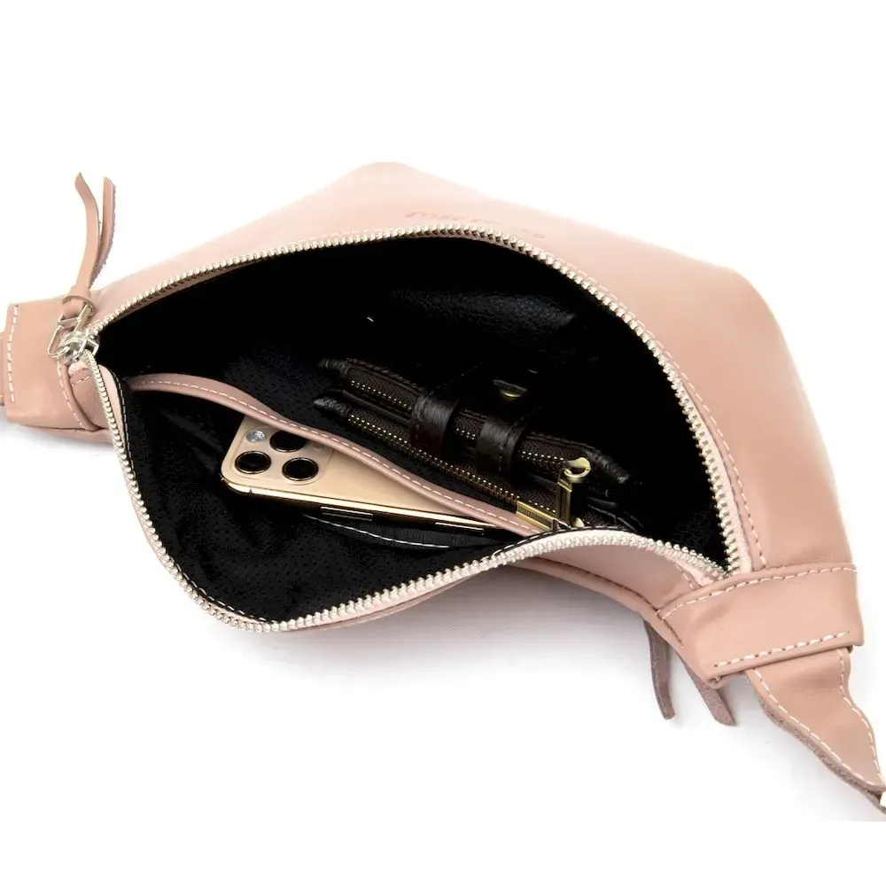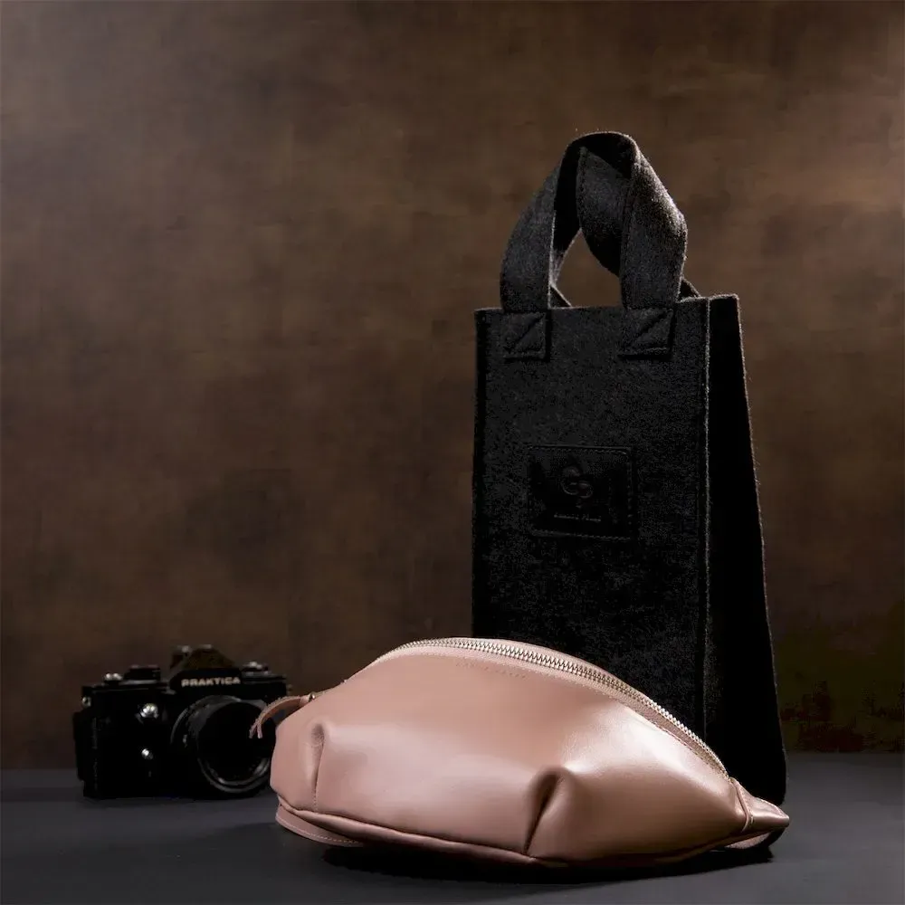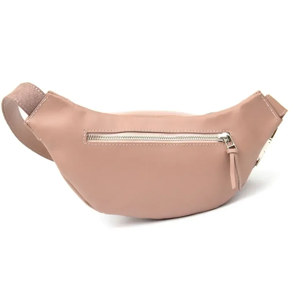 Бренд: GRANDE PELLE. - 1 кишеня на блискавці на задній зовнішній стінці; Практична жіноча поясна сумка (бананка) з високоякісної натуральної шкіри. Має просторе відділення та додаткову кишеню на всю довжину. На зовнішній задній стороні є кишеня на блискавці для швидкого доступу. Колір виробу – ніжно рожевий. Цей виріб стане чудовим подарунком на будь-яке свято.