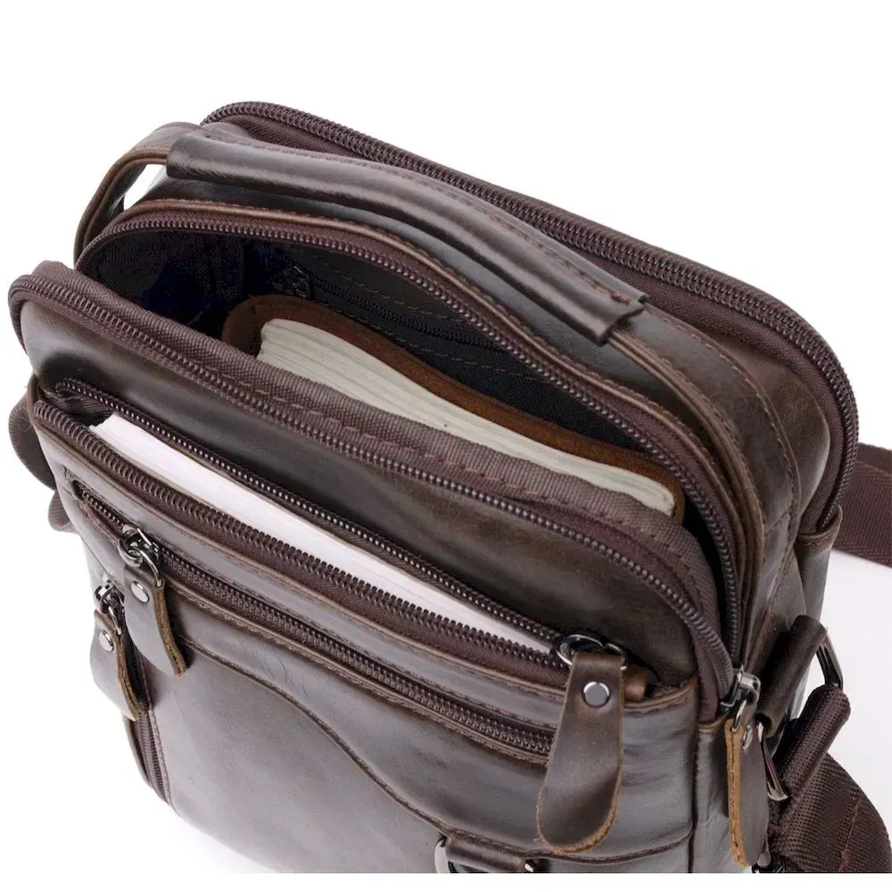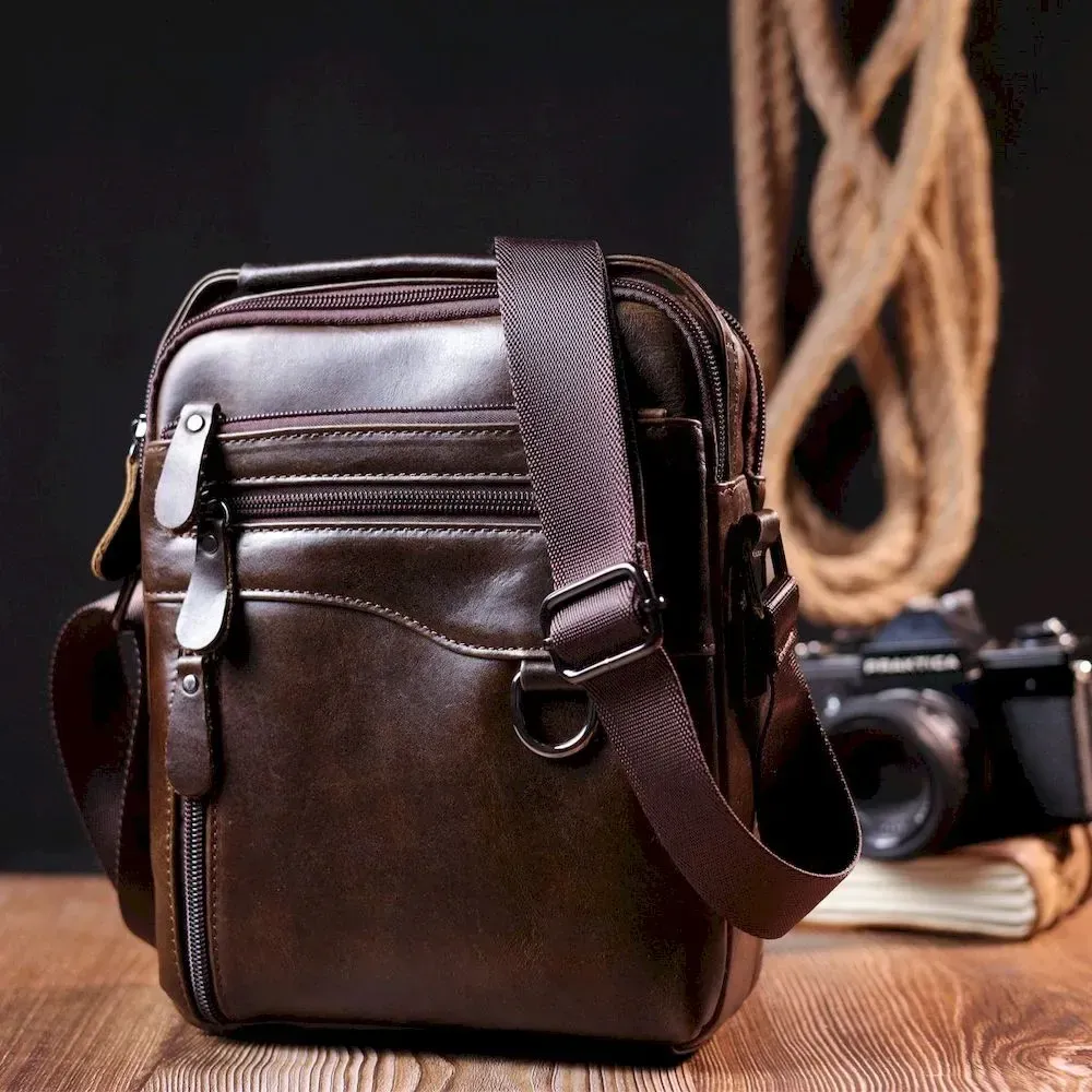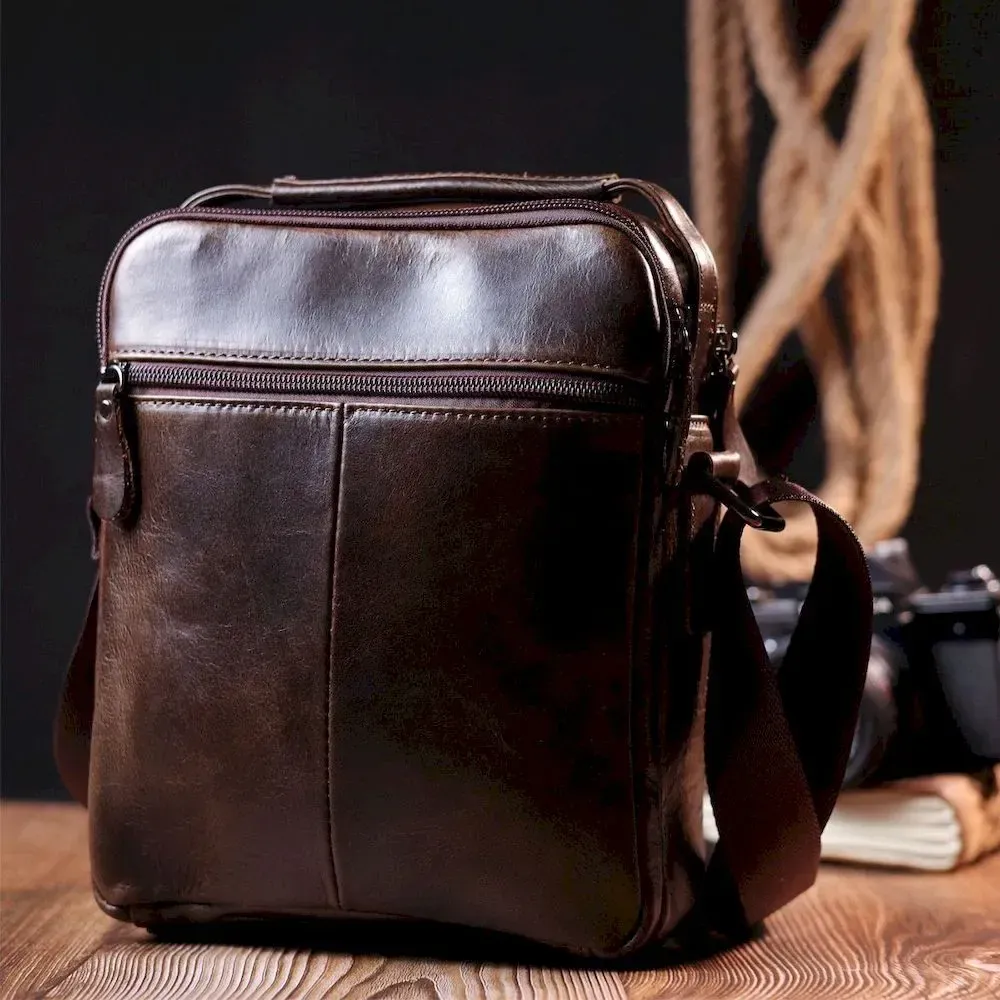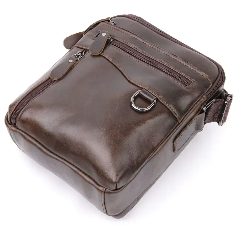 Містка чоловіча сумка компактного розміру з натуральної шкіри. У сумку з легкістю помістяться всі необхідні речі. З такою сумкою зручно ходитиме на роботу або зустрічі. Доповнено виріб якісною фурнітурою. На лицьовому боці сумки є металева «лямка» для брелока, ключів чи інших дрібниць. Сумка стане чудовим подарунком для близької людини.