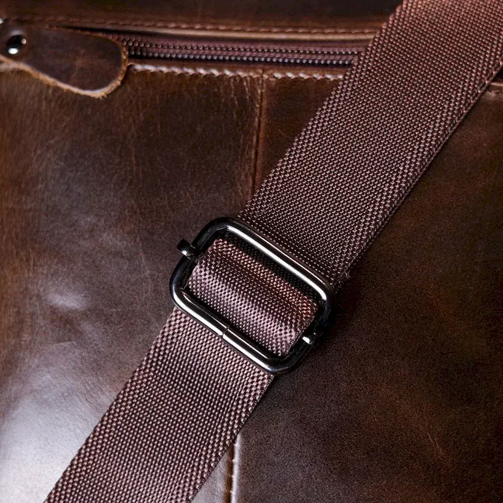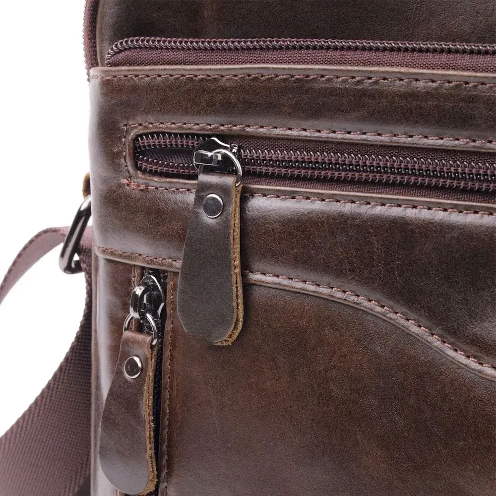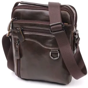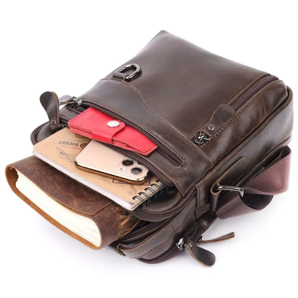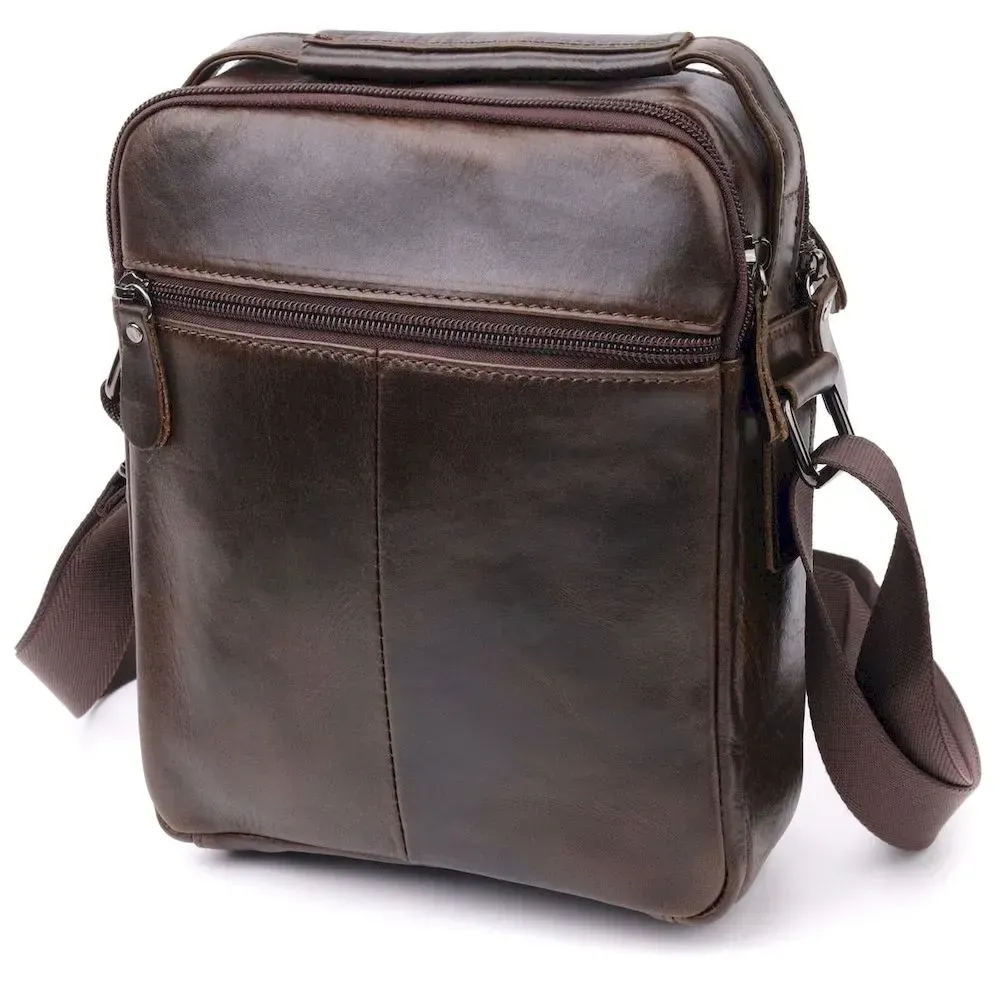Містка чоловіча сумка компактного розміру з натуральної шкіри. У сумку з легкістю помістяться всі необхідні речі. З такою сумкою зручно ходитиме на роботу або зустрічі. Доповнено виріб якісною фурнітурою. На лицьовому боці сумки є металева «лямка» для брелока, ключів чи інших дрібниць. Сумка стане чудовим подарунком для близької людини.