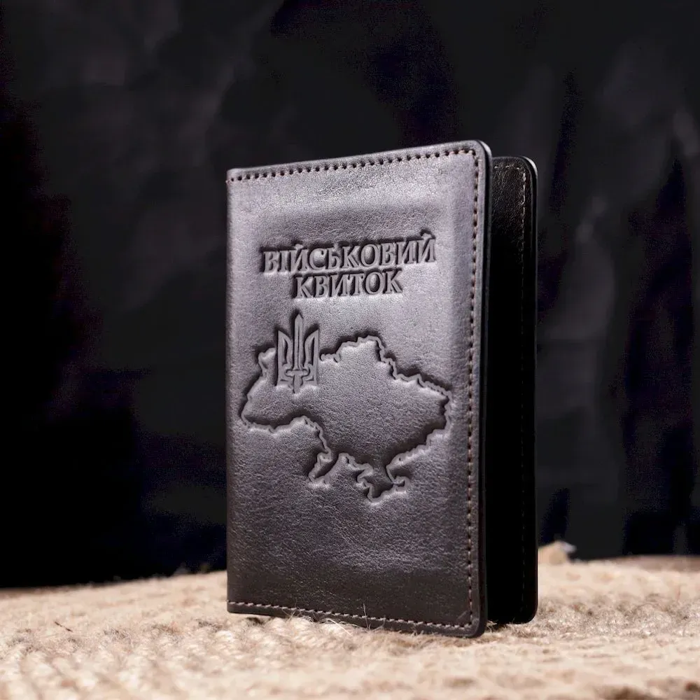 Глянцева обкладинка коричневого кольору для військового квитка з патріотичним тисненням карти України, на лицьовій стороні. Виріб пошитий із якісної італійської шкіри із високим показником зносостійкості, яка захистить від пошкоджень документ на дуже довгий час. Аксесуар має розворот для військового квитка, два осередки для карток, без застібки, упакований у фірмовий чохол.