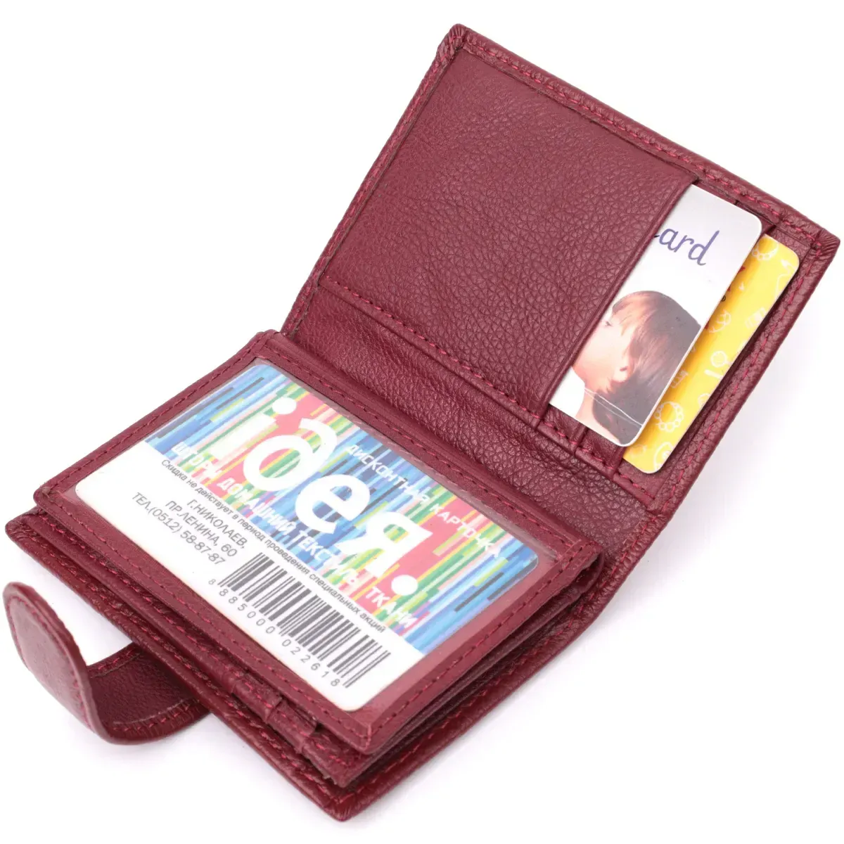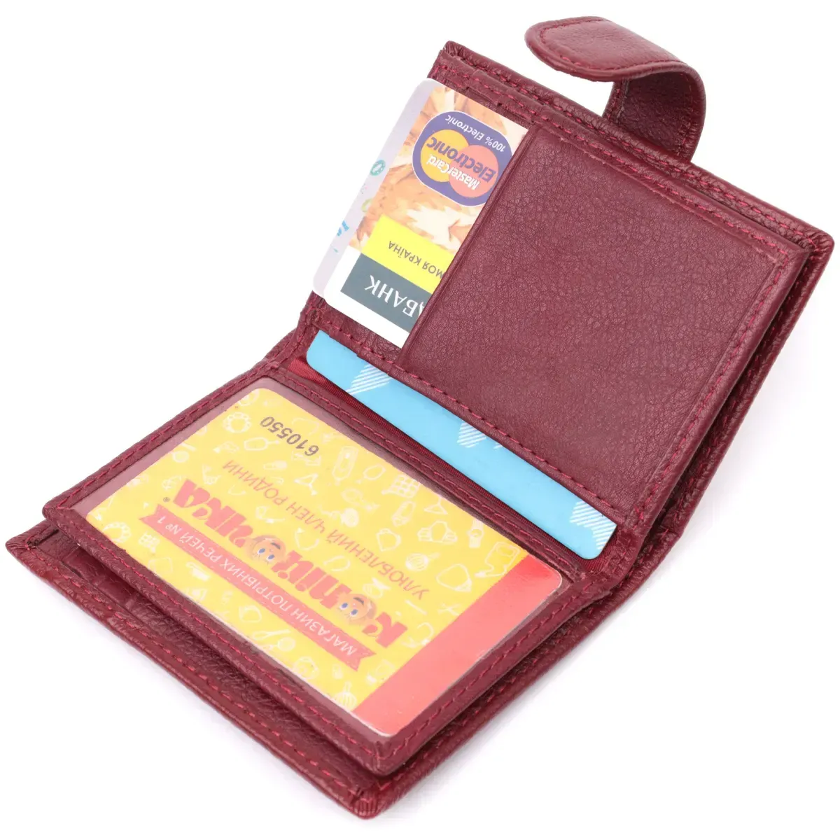 Зручна візитниця для жінок у красивому бордовому кольорі, що закривається навпіл хлястиком на кнопку. Аксесуар місткий з натуральної шкіри, він складається з дванадцяти осередків для карт, кишені під плівкою та однієї прихованої кишені. Візитниця доповнена надійною фурнітурою та міцною підкладкою.