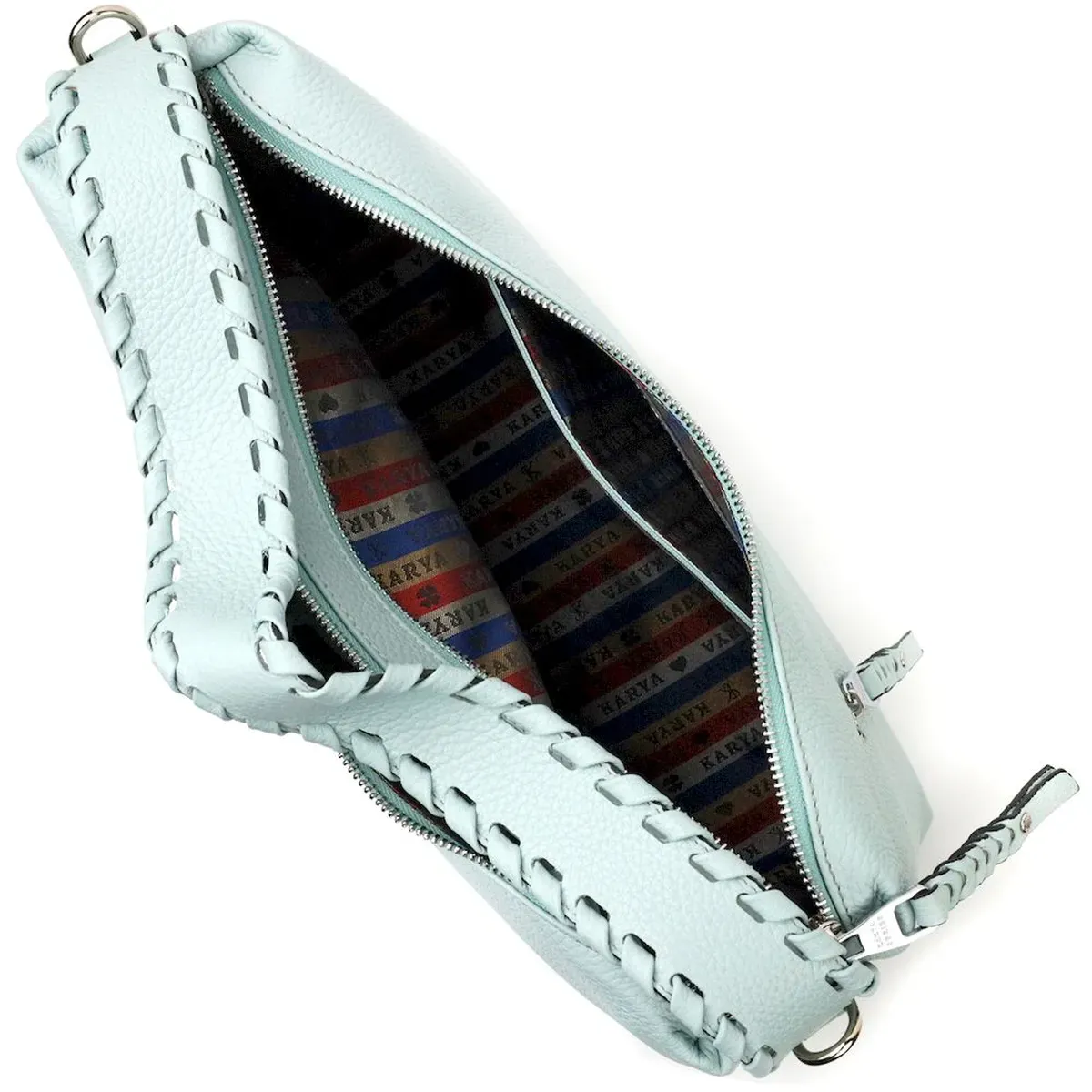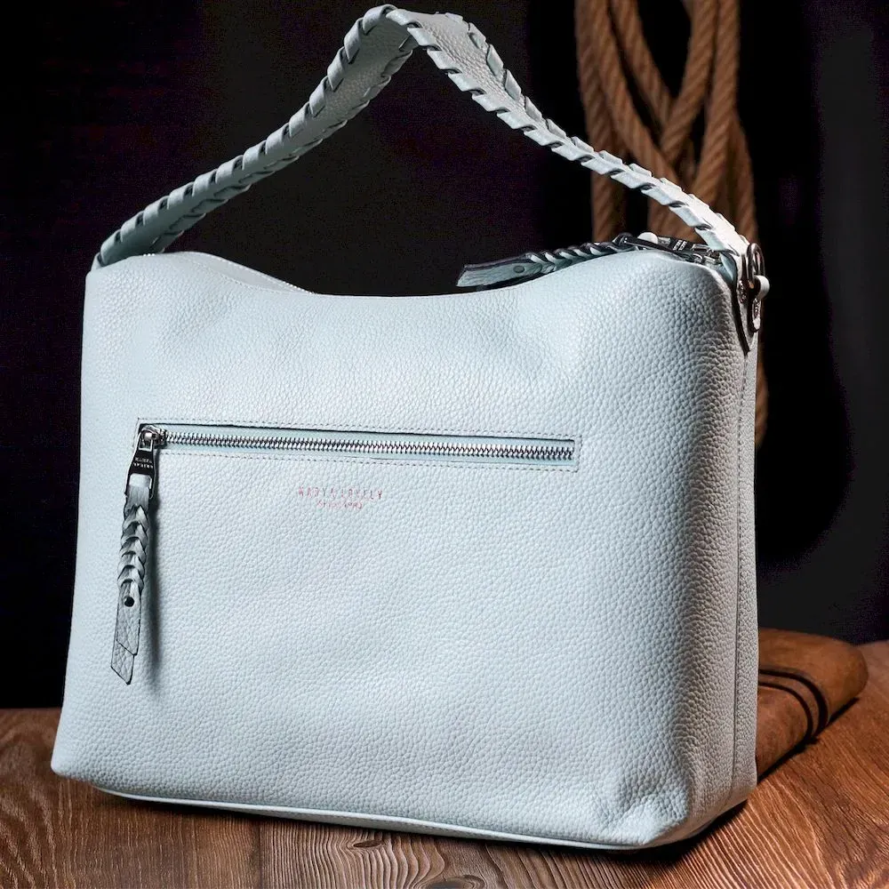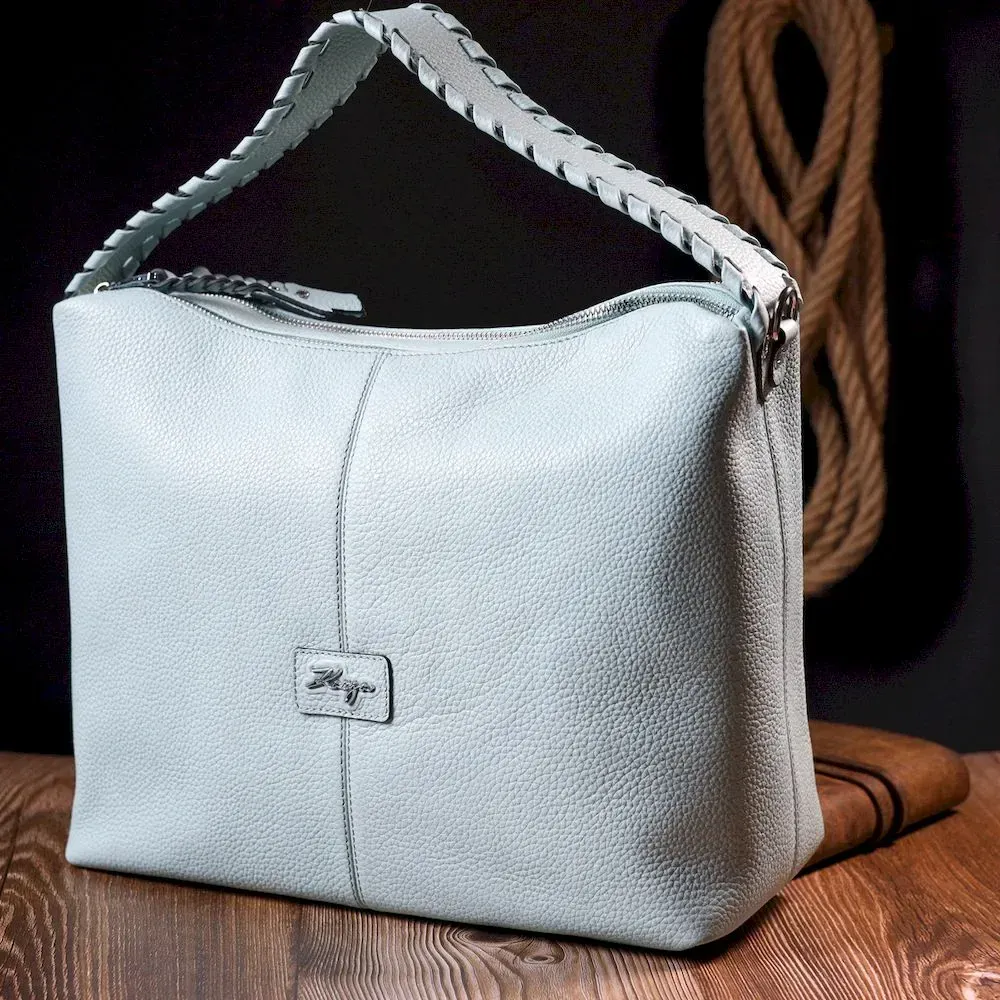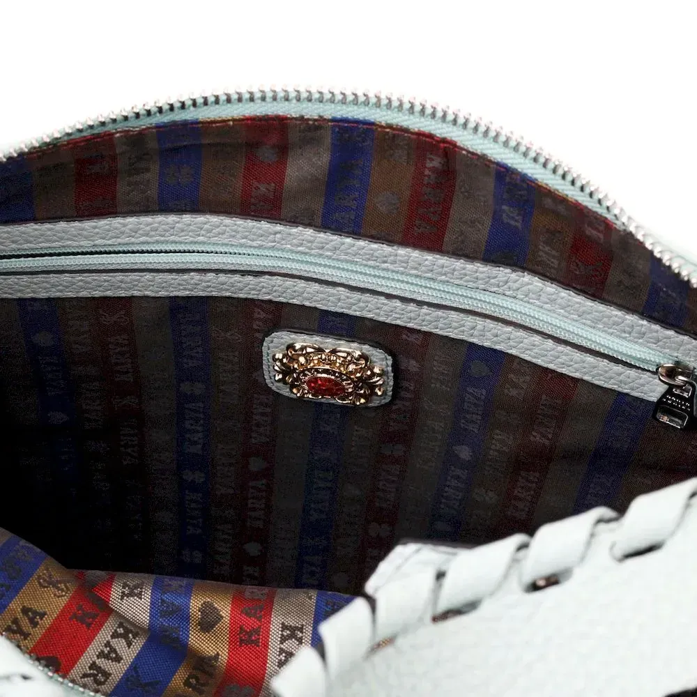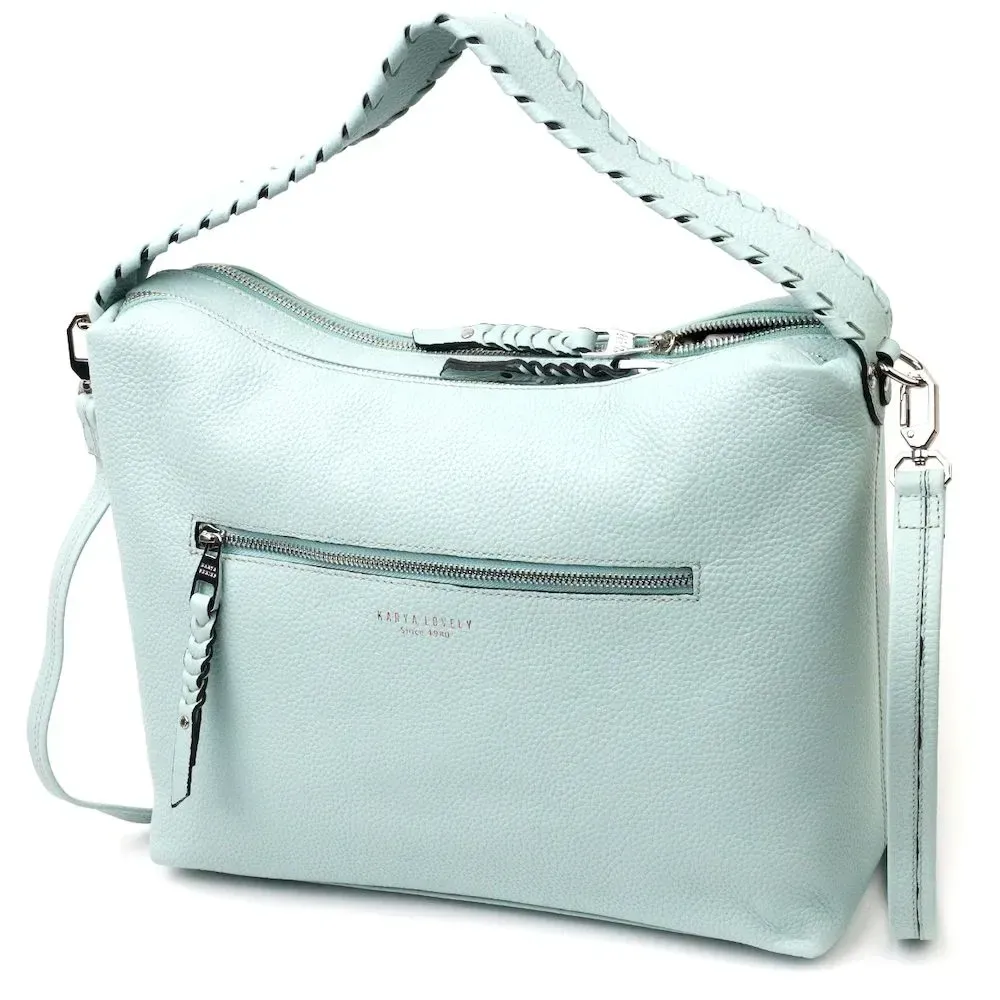 Красива містка жіноча сумка з натуральної зернистої шкіри, незвичайного блакитного кольору. Сумка практична та функціональна в експлуатації, якісна фурнітура сріблястого кольору не тільки доповнює стильний дизайн сумки, але й захищає виріб. Аксесуар упакований у фірмовий текстильний мішок Karya. Сумка з натуральної шкіри завжди буде чудовим подарунком будь-якій жінці.