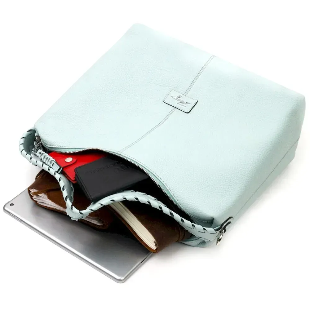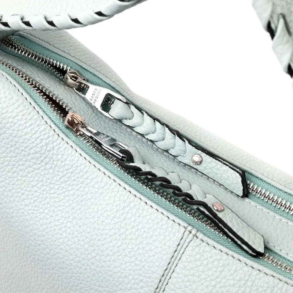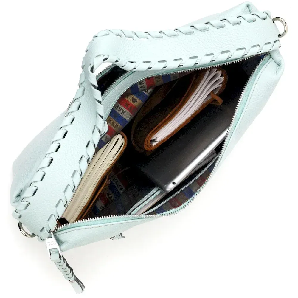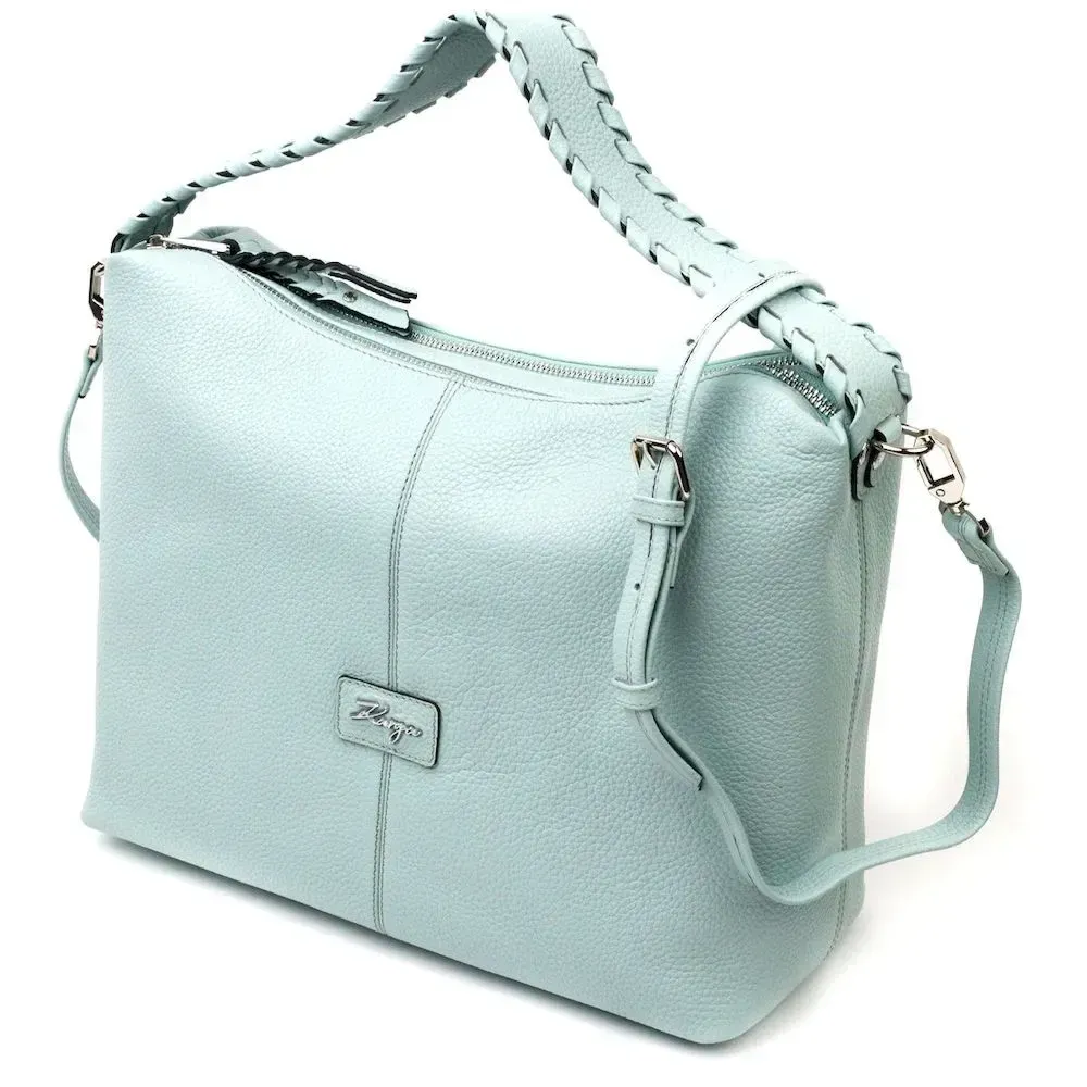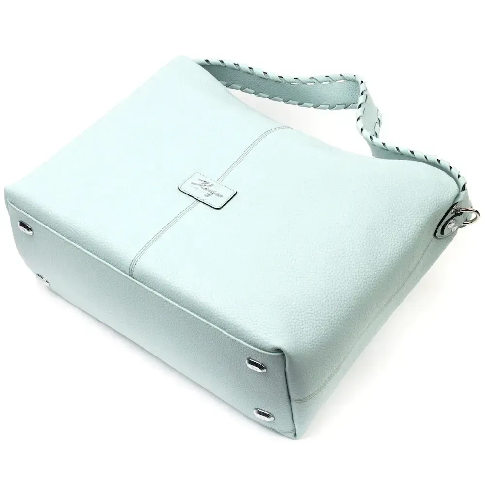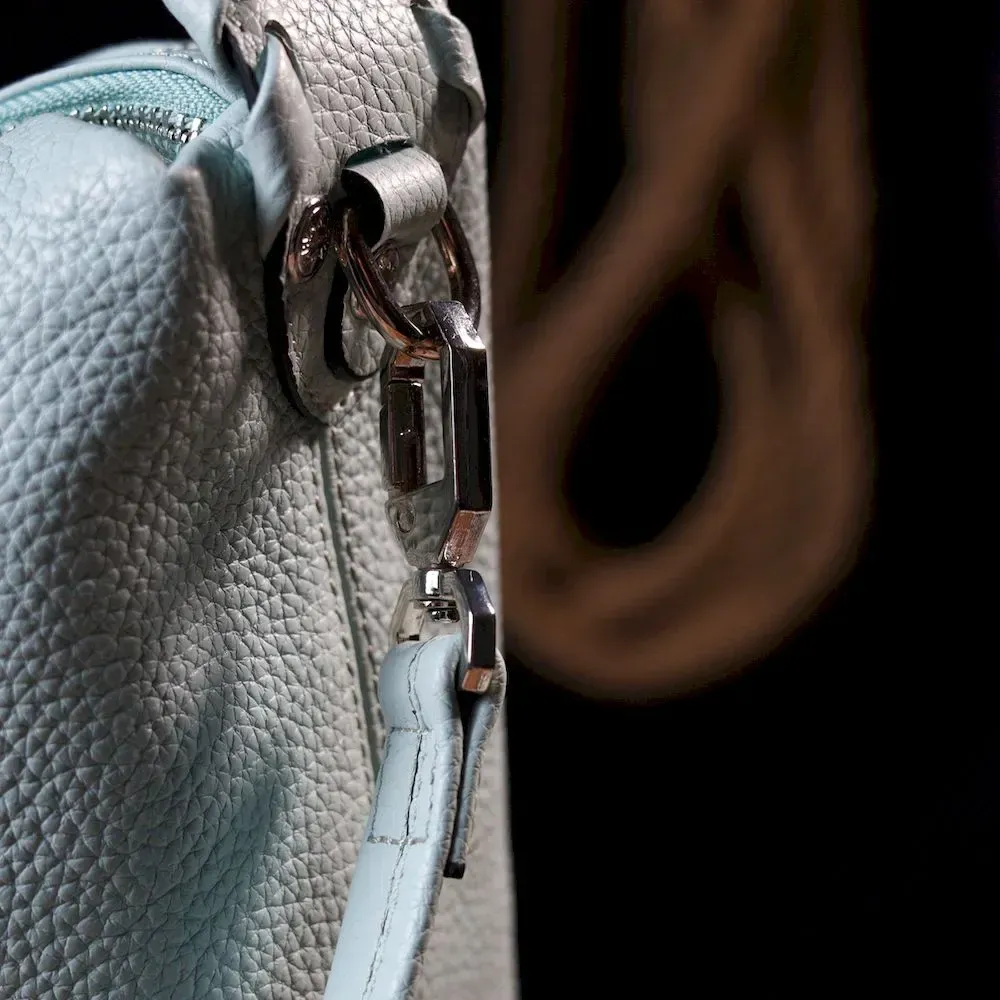 Красива містка жіноча сумка з натуральної зернистої шкіри, незвичайного блакитного кольору. Сумка практична та функціональна в експлуатації, якісна фурнітура сріблястого кольору не тільки доповнює стильний дизайн сумки, але й захищає виріб. Аксесуар упакований у фірмовий текстильний мішок Karya. Сумка з натуральної шкіри завжди буде чудовим подарунком будь-якій жінці.