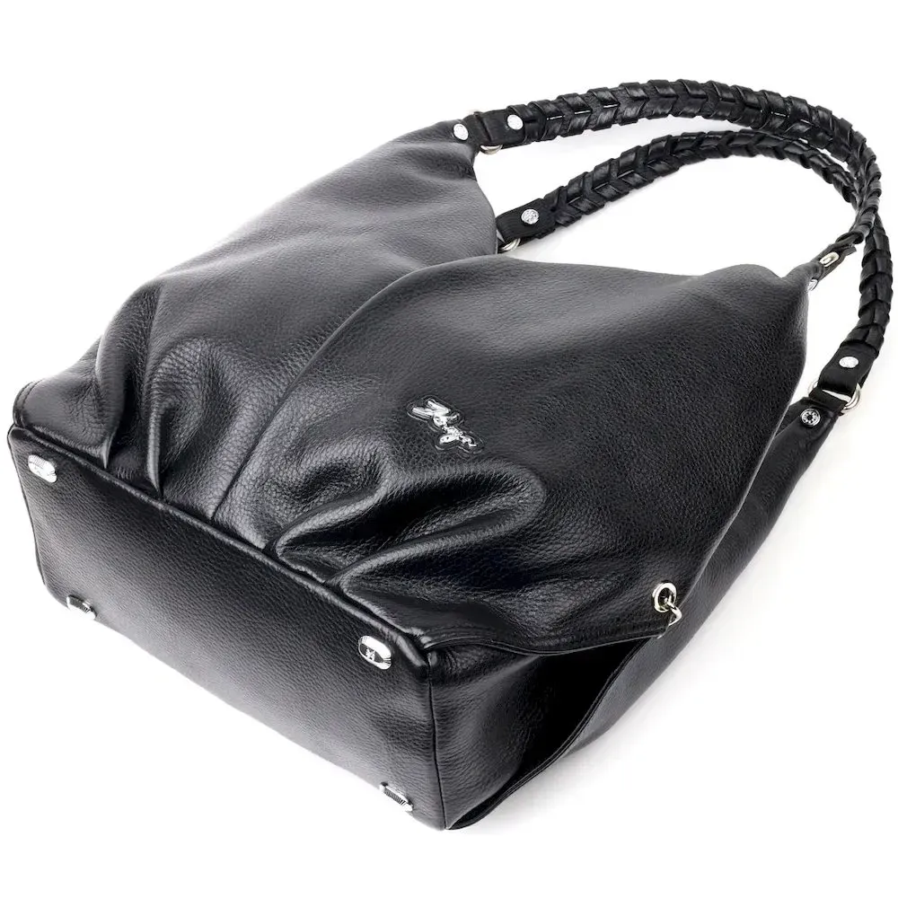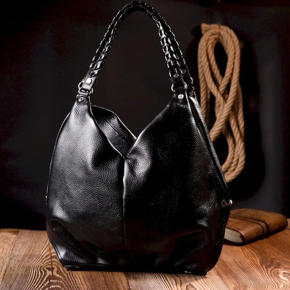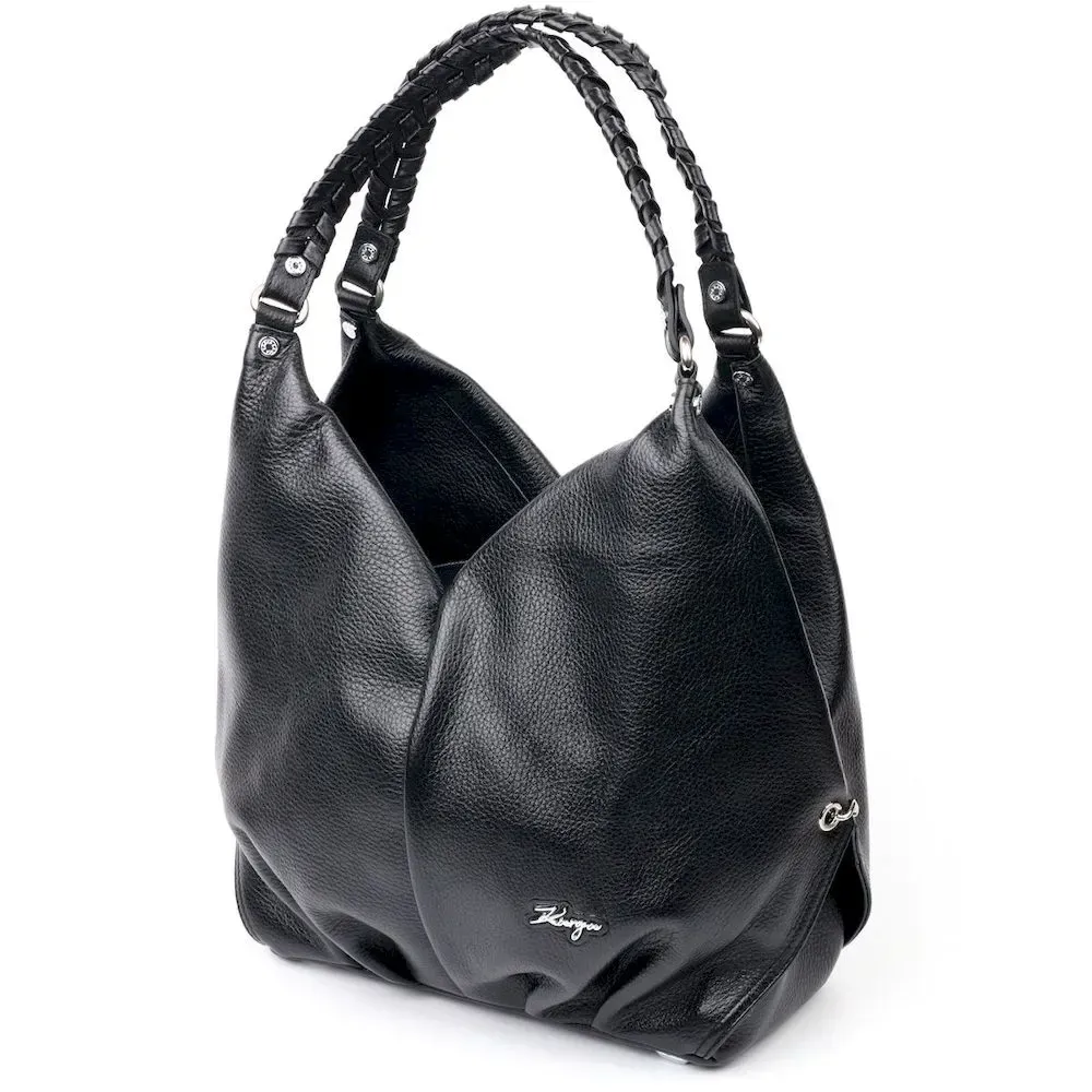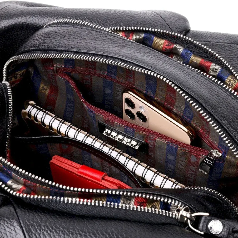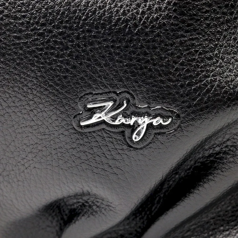 Практична жіноча сумка середнього розміру з натуральної шкіри, в оригінальному дизайні та класичному чорному кольорі. Фурнітура срібного кольору. Сумку зручно носити в руці, на плечі. Сумка упакована у фірмовий текстильний чохол Karya. Сумка з натуральної шкіри завжди буде чудовим подарунком будь-якій жінці.