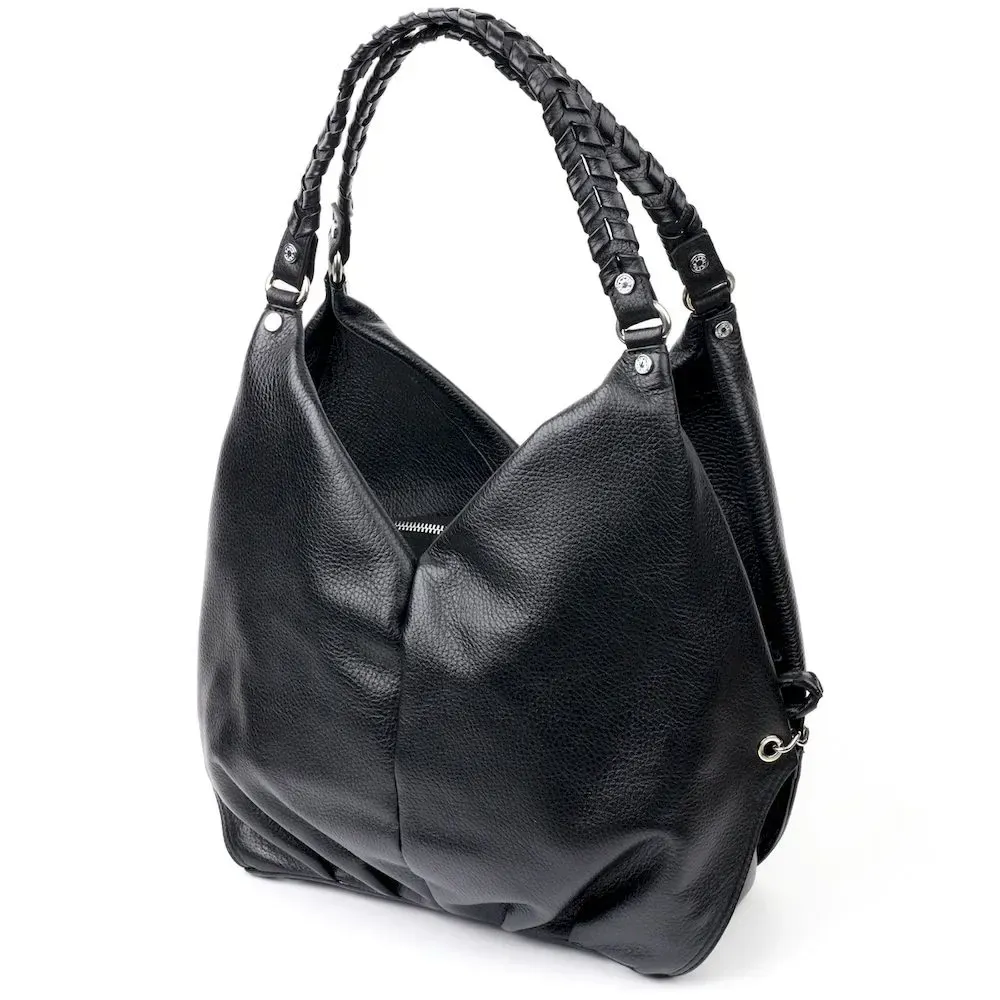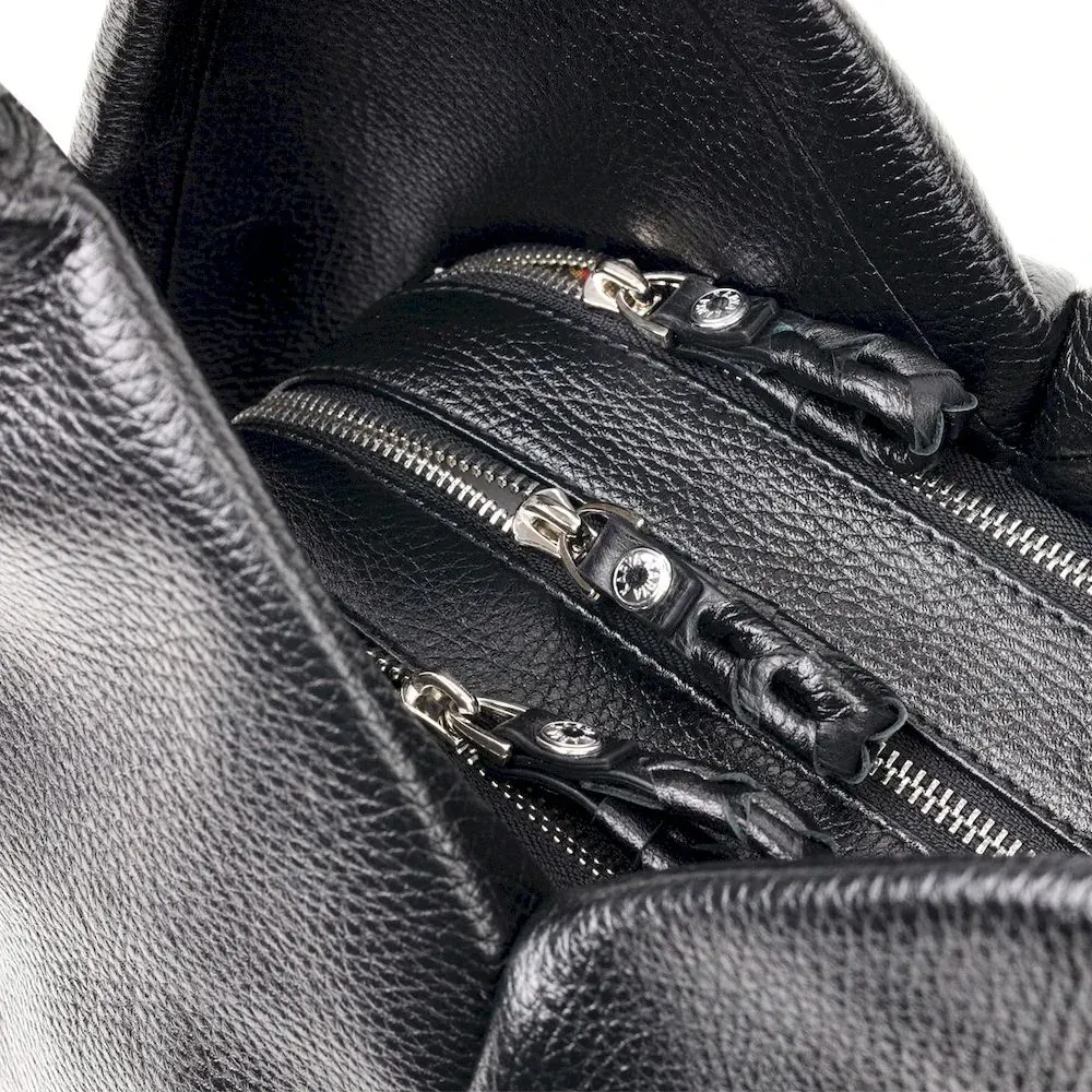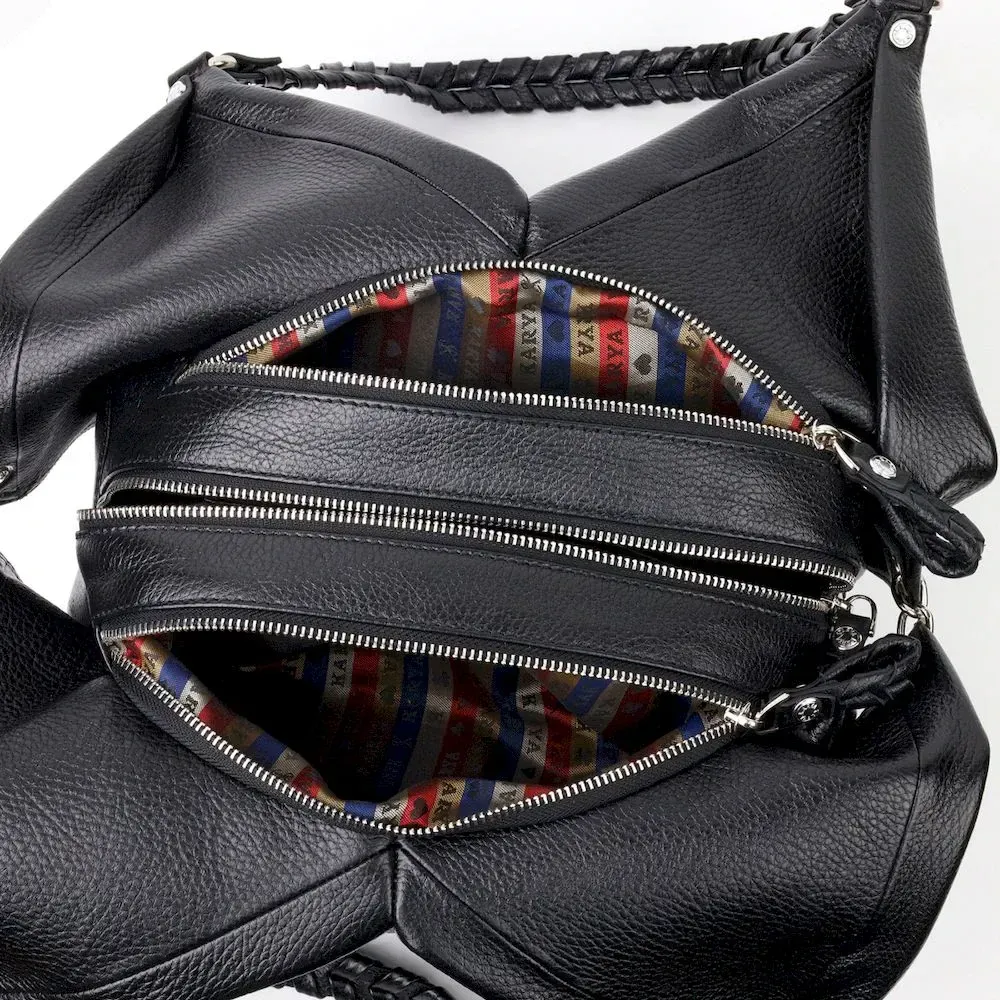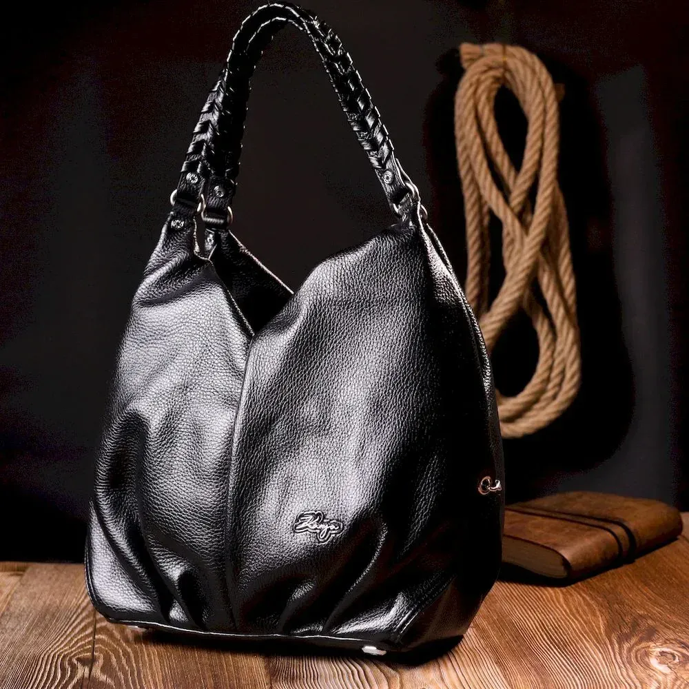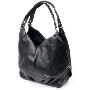 Практична жіноча сумка середнього розміру з натуральної шкіри, в оригінальному дизайні та класичному чорному кольорі. Фурнітура срібного кольору. Сумку зручно носити в руці, на плечі. Сумка упакована у фірмовий текстильний чохол Karya. Сумка з натуральної шкіри завжди буде чудовим подарунком будь-якій жінці.