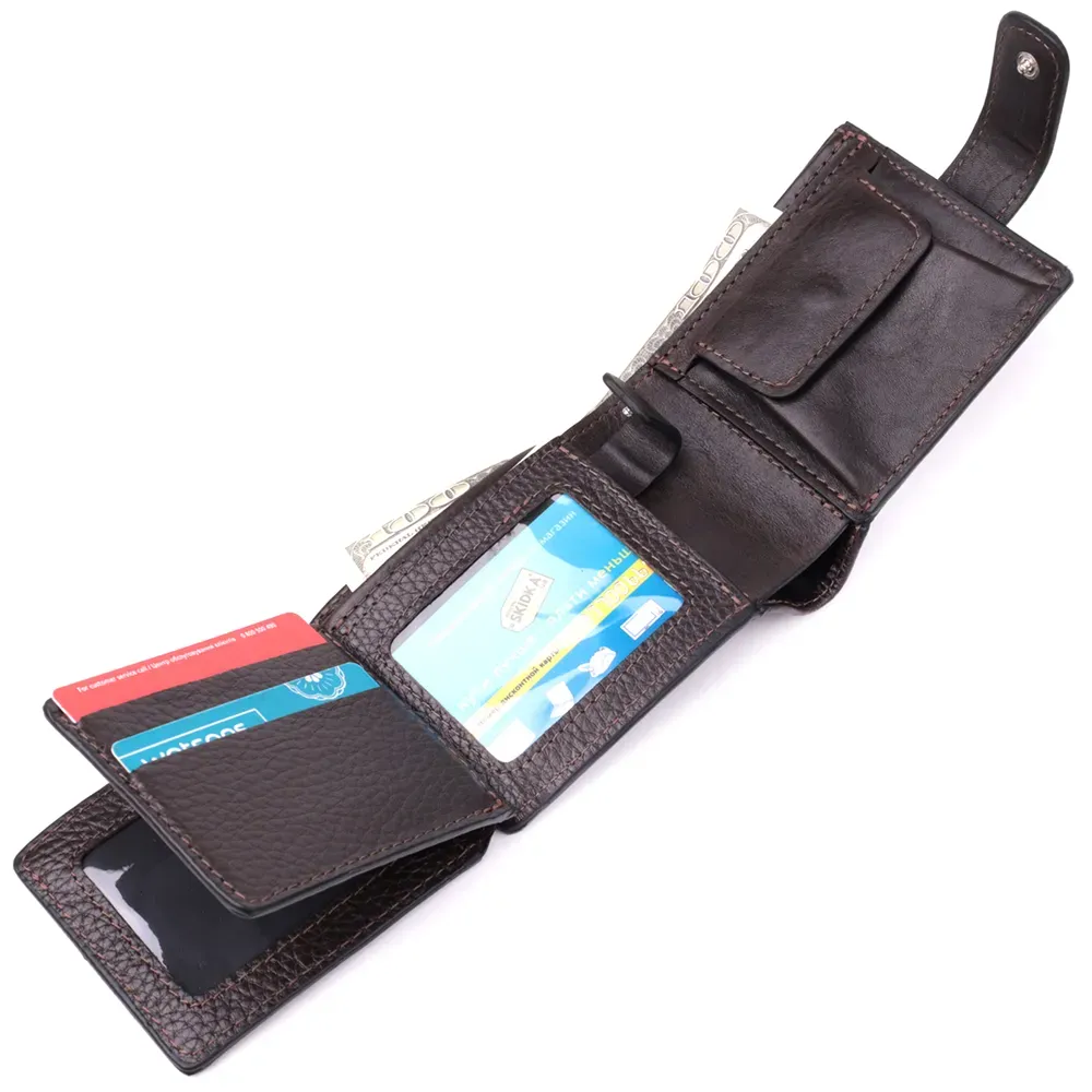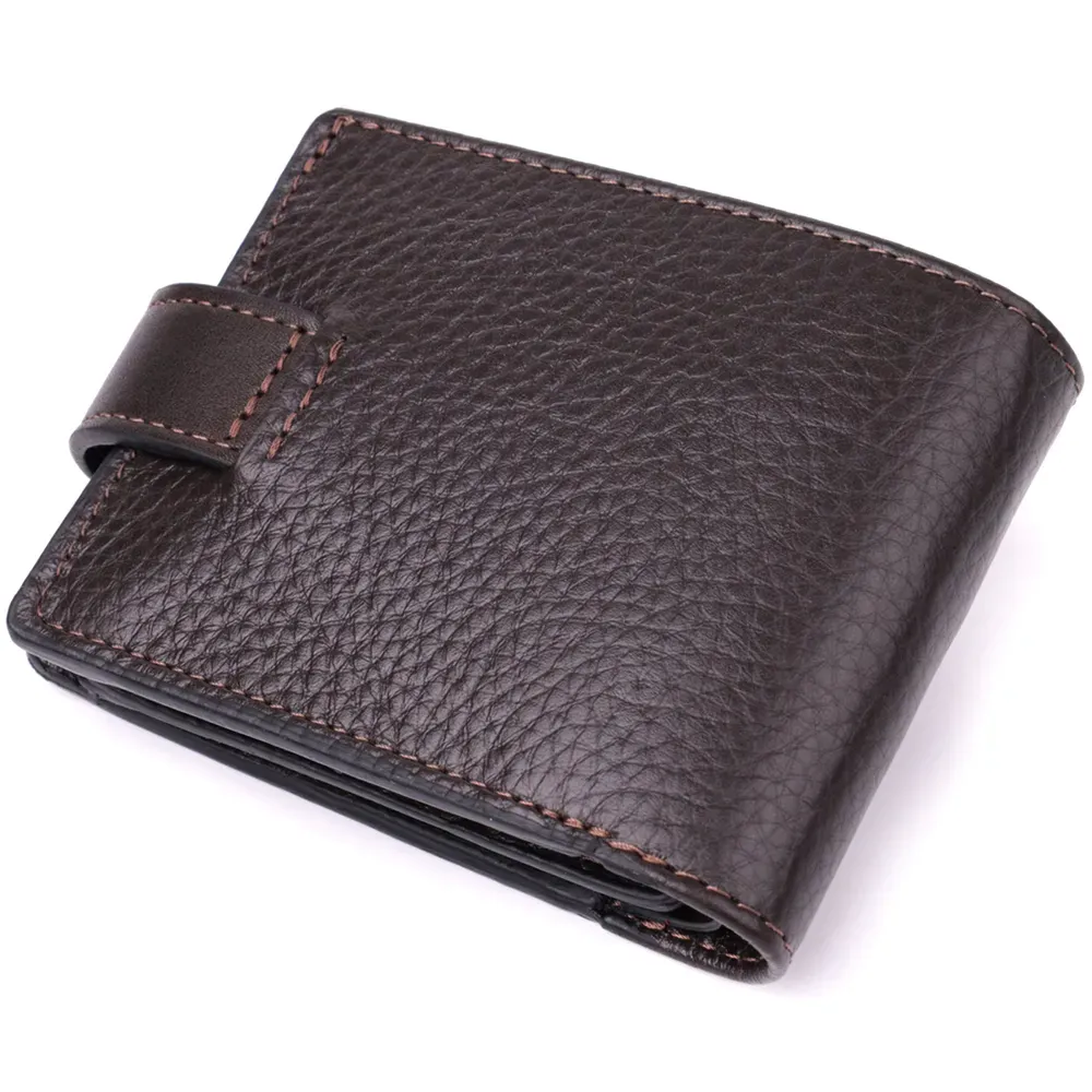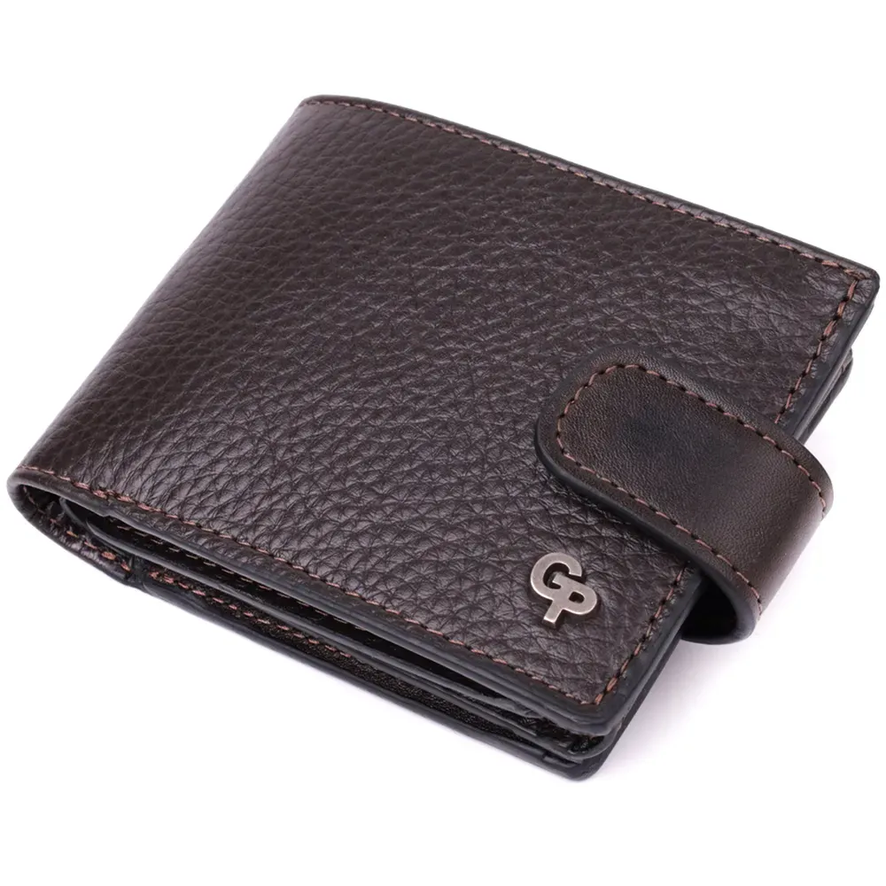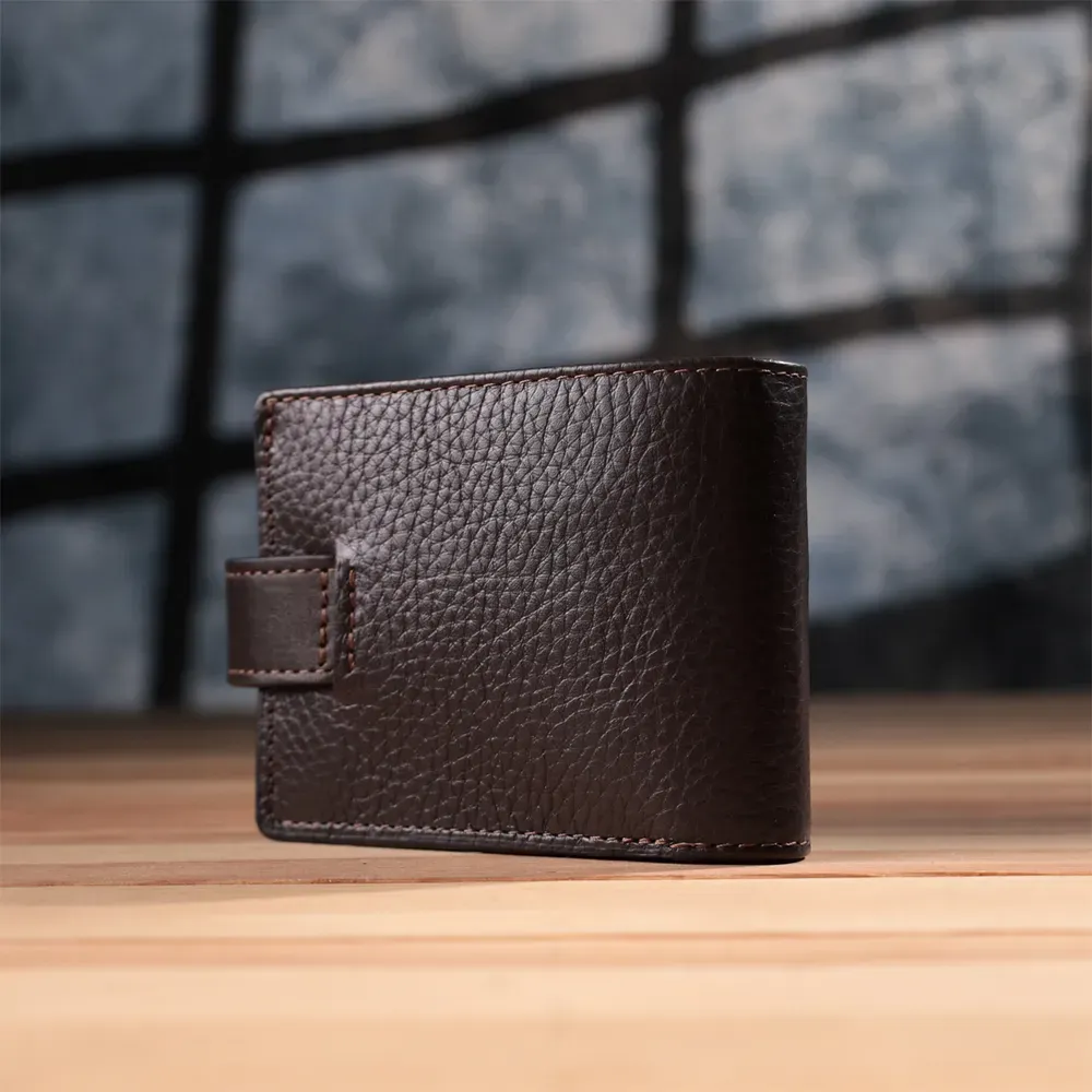 Містке портмоне для чоловіків з натуральної шкіри флотар зі вставками з гладкої шкіри. Портмоне у класичному стилі завжди залишається на піку популярності. Дизайн гаманця продуманий так, щоб він був максимально зручним та містким, при цьому залишаючись компактним. Аксесуар закривається на шкіряний хлястик із кнопкою. На лицьовій стороні, в правому нижньому кутку, розташований металевий логотип компанії виробника, що є запорукою високої якості. Виріб виконаний у коричневому кольорі з акуратним рядком, що підкреслює його елегантний зовнішній вигляд. Модель упакована у фірмову картонну коробку, яка може замінити подарункову упаковку. Портмоне стане чудовим рішенням для подарунка близькій людині.