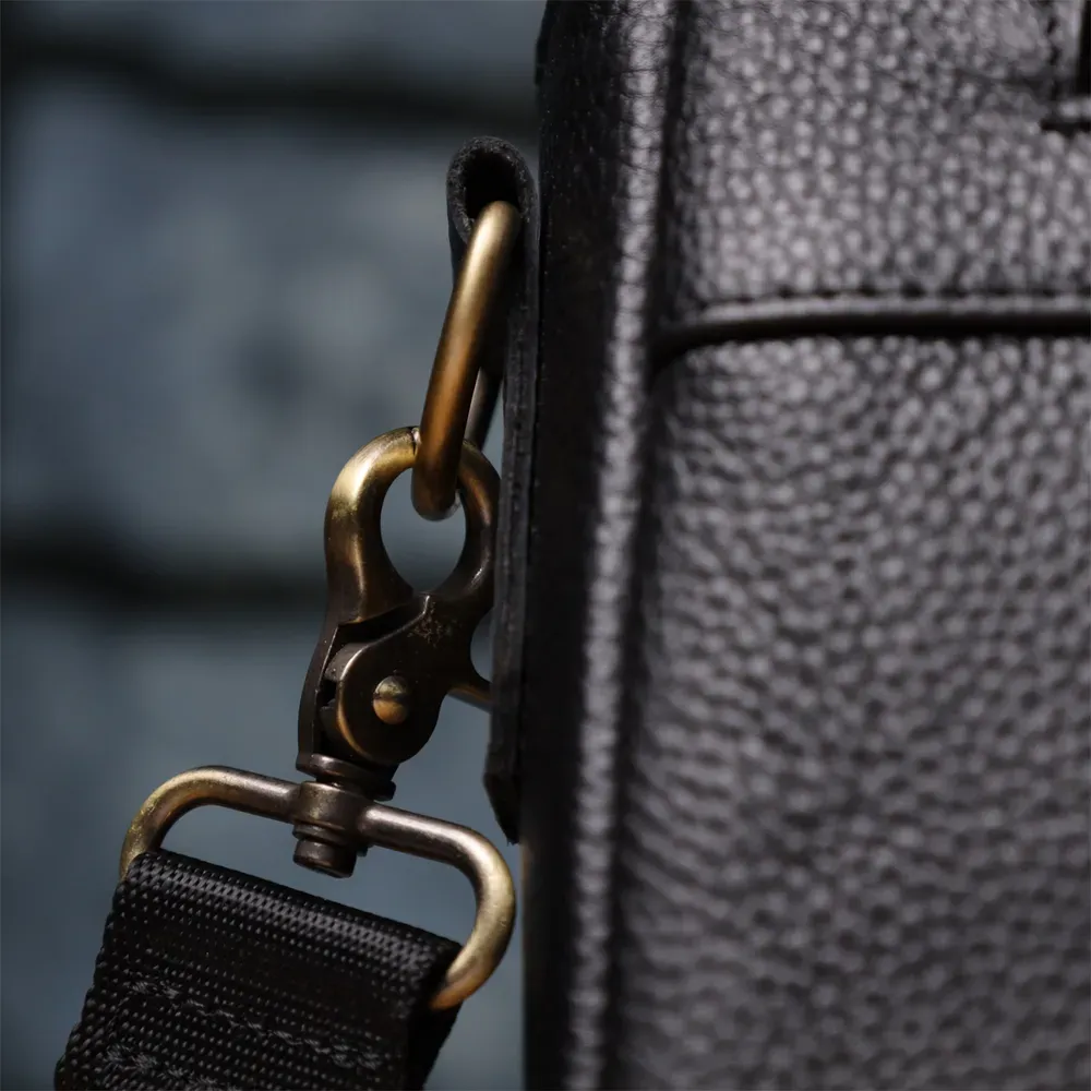 Фурнітура у відтінку "під латунь" надає моделі благородного акценту і підкреслює діловий характер. Для перенесення передбачені дві міцні шкіряні ручки, а також знімний регульований текстильний ремінець, який можна носити на плечі або через плече.