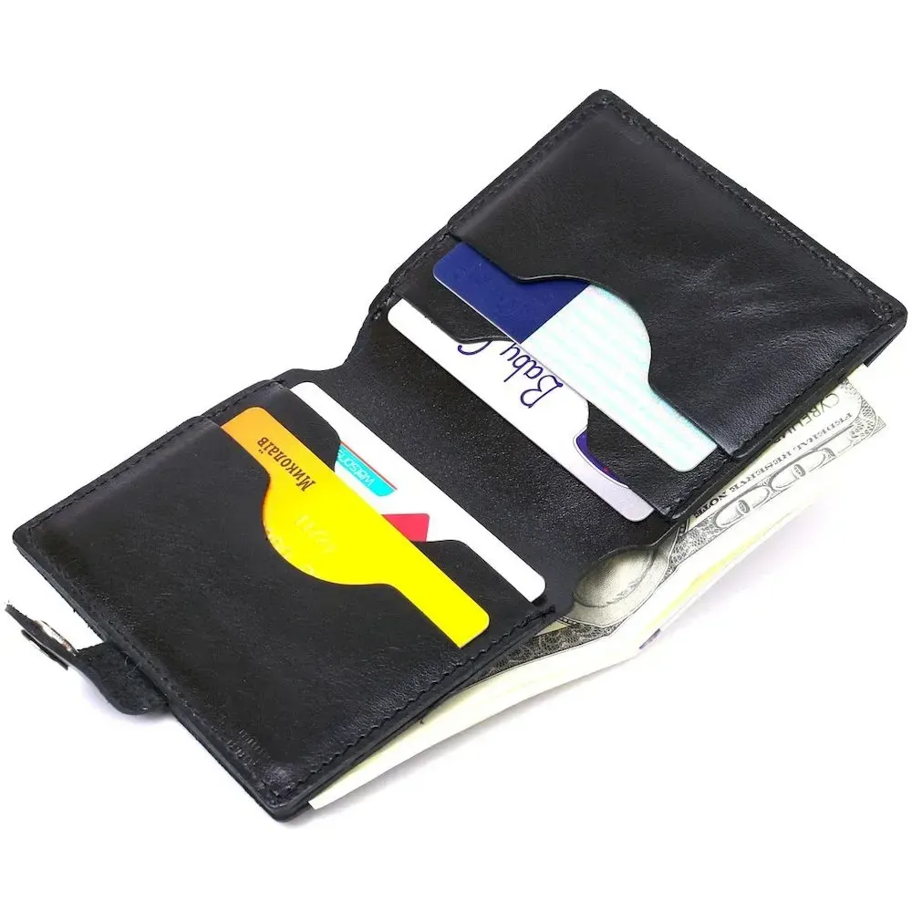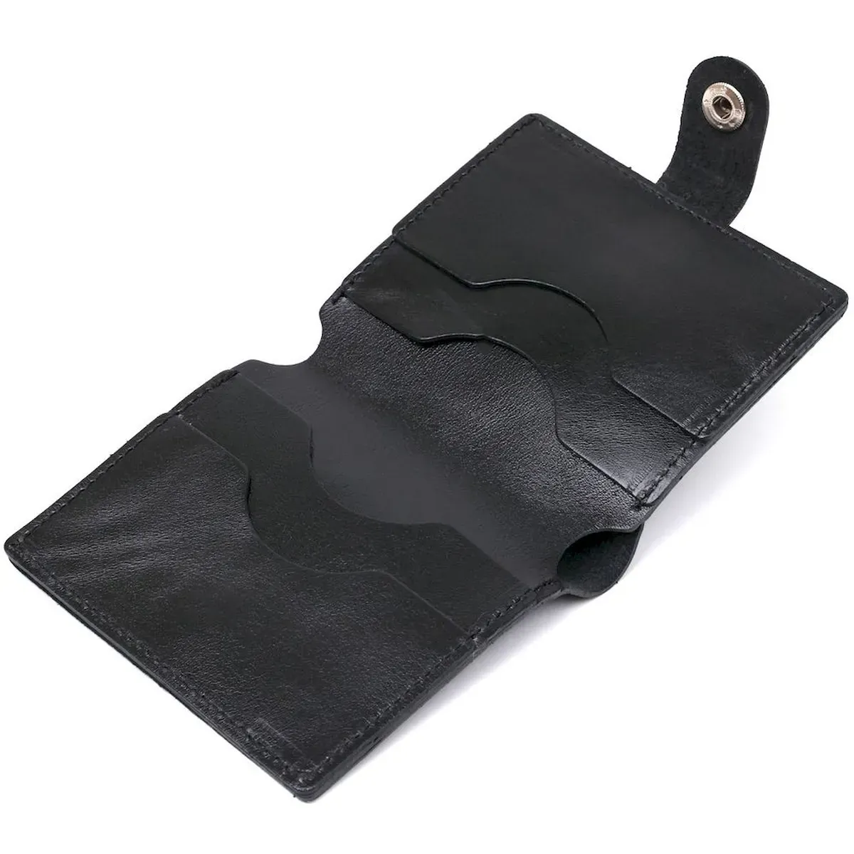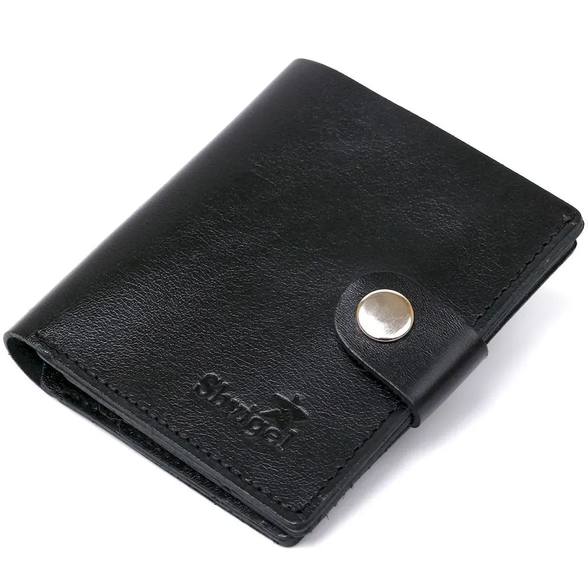 Красиве і практичне чоловіче портмоне у строгому лаконічному дизайні від українського виробника. Виконано з натуральної шкіри високого класу, якість якої видно неозброєним оком. Усередині є просторе відділення для купюр та слоти для пластикових карток. Колір аксесуара – класичний чорний з легким відливом, фактура – гладка.