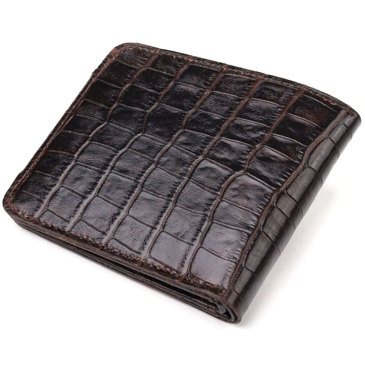 Гарний чоловічий гаманець з натуральної фактурної шкіри з тисненням під крокодила. Аксесуар має одне відділення для купюр, в яке розміщуються купюри всіх номіналів, чотири прилеглі кишені, кишеня на блискавці, на всю довжину гаманця, а також вісім відсіків для карток, один з них під сіточкою. Модель закривається хлястиком на кнопку. У сучасному світі шкіряне портмоне є просто необхідною річчю, а якісне шкіряне портмоне є ще й непоганим вкладенням грошей, оскільки прослужить не один рік.