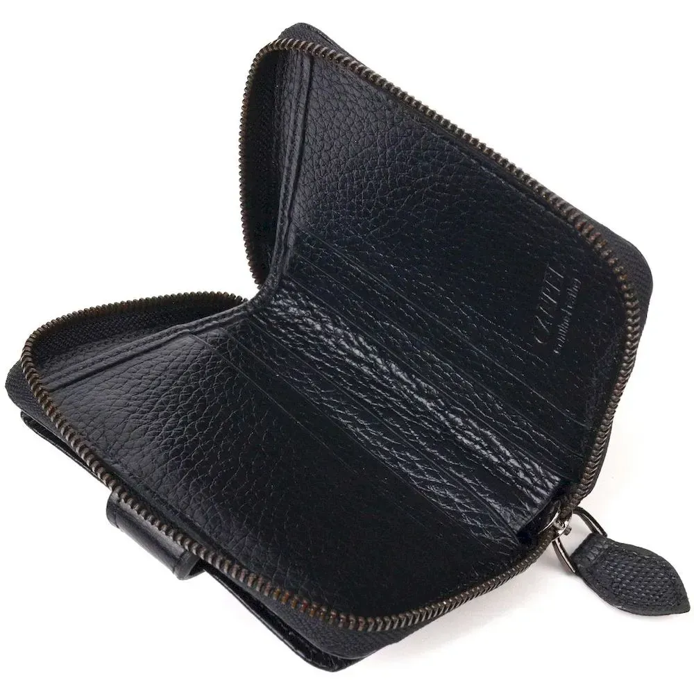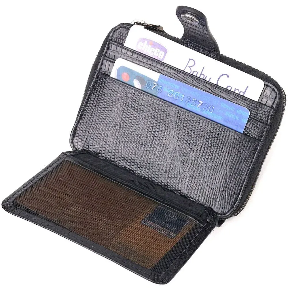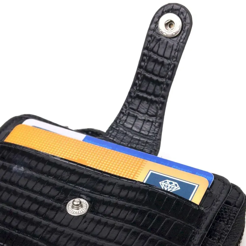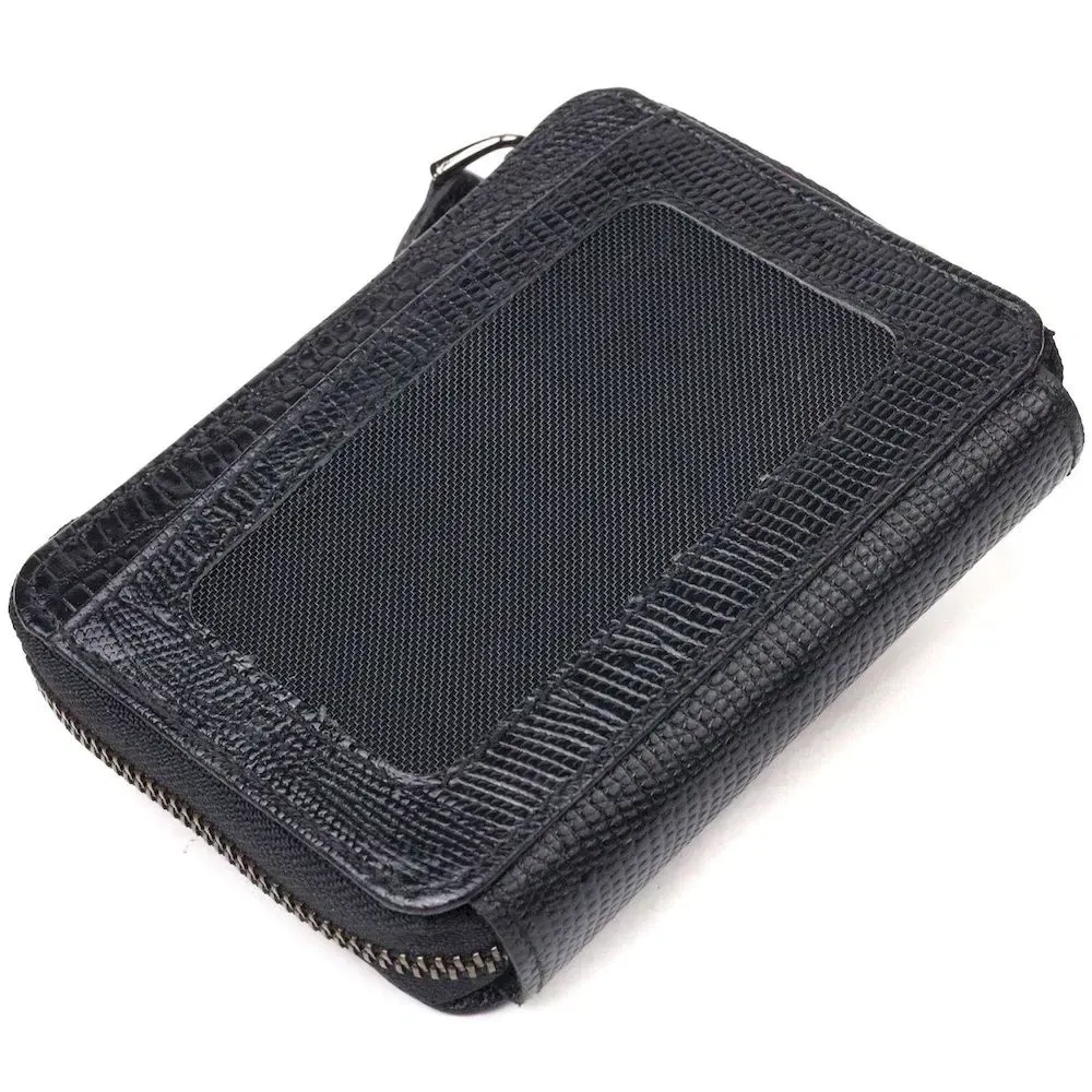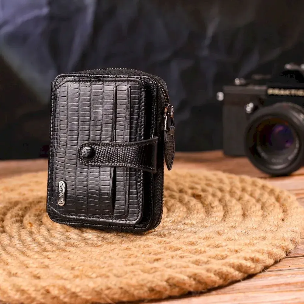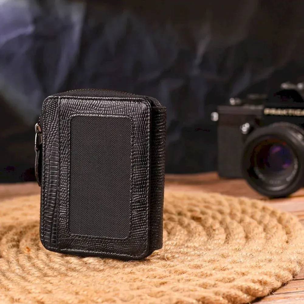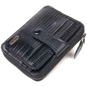Практичний гаманець для чоловіків та жінок, з натуральної фактурної шкіри, з тисненням під рептилію, у класичному чорному кольорі. Аксесуар має одне основне відділення, в яке поміщаються купюри всіх номіналів, одинадцять кишень для карток, одна з яких під сіточкою, блок для карт із зовнішнього боку, а також кишеня для пропуску під сіточкою з лицьового боку. Закривається аксесуар на блискавку, а блок для карток хлястиком на кнопку. Колір фурнітури – темне срібло. Шкіряний гаманець є дивовижним подарунком на всі випадки життя.