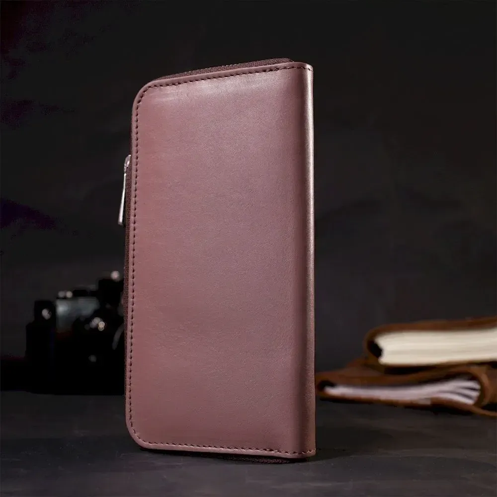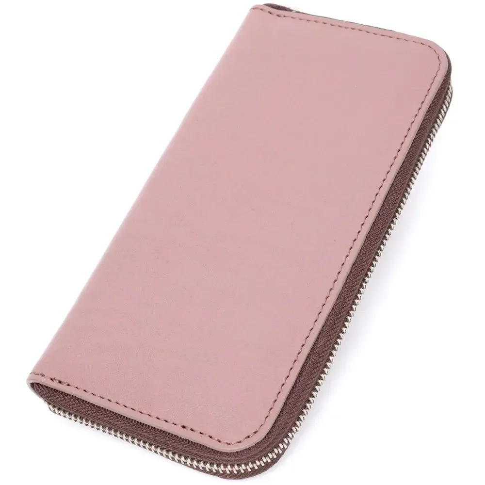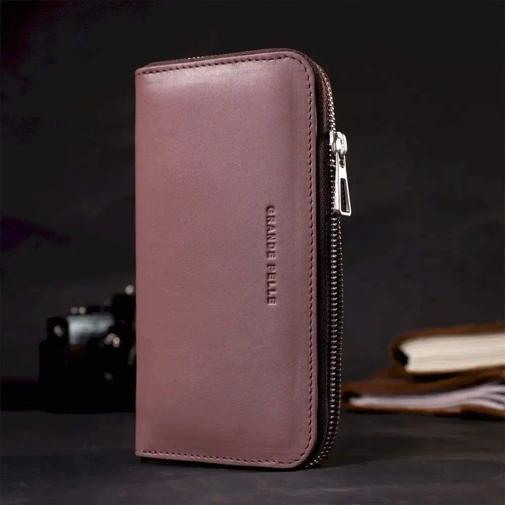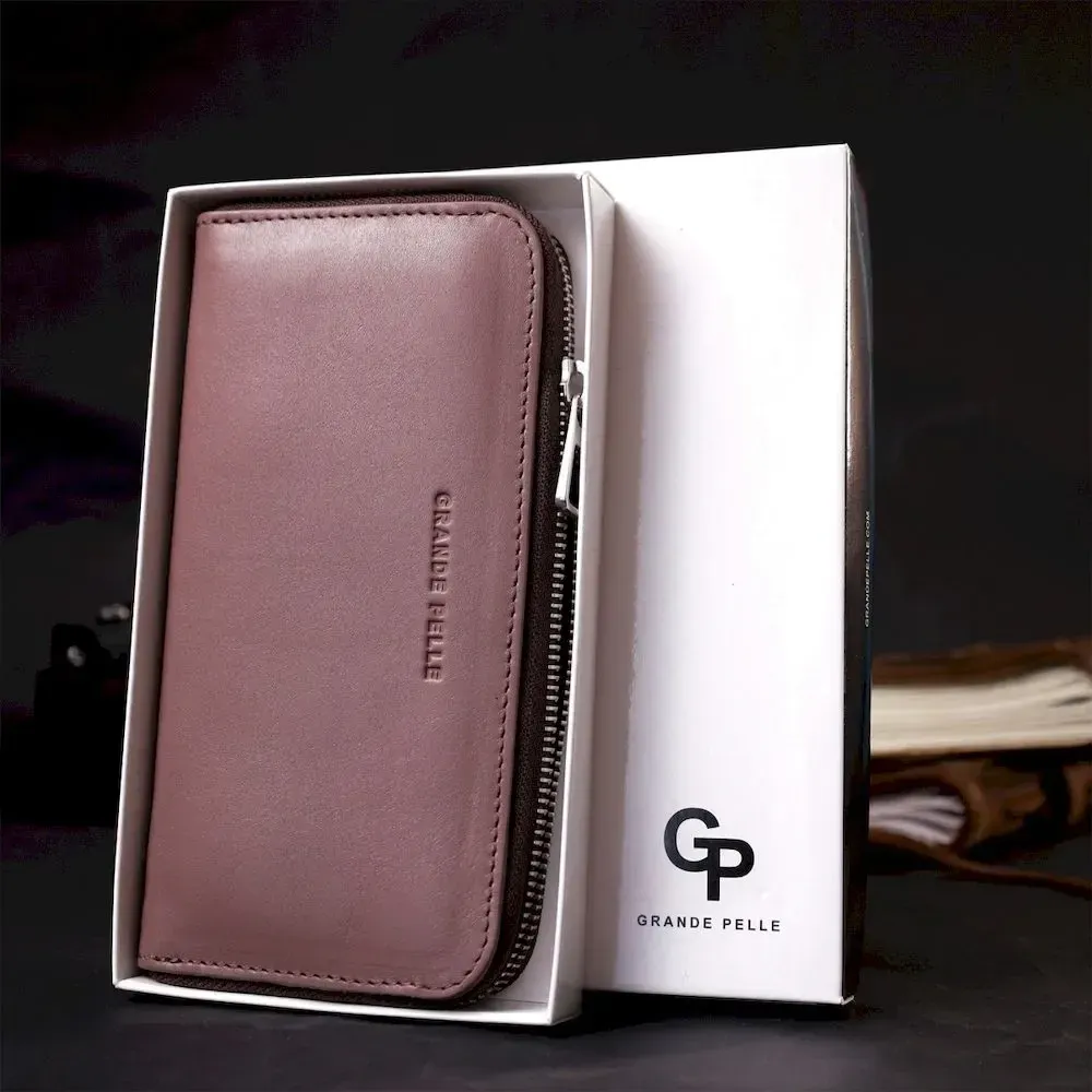 Зручний та місткий гаманець на блискавці з натуральної високоякісної шкіри. Має гарний пудровий колір та гладку фактуру. Внутрішнє наповнення добре продумане та практичне, в ньому розмістяться купюри, монети, різні картки і навіть смартфон. Запакований цей гаманець у фірмову картонну коробку з логотипом бренду. Ми впевнені, що вироби української фірми Grande Pelle нікого не залишать байдужими, і Ви ще не раз повернетесь за цими якісними шкіряними аксесуарами.
