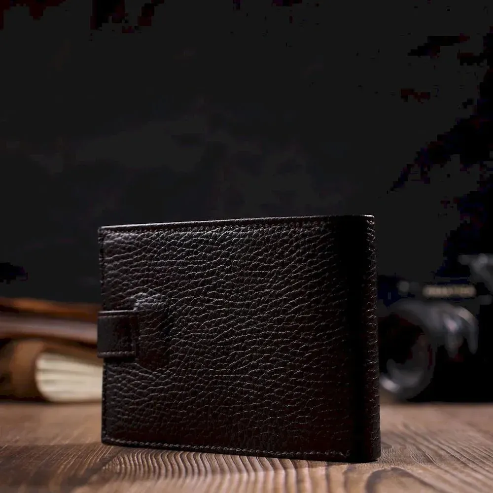 Незамінний для чоловіків аксесуар - гаманець середнього розміру, горизонтального типу, виконаний із добротної натуральної шкіри. У цей аксесуар чудово поміщаються купюри всіх номіналів. Виріб складається з трьох відділень для купюр, шести осередків для кредиток, чотирьох прихованих кишень, монетниці та трьох відділень під сіткою під документи. Закривається гаманець навпіл шкіряним хлястиком на кнопку. Вироби з натуральної шкіри завжди будуть чудовим подарунком для близької людини.