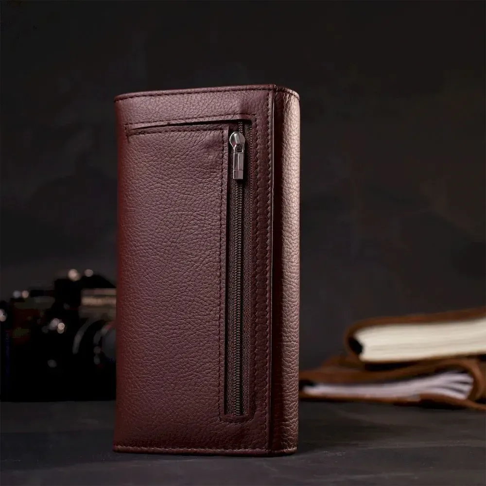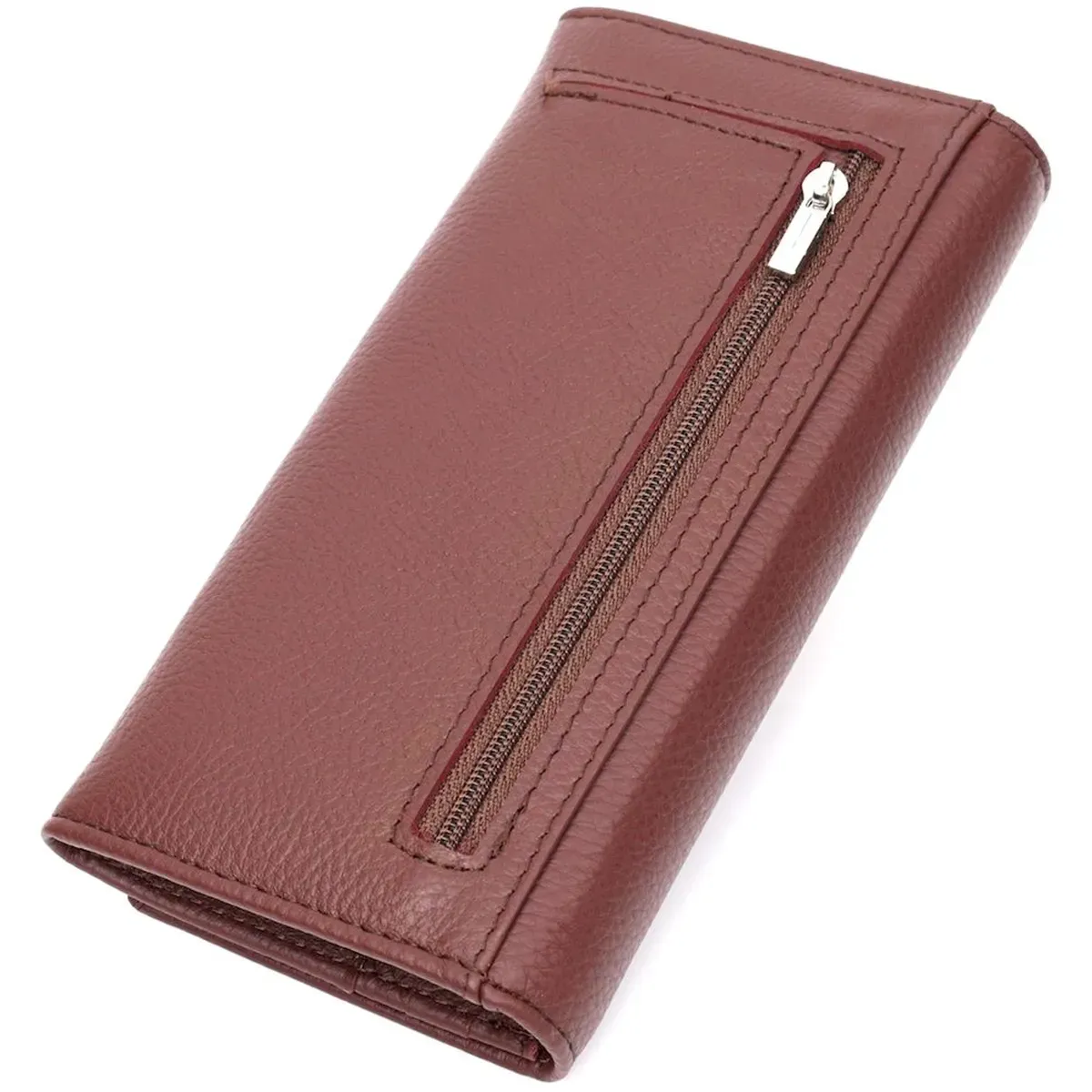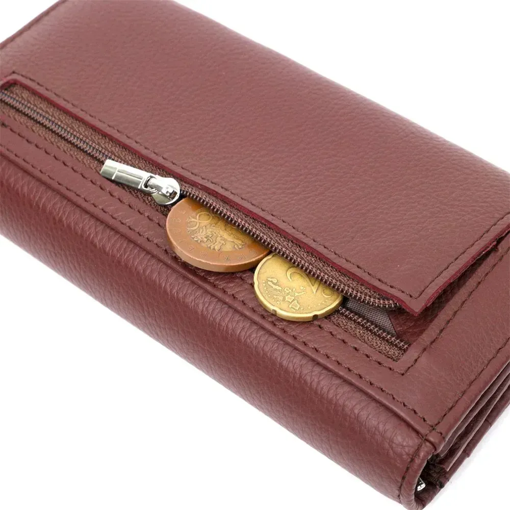 Розкішний жіночий гаманець у красивому та жіночному кольорі. Виконаний із добротної натуральної шкіри, що має м'яку зернисту фактуру. Аксесуар складається з трьох відділень для купюр, двох кишень на блискавках, десяти слотів для карток, двох прозорих відділень, прилеглої кишені та монетниці з розширювачем зовні. Упаковка – біла фірмова коробка.