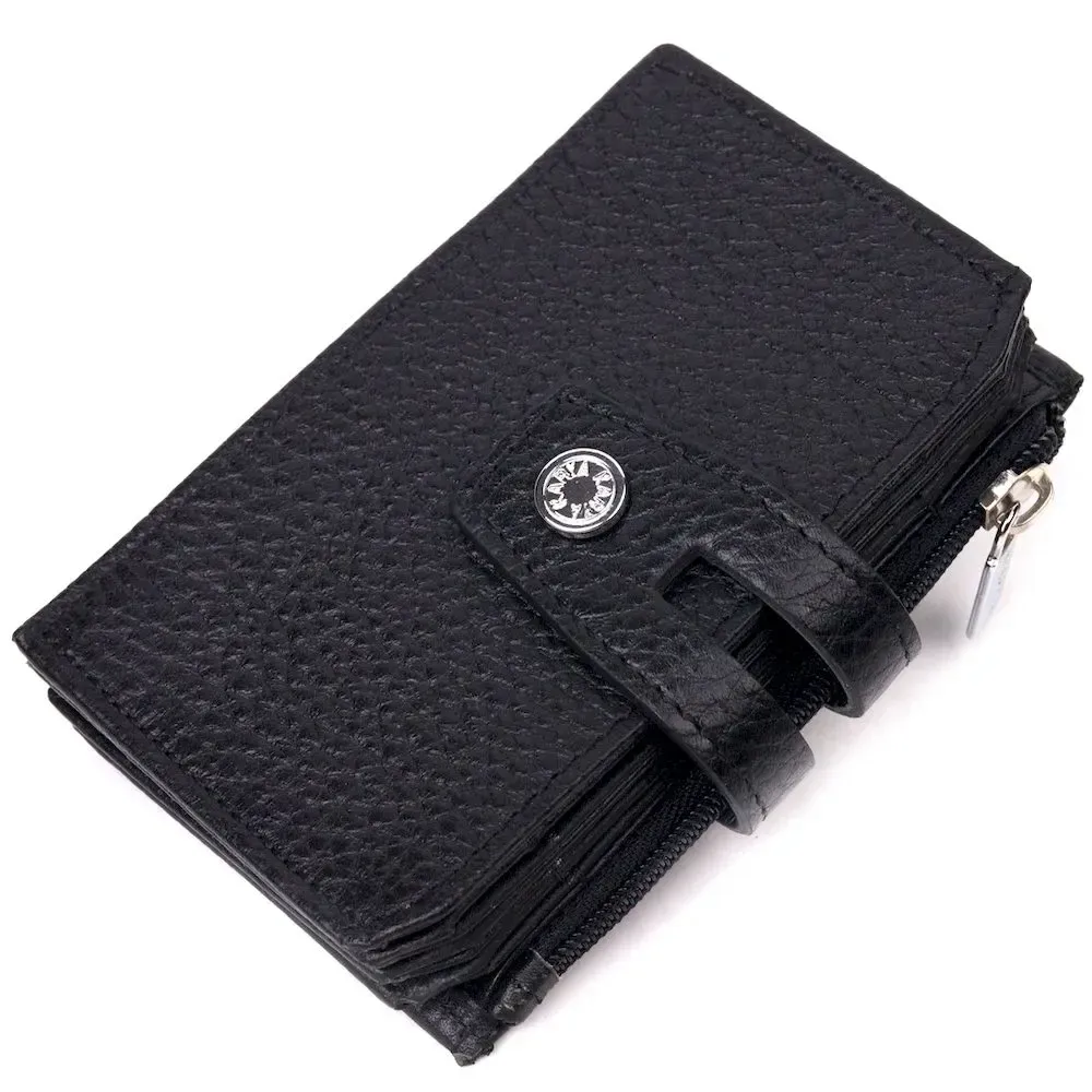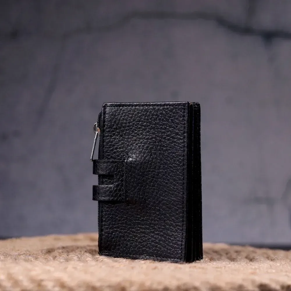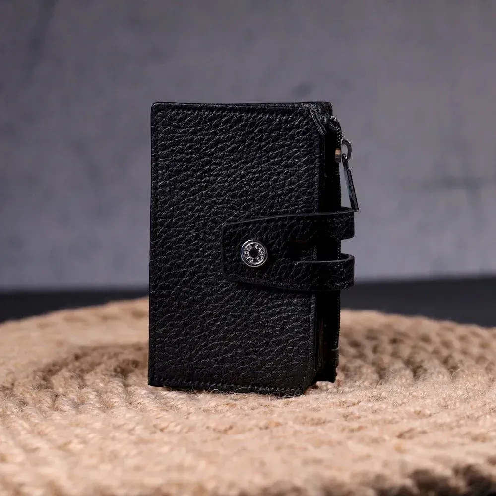 Практичний картхолдер із натуральної зернистої шкіри у класичному чорному кольорі. Виріб має чотири відділення з розширювачем для карток та монетницю що закривається на блискавку. Аксесуар упакований у фірмову коробочку. Вироби з натуральної шкіри завжди будуть чудовим подарунком для близької людини.