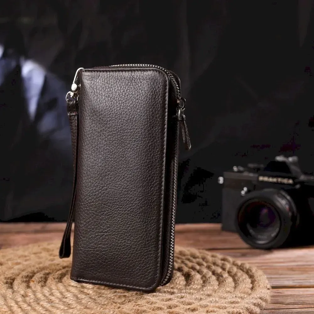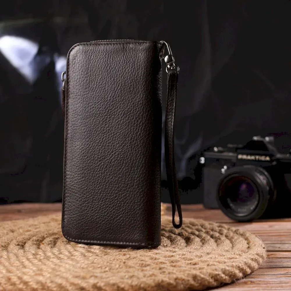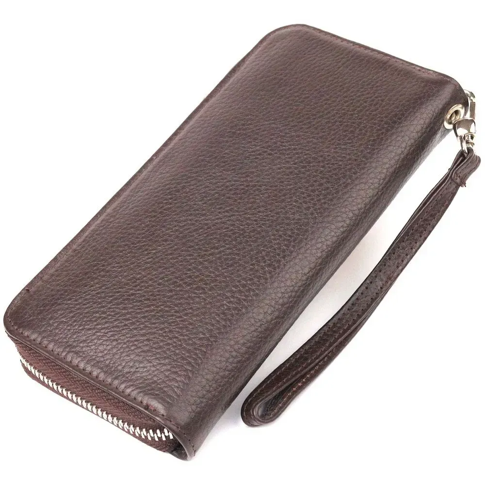 Місткий жіночий гаманець, з натуральної шкіри. Аксесуар має три основні відділення, в які поміщаються купюри всіх номіналів, дві перегородки, одна з них на блискавці, вісім кишень для карток, дві прилеглі кишені та знімний кистьовий ремінь. Закривається аксесуар на блискавку. Відмінний аксесуар, надійного виробника, який прослужить дуже довго.